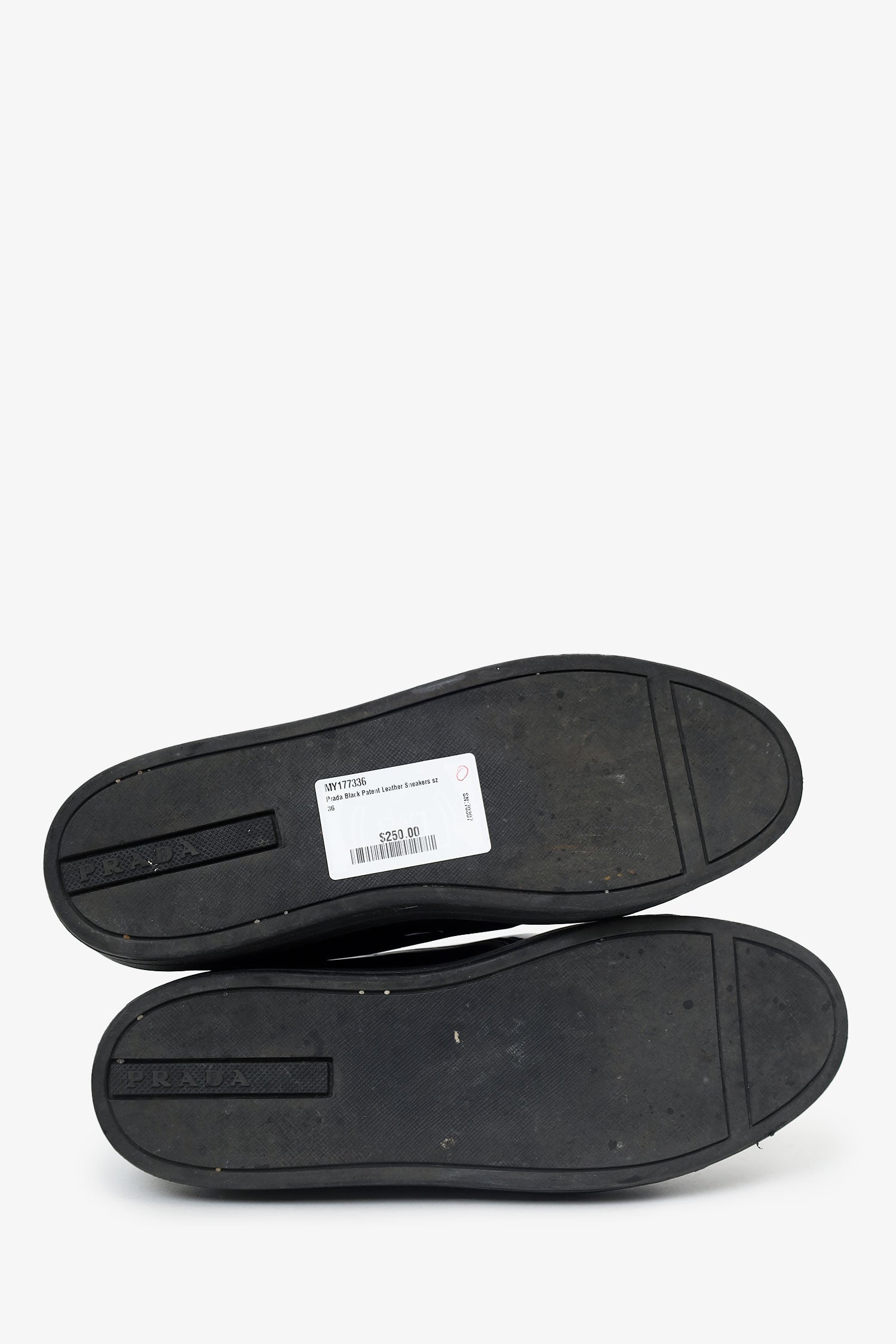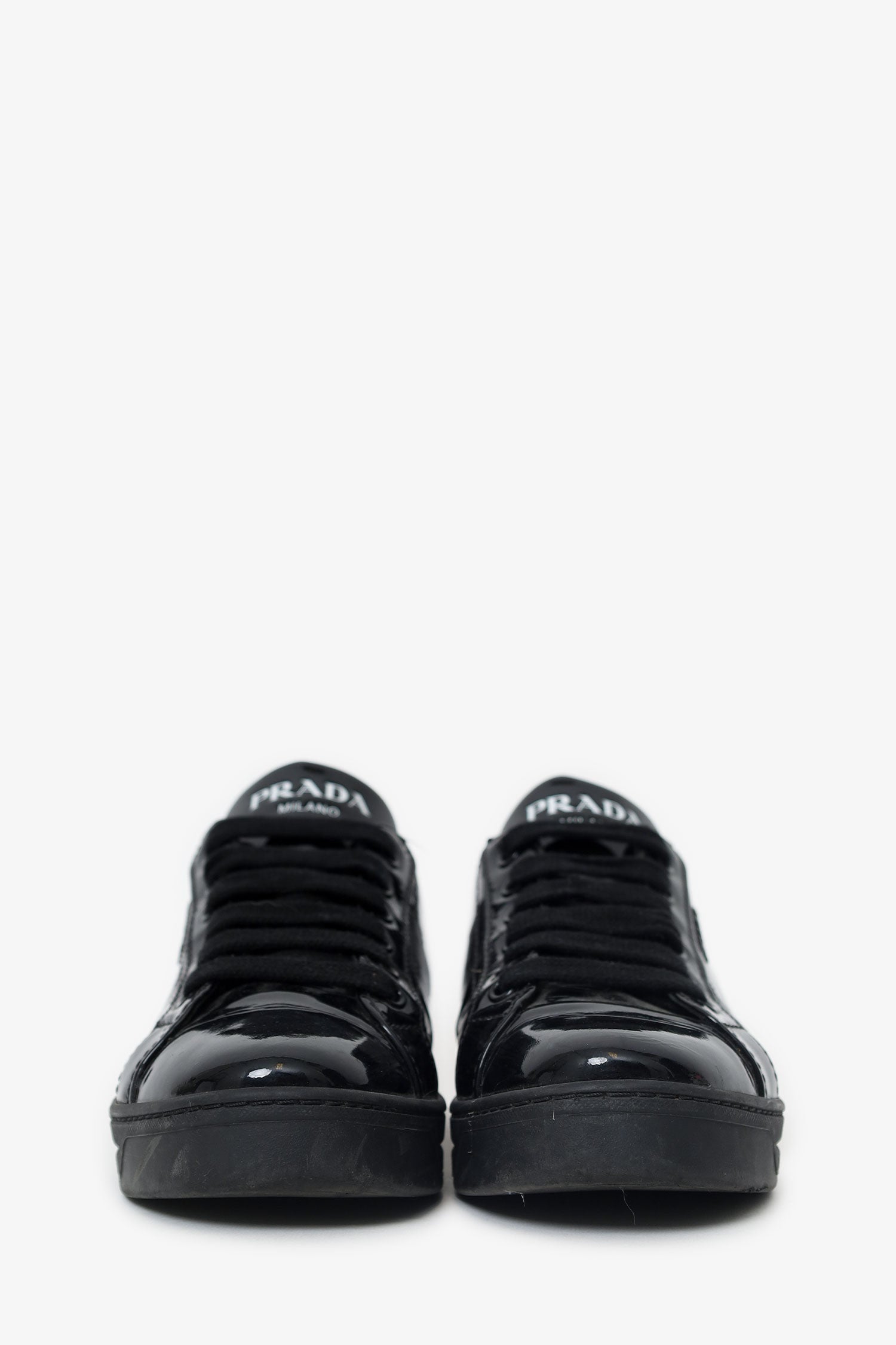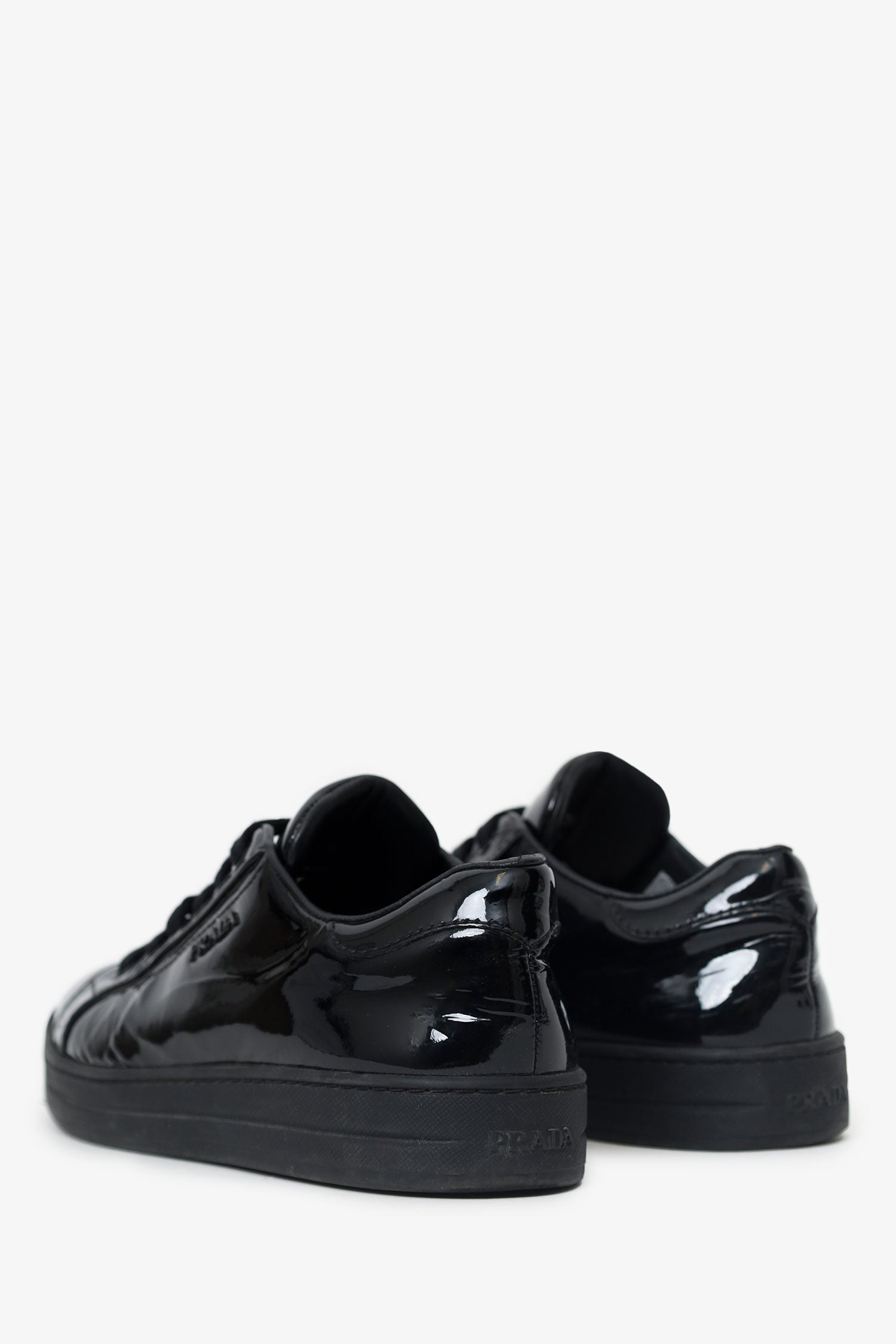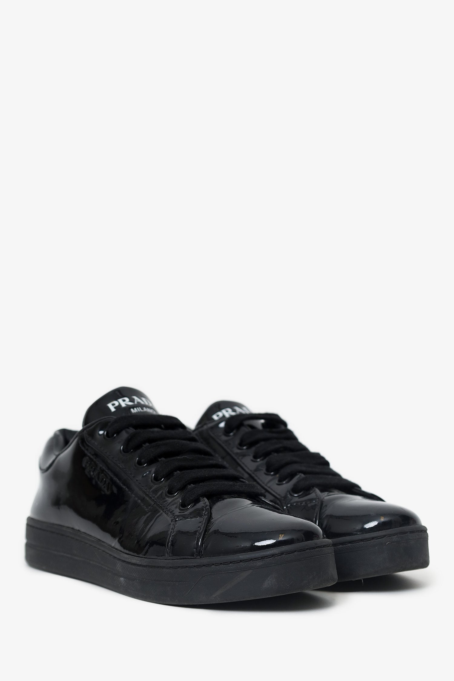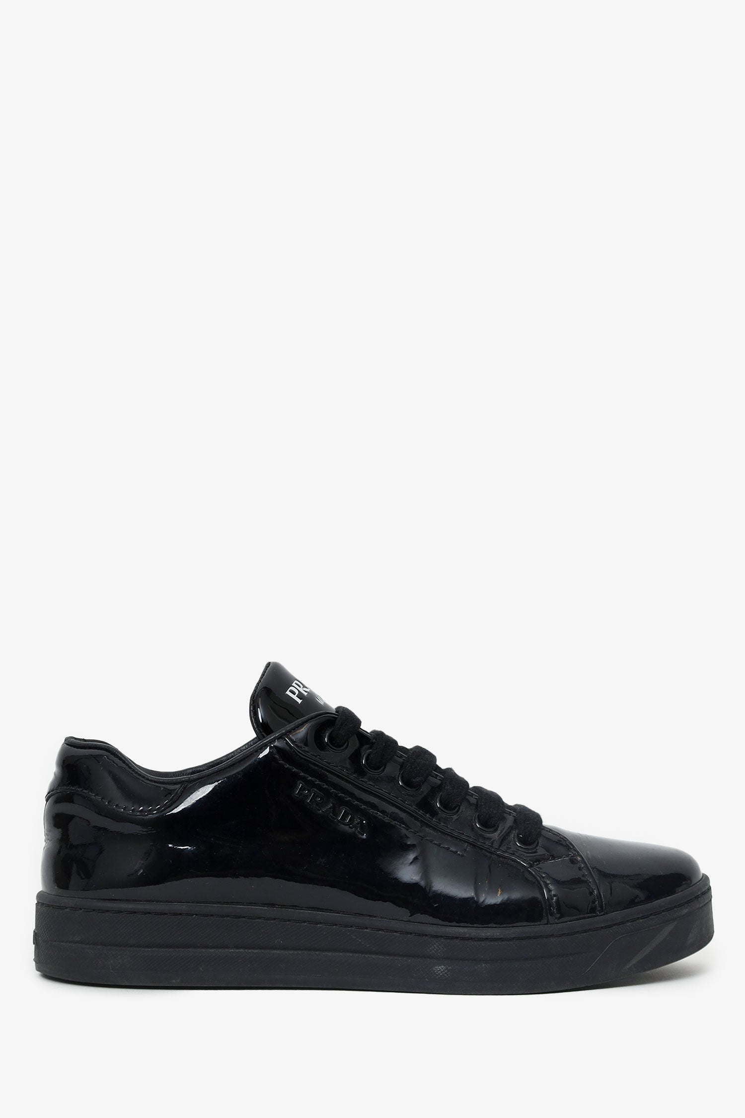 Refresh availabilityPrada Black Patent Leather Sneakers. Slip-on. Front lace-up closure. Logo detail to shoe tongue and side. Rounded toe. Tonal stitching.