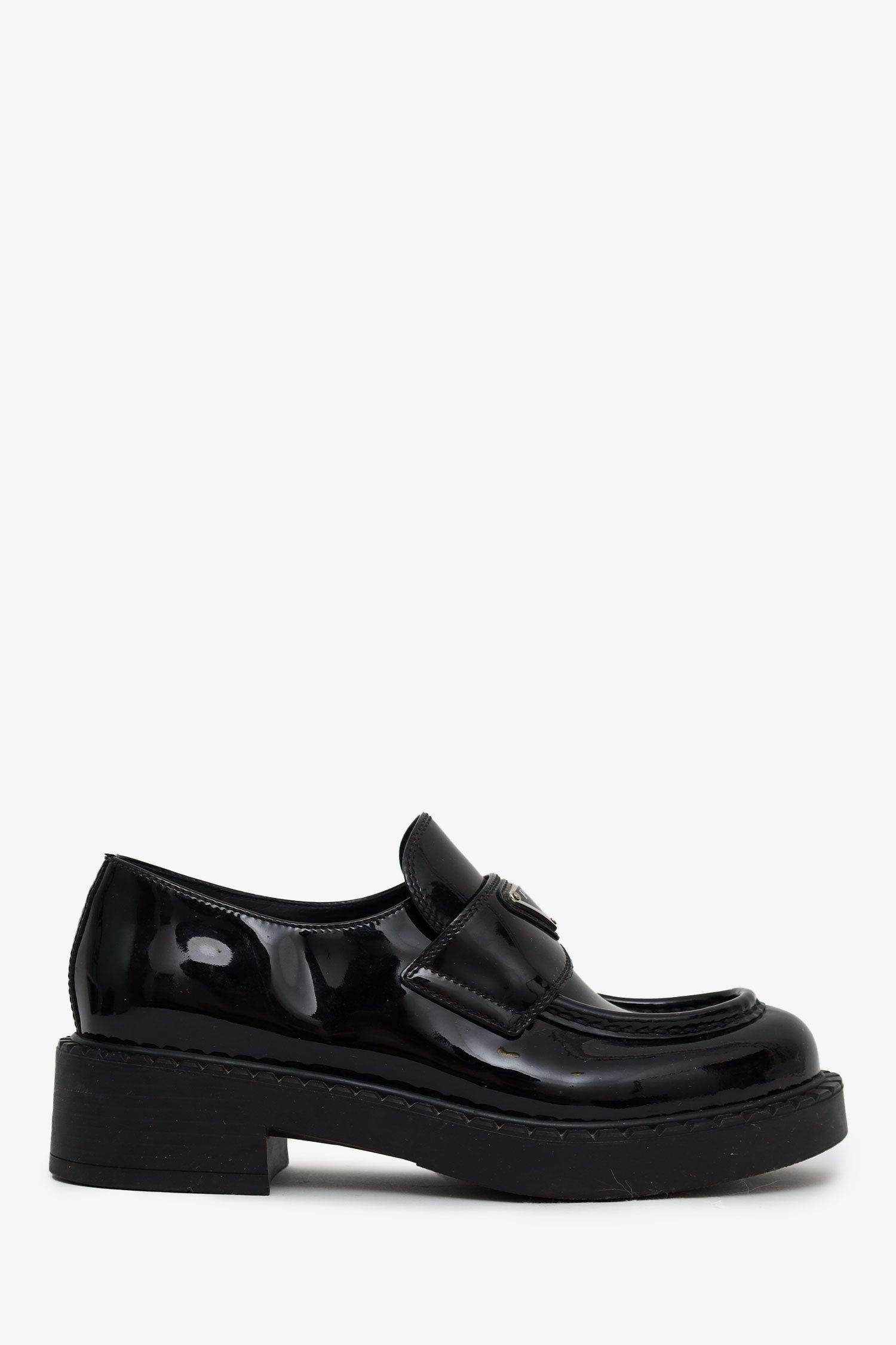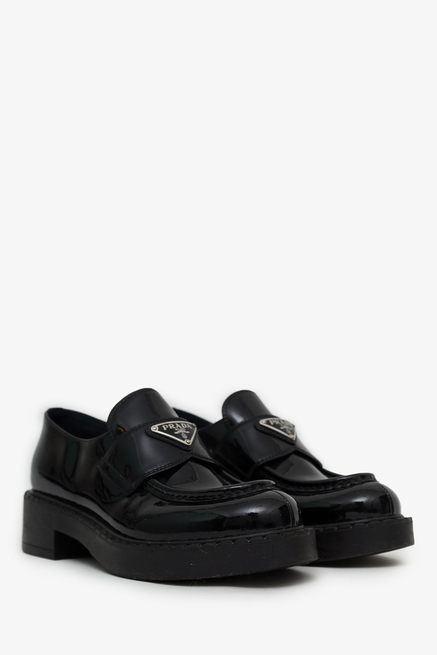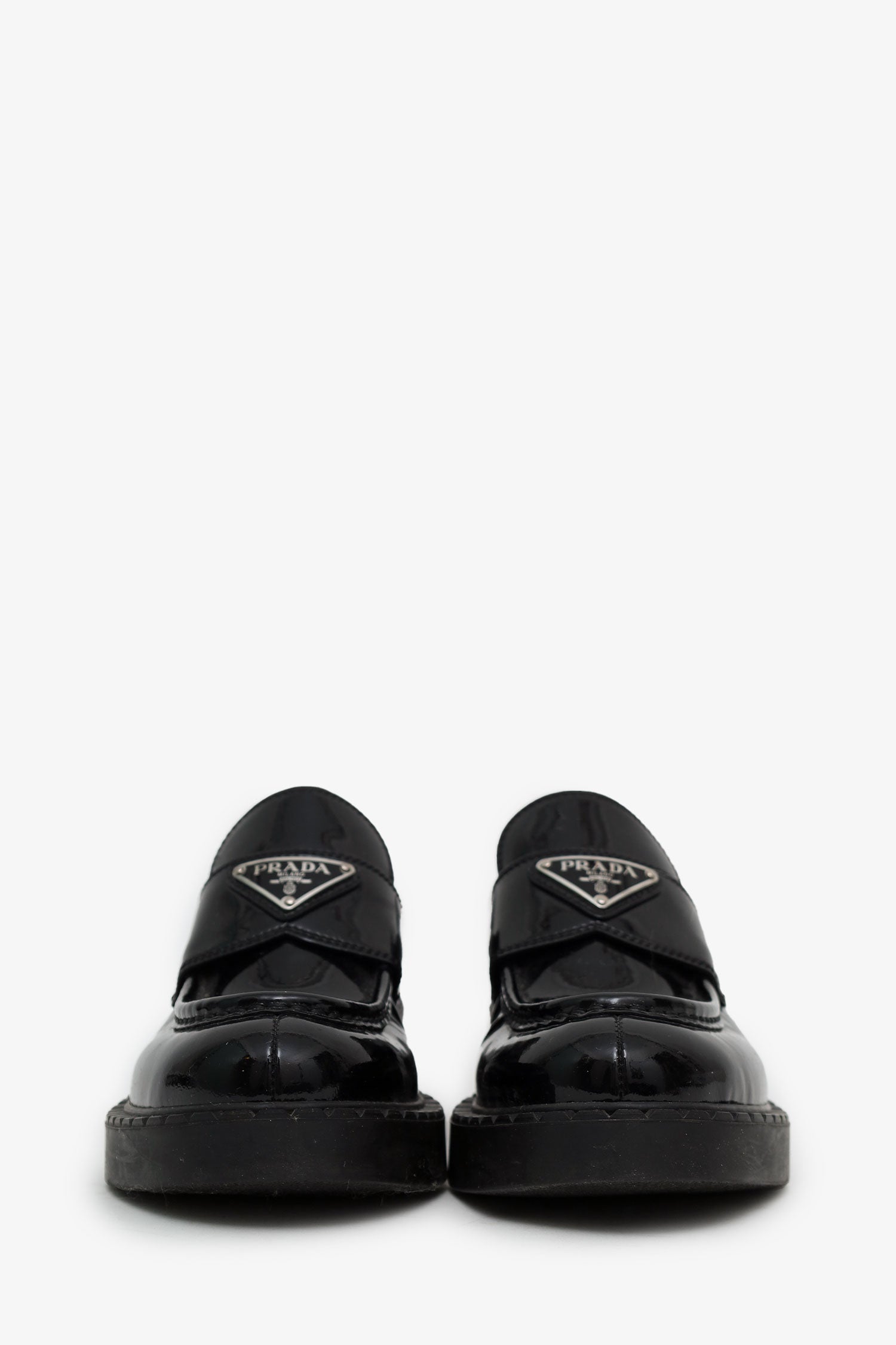 Refresh availabilityPrada Black Patent Leather Triangle Logo Loafers. Round toe. Block heel. Leather-lined interior. Silver-tone hardware. Tonal stitching.