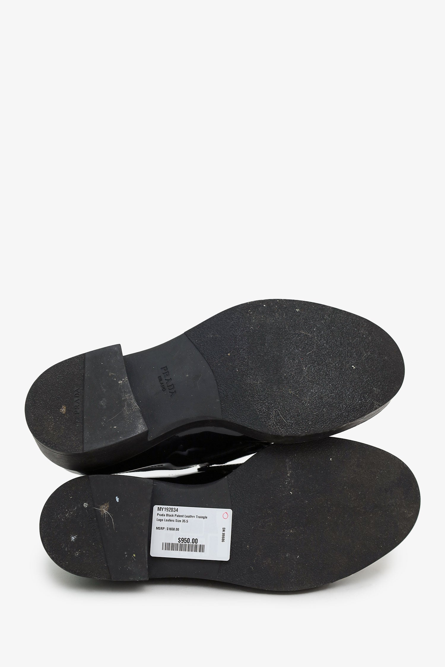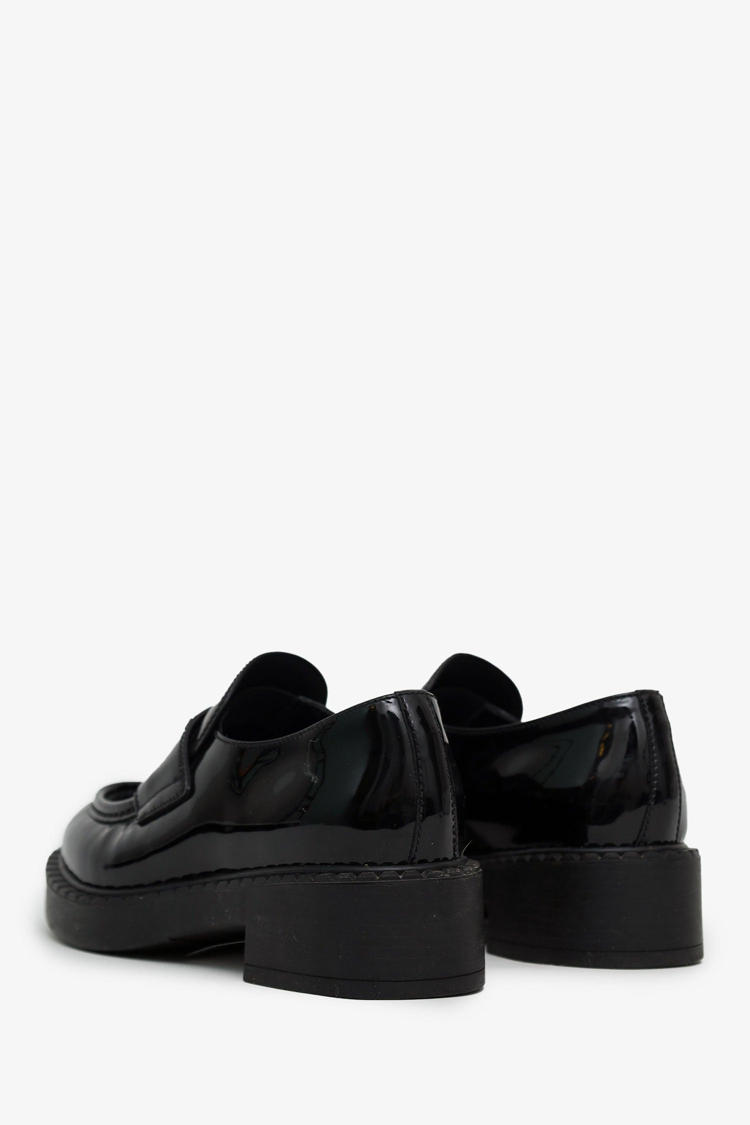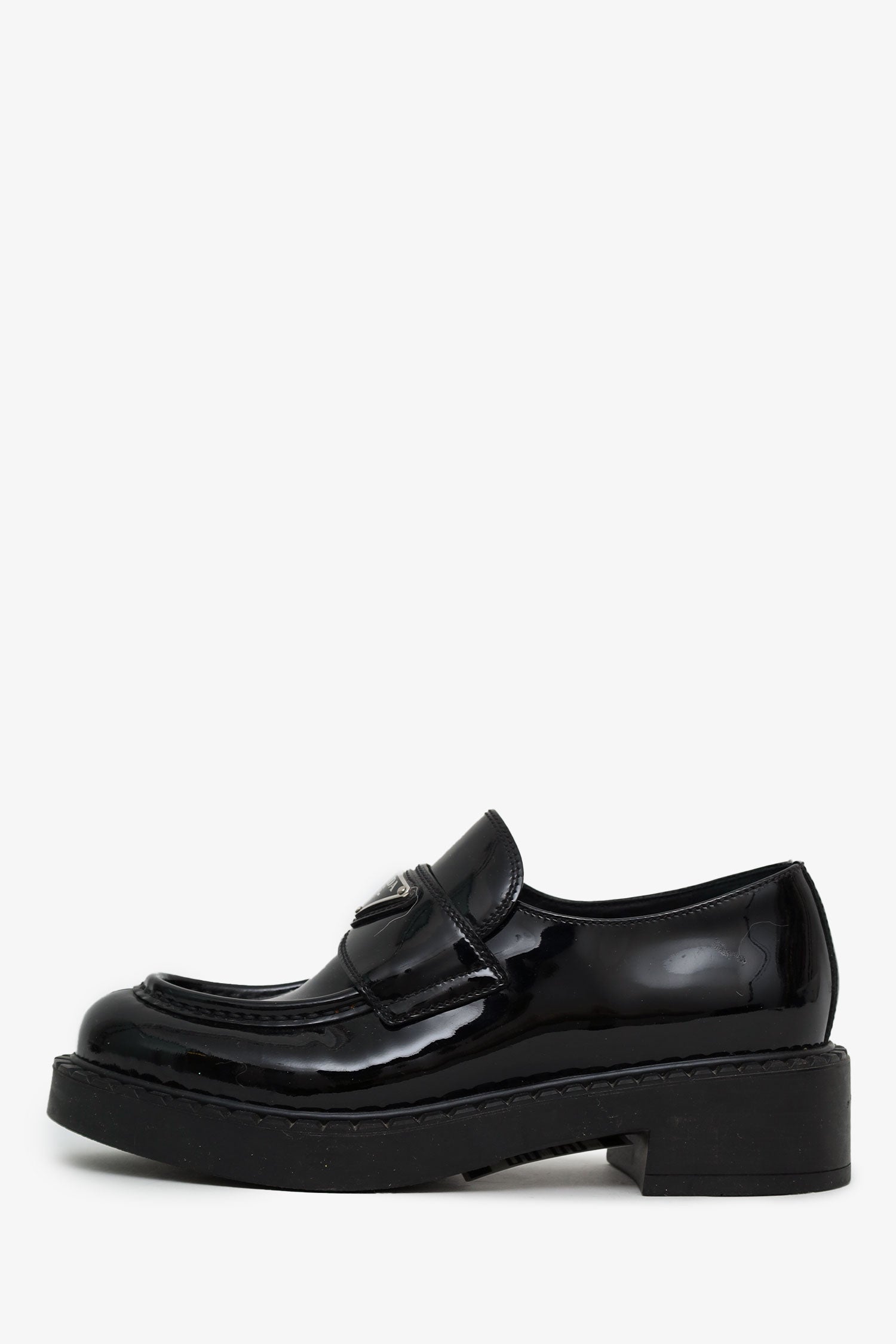 Refresh availabilityPrada Black Patent Leather Triangle Logo Loafers. Round toe. Block heel. Leather-lined interior. Silver-tone hardware. Tonal stitching.