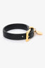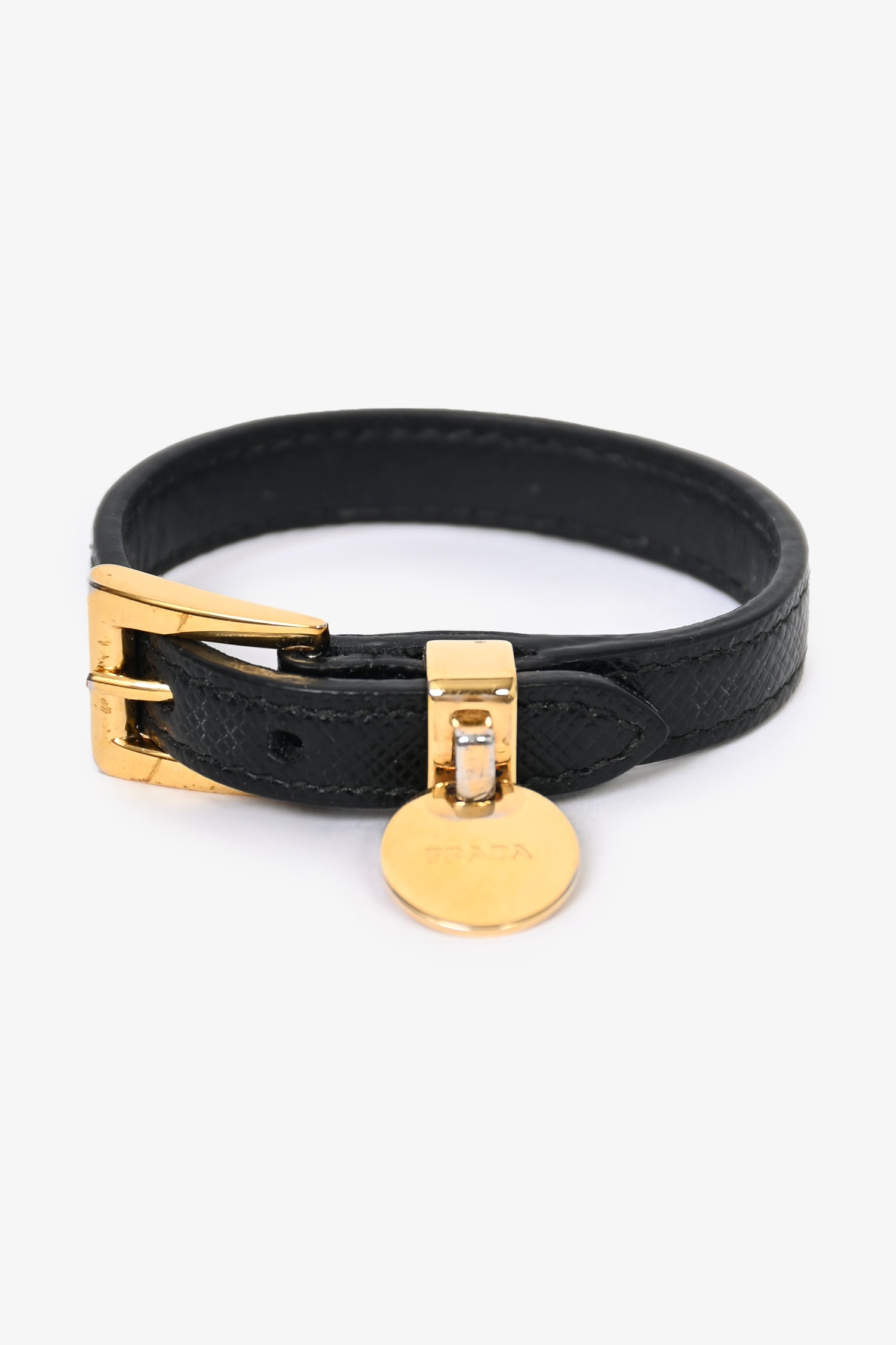 Refresh availabilityPrada Black Saffiano Leather Bracelet. Gold-tone pin buckle. Attached gold-tone medallion. Tonal stitching.