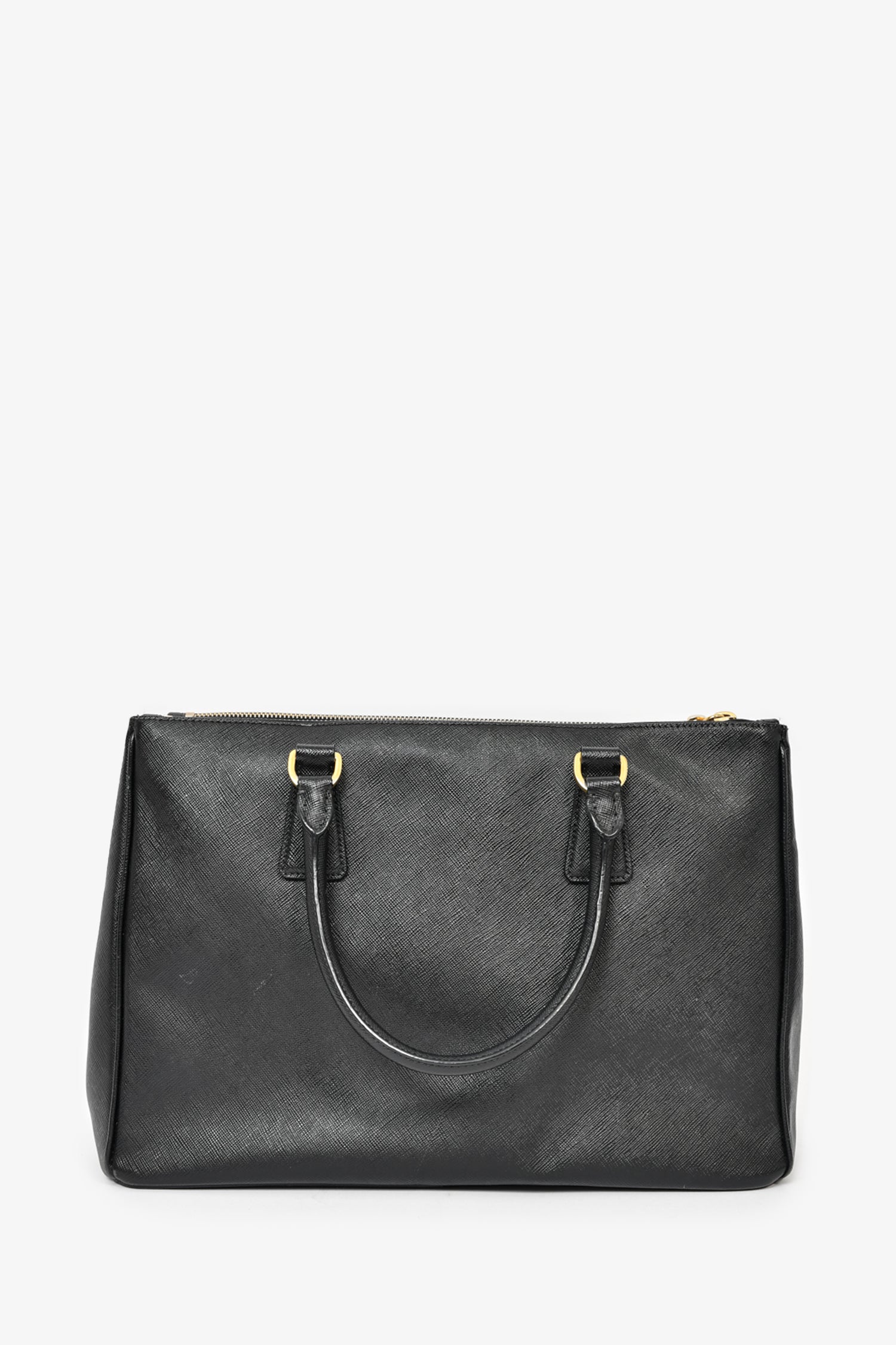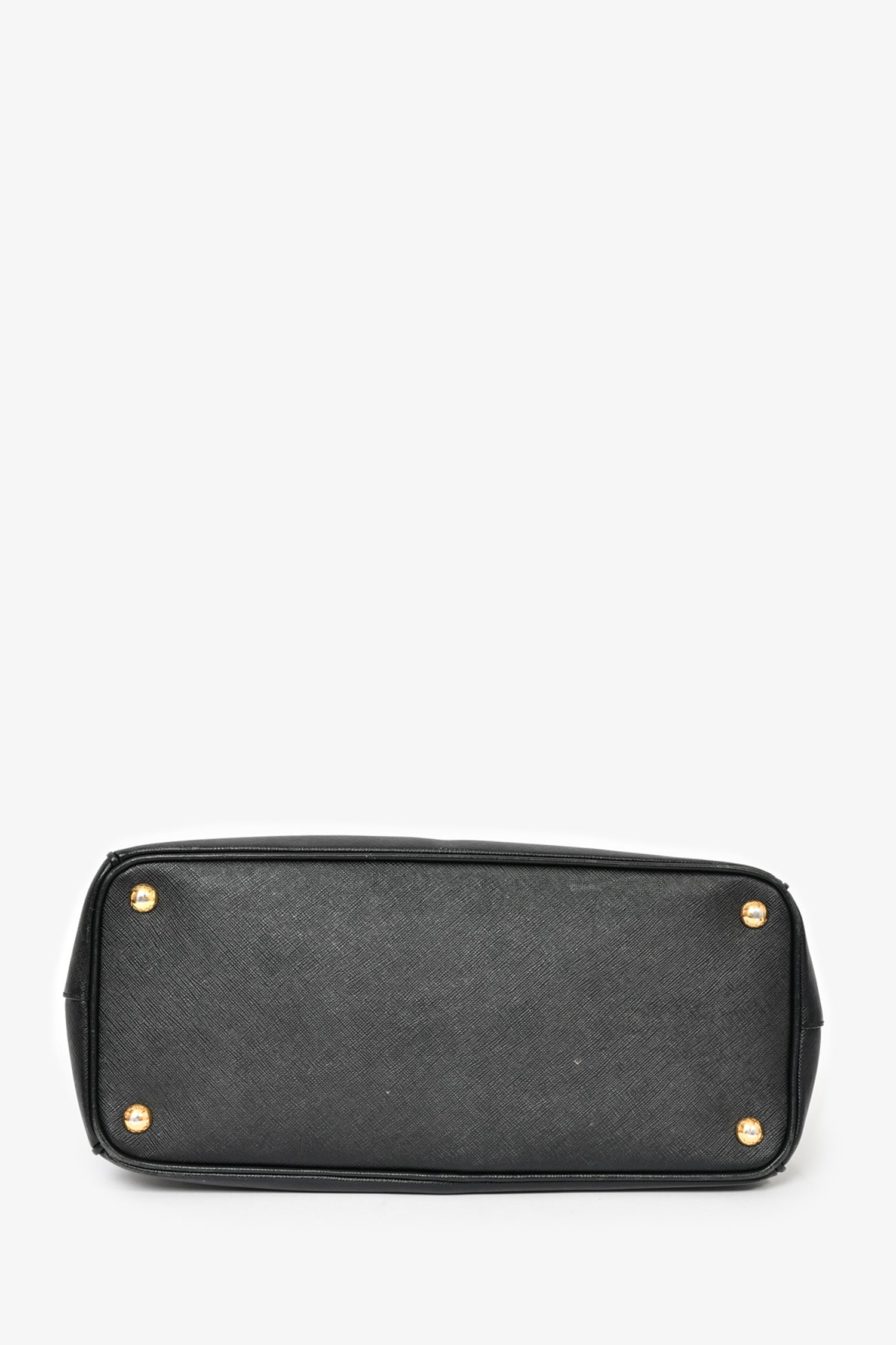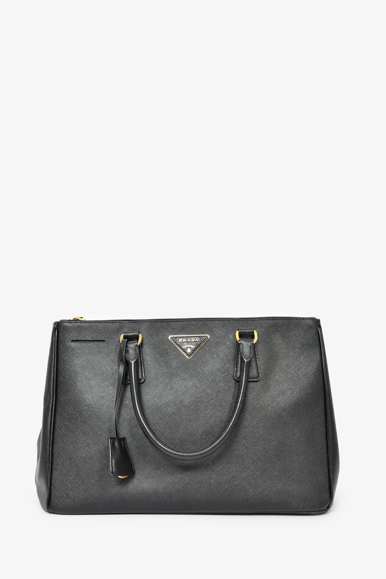 Refresh availabilityPrada Black Saffiano Leather Large 'Galleria' Tote with Strap. Dual rolled handles. Top zip closures. Tonal textile logo'd interior lining. 3 interior wall pockets; 3 open and 1 with zip closure. Protective metal bottom. Gold-tone hardware. Removable and adjustable strap. Tonal stitching.