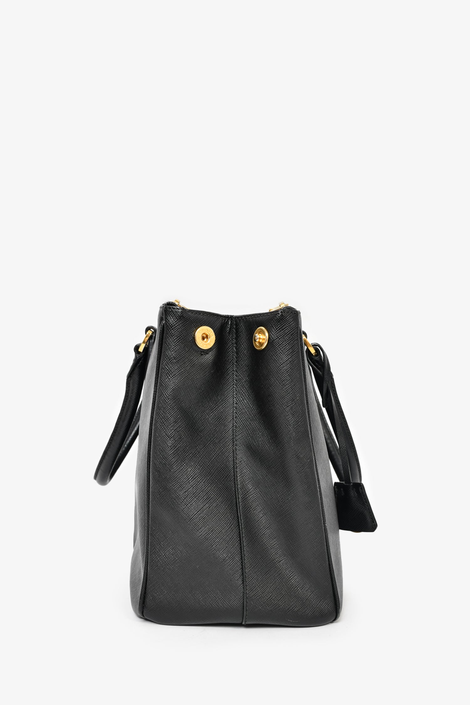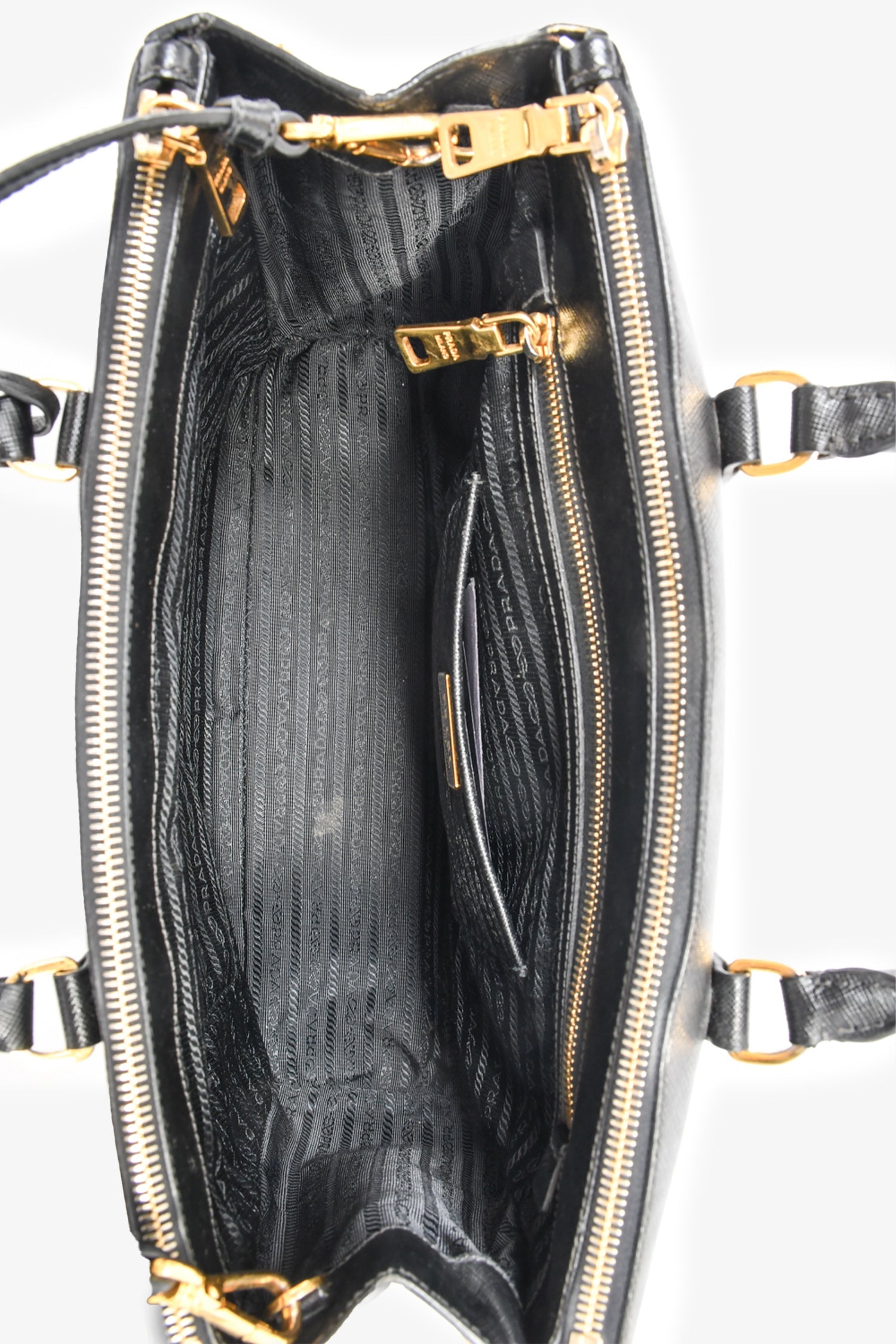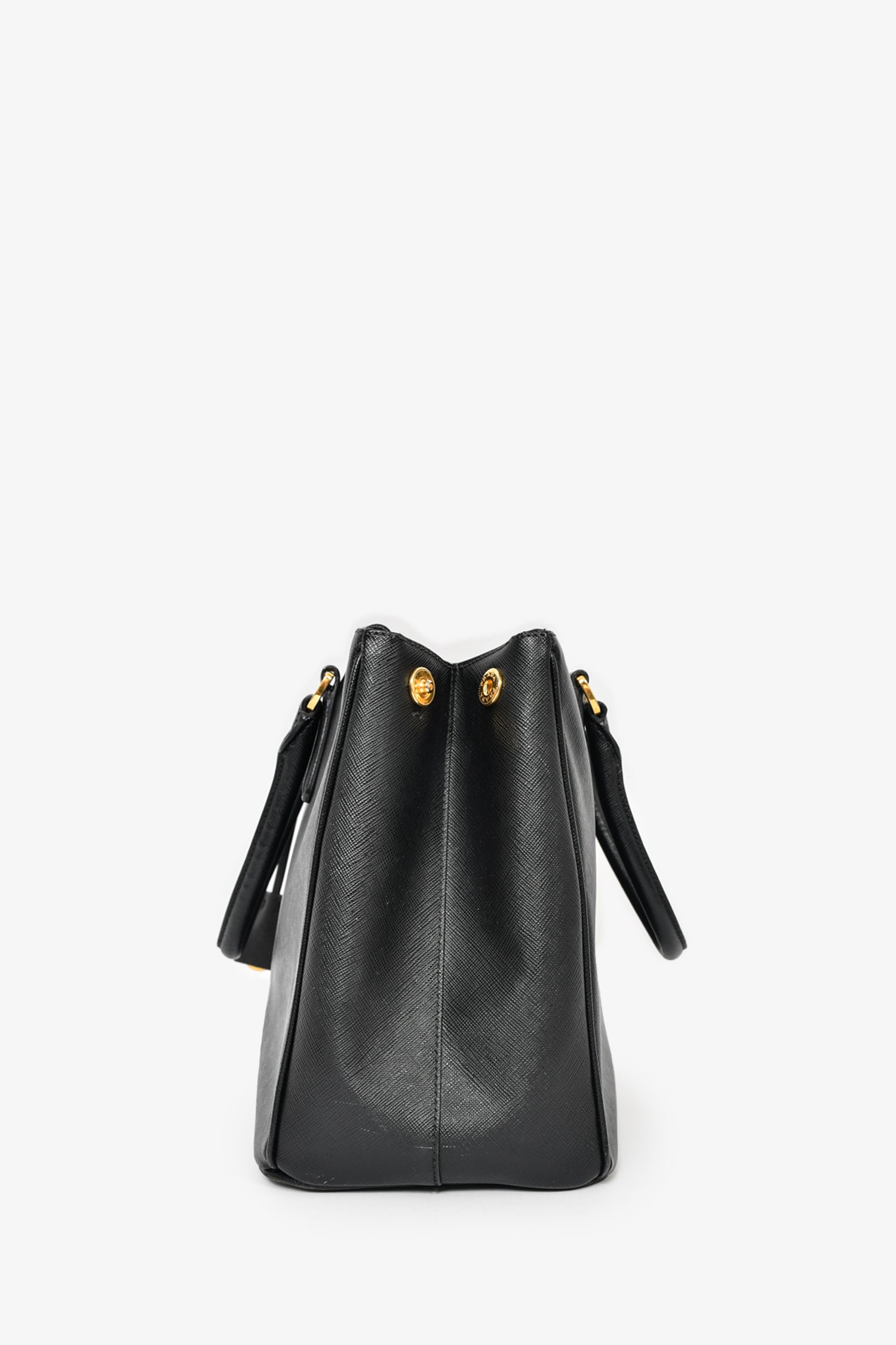 Refresh availabilityPrada Black Saffiano Leather Large 'Galleria' Tote with Strap. Dual rolled handles. Top zip closures. Tonal textile logo'd interior lining. 3 interior wall pockets; 3 open and 1 with zip closure. Protective metal bottom. Gold-tone hardware. Removable and adjustable strap. Tonal stitching.
