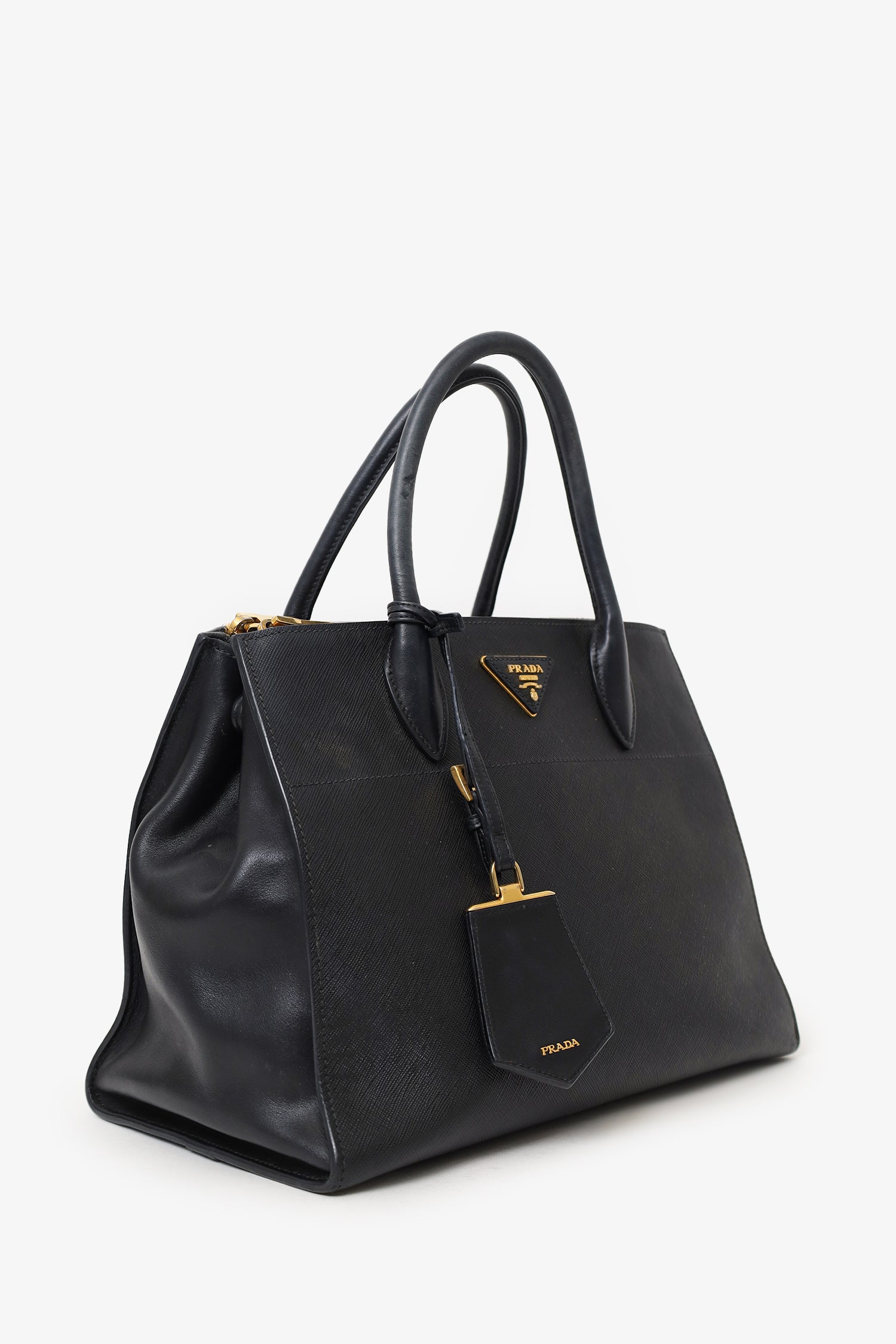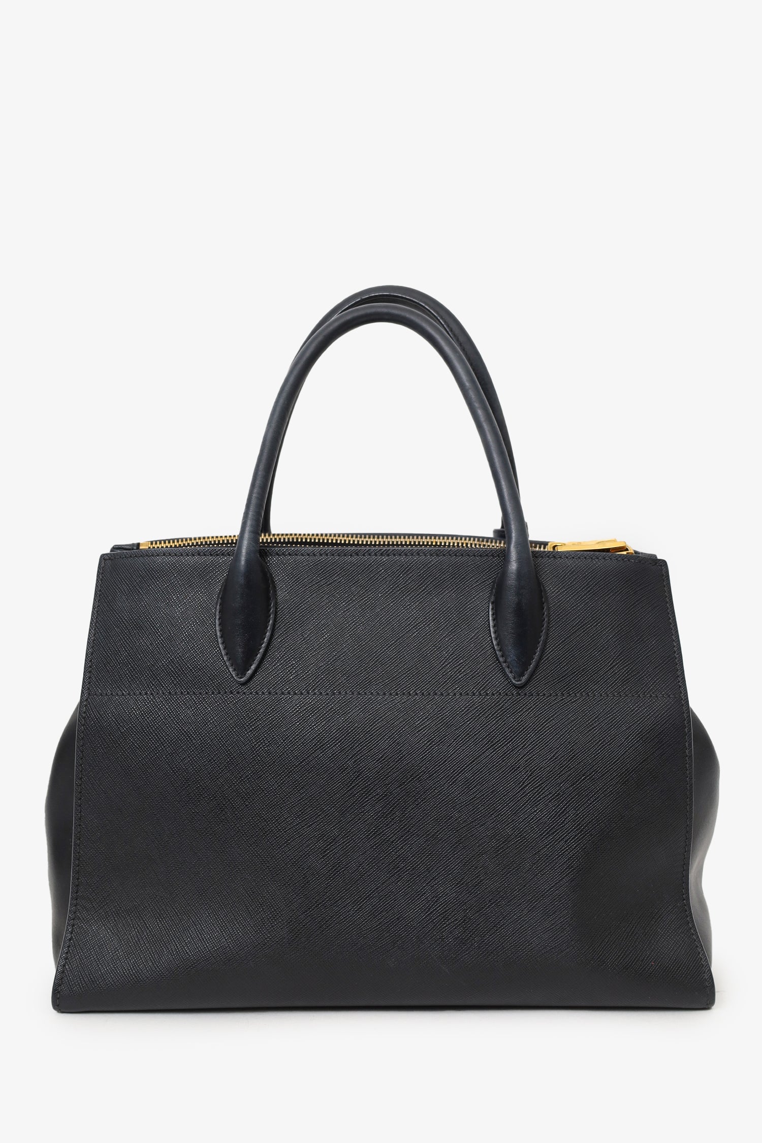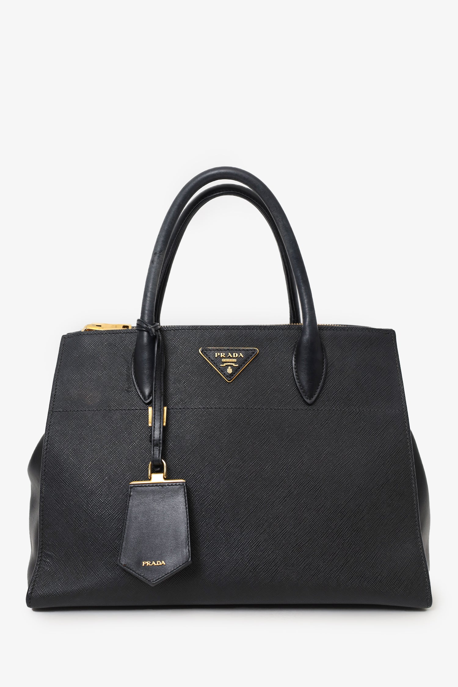 Prada Black Saffiano Leather Top Handle. Top open. Twin top handles. 3 interior compartments; front and rear zip and middle open with one zip and one slip pockets. Lined interior. Removable keychain attachment. Gold-tone hardware. Tonal stitching.