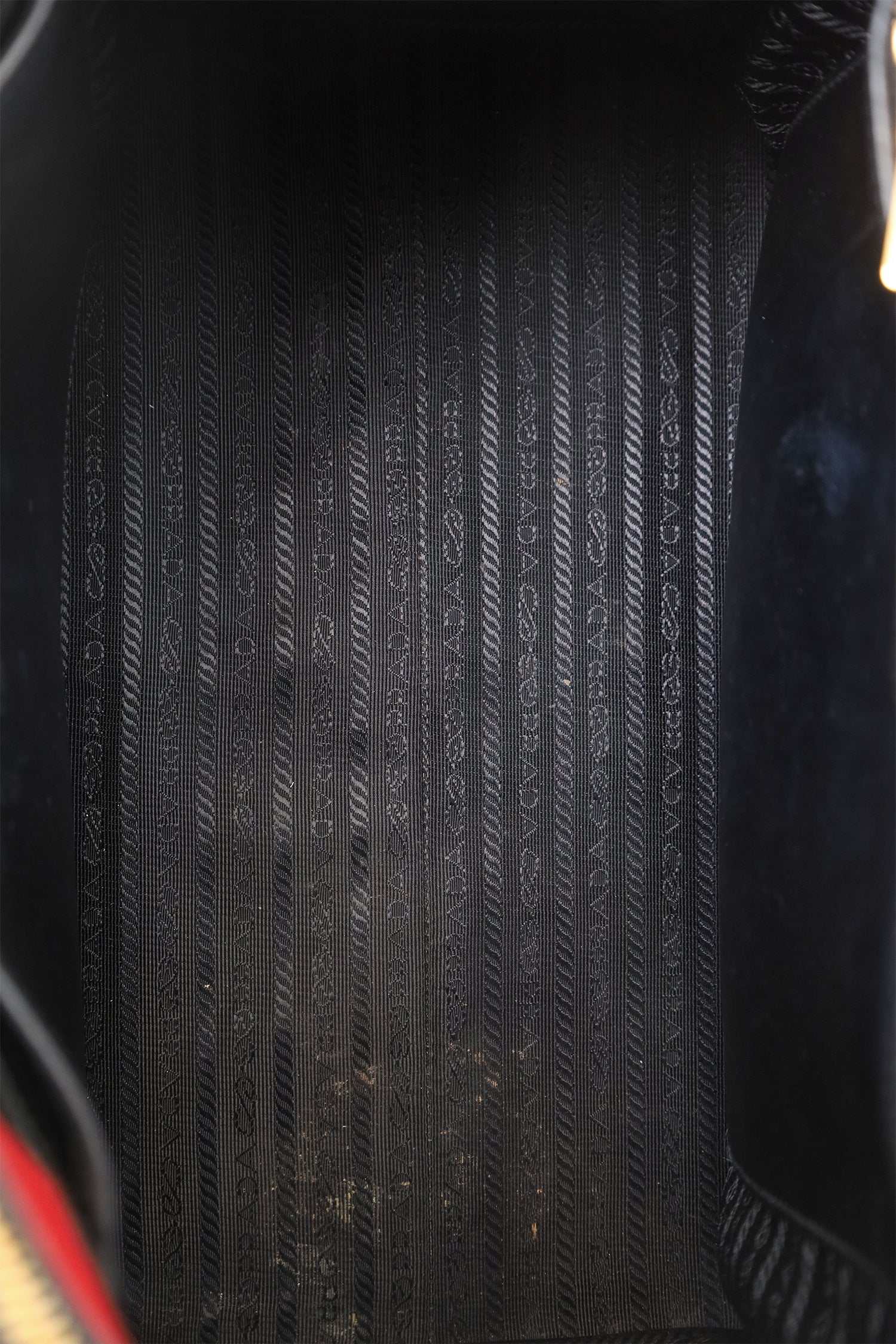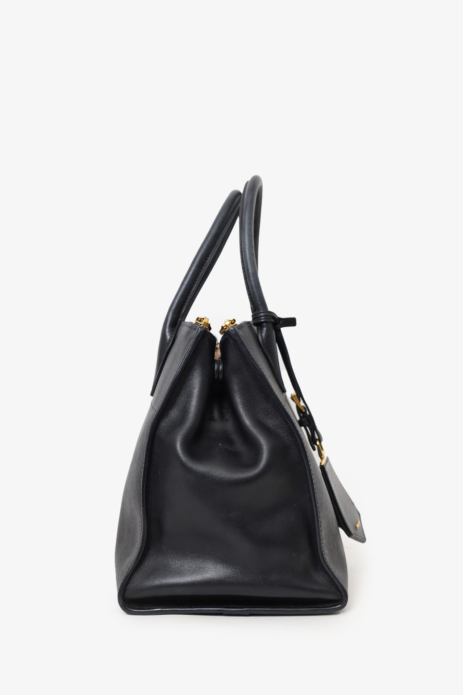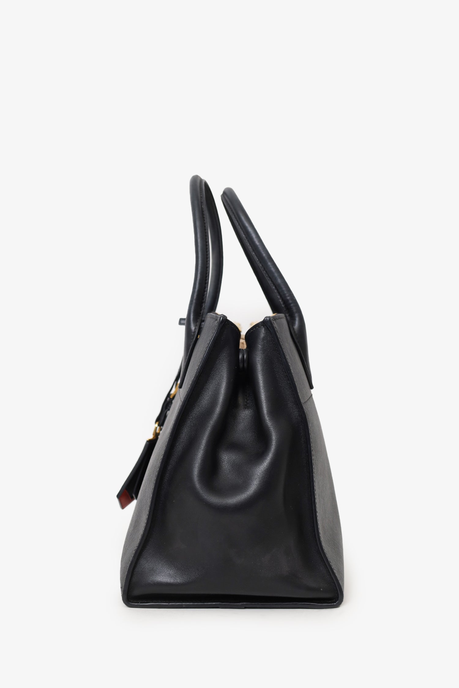 Prada Black Saffiano Leather Top Handle. Top open. Twin top handles. 3 interior compartments; front and rear zip and middle open with one zip and one slip pockets. Lined interior. Removable keychain attachment. Gold-tone hardware. Tonal stitching.