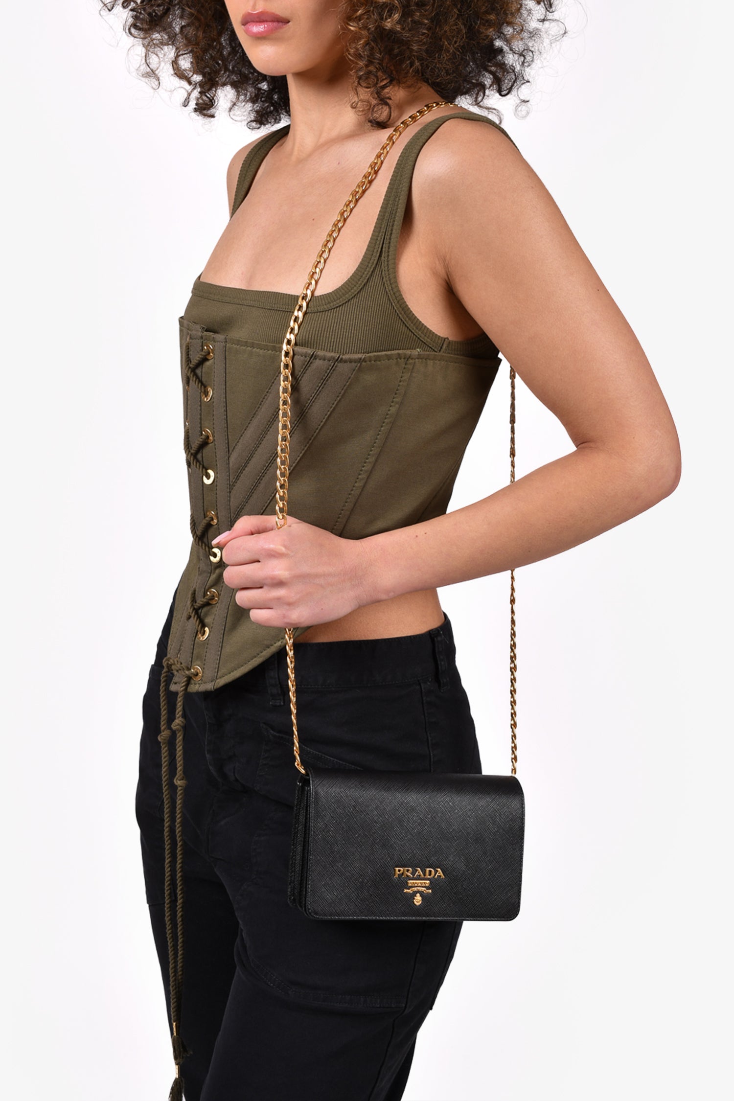 Prada Black Saffiano Leather Wallet on Chain. Front fold-over flap with magnetic button closures. 3 interior compartments; 2 open and 1 with zip closure. 8 card slots. Interior mirror. Gold-tone hardware. Tonal stitching.