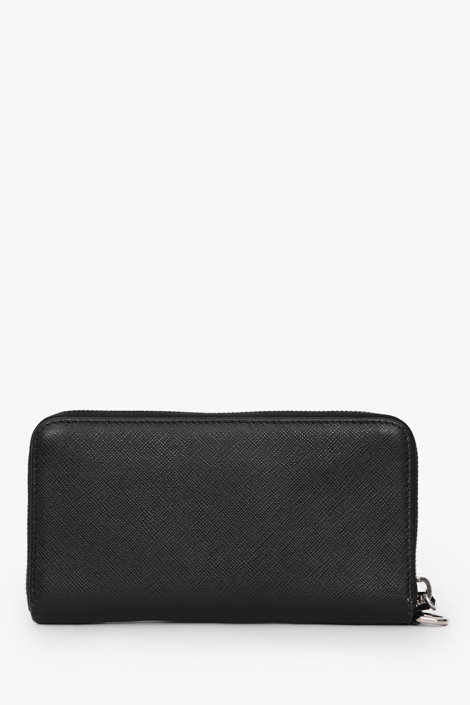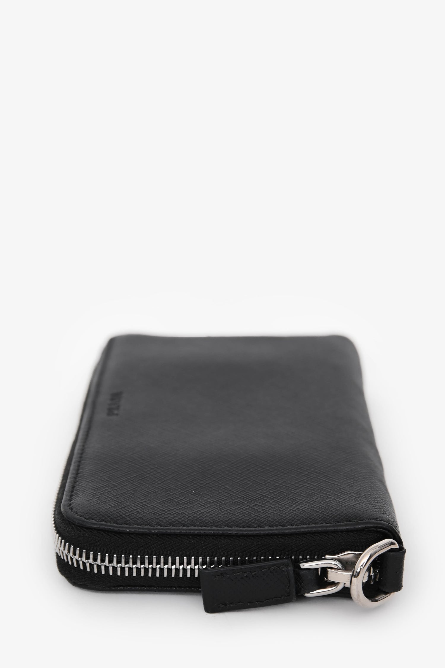 Refresh availabilityPrada Black Saffiano Leather Zip Around Long Wallet. Zip opening. 2 interior compartments with 6 card slots. Silver-tone hardware. Tonal stitching.