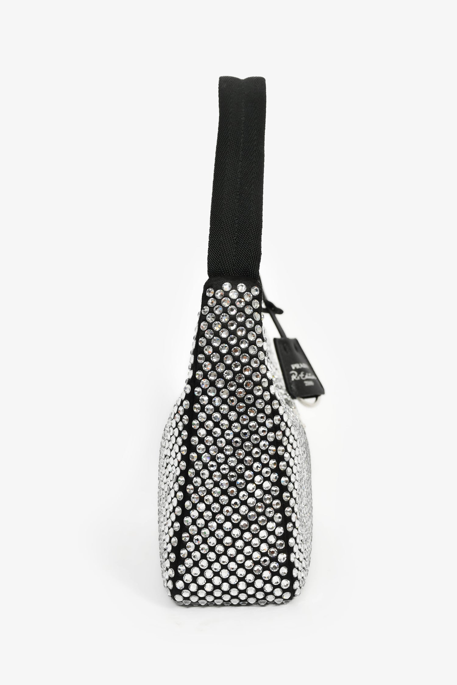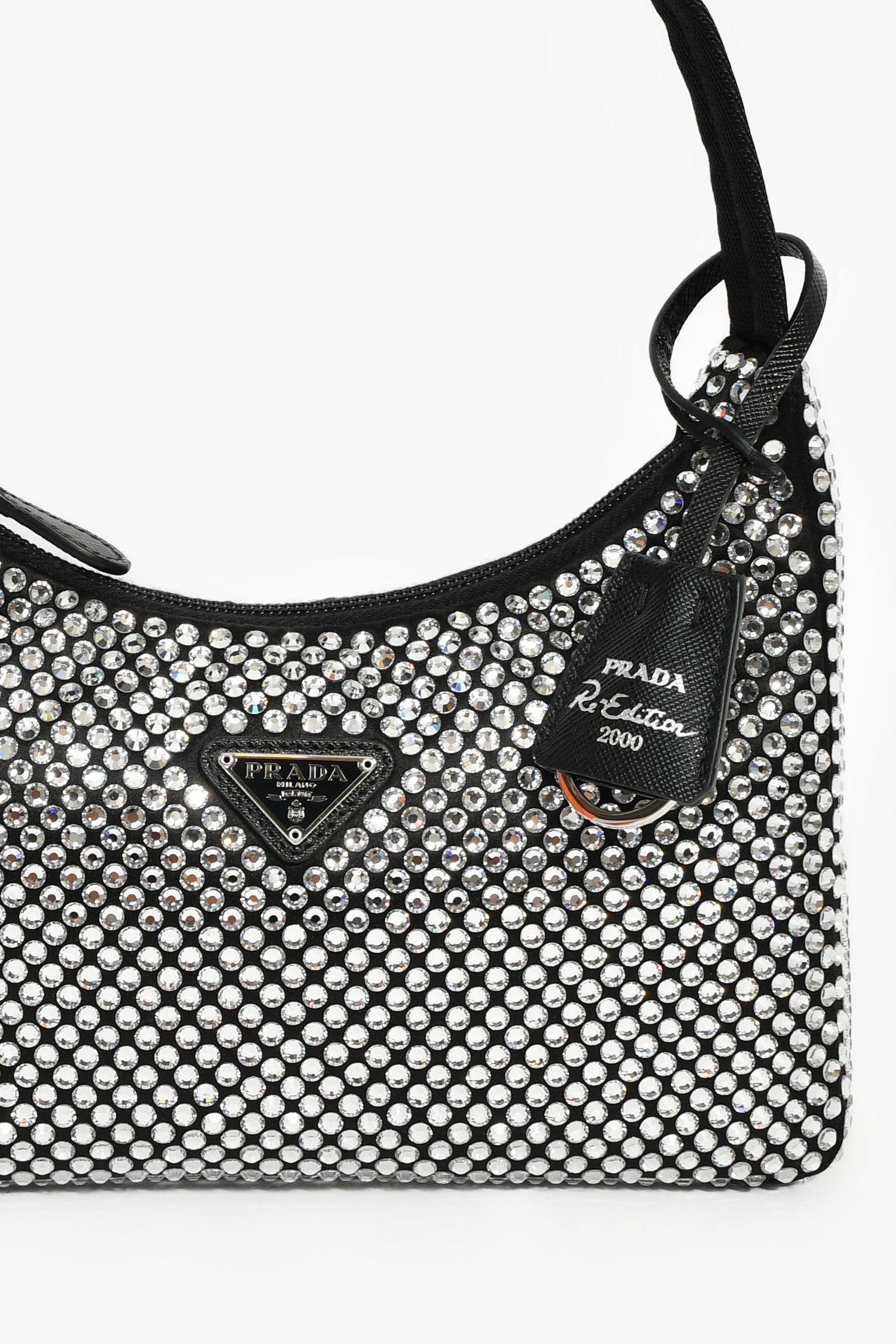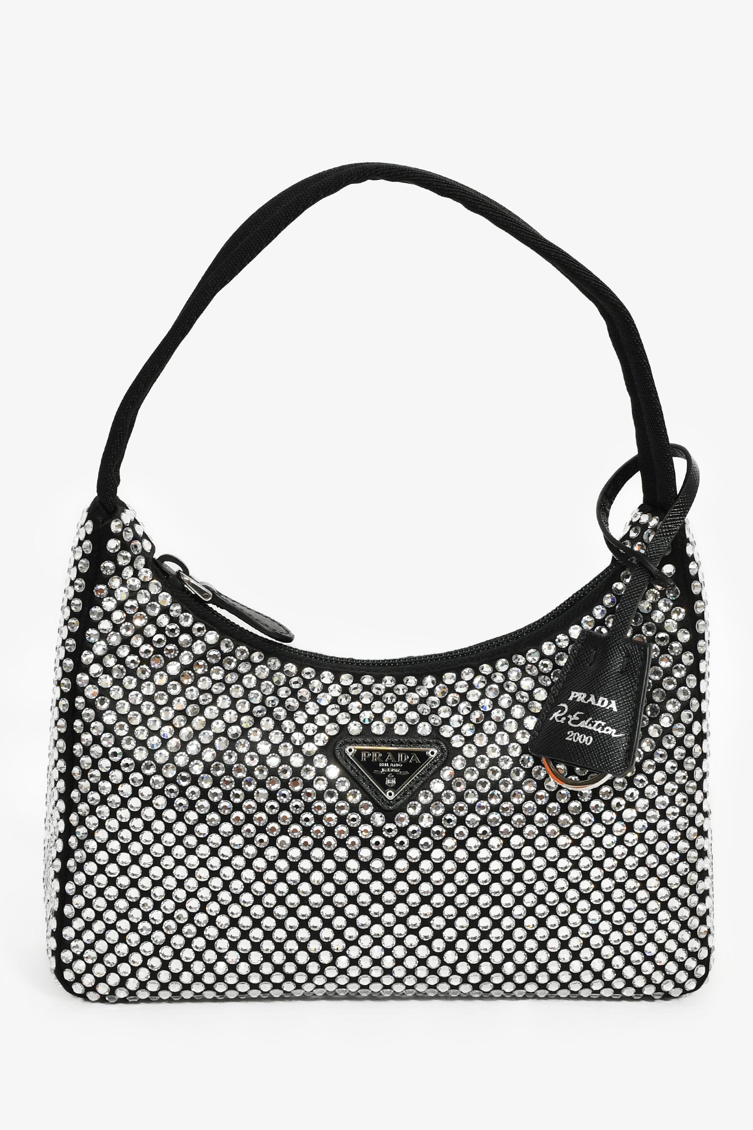 Refresh availabilityPrada Black Satin Crystal Re-Edition Mini Shoulder Bag. Top zipper closure. Single interior compartment. Textile-lined interior. Silver-tone hardware. Tonal stitching.