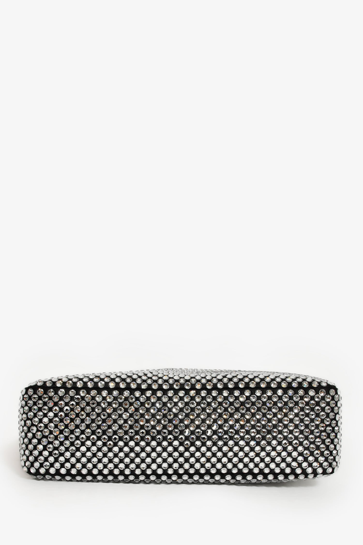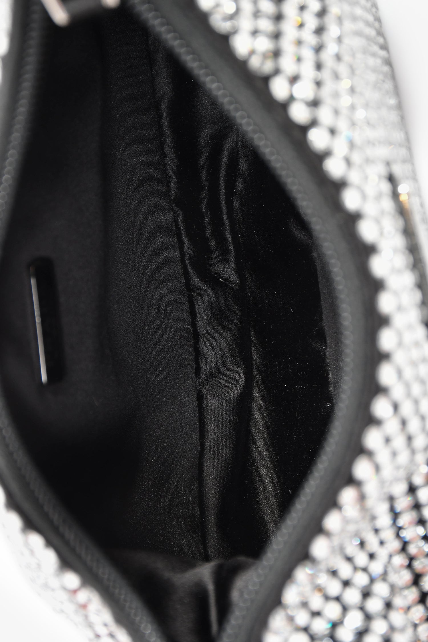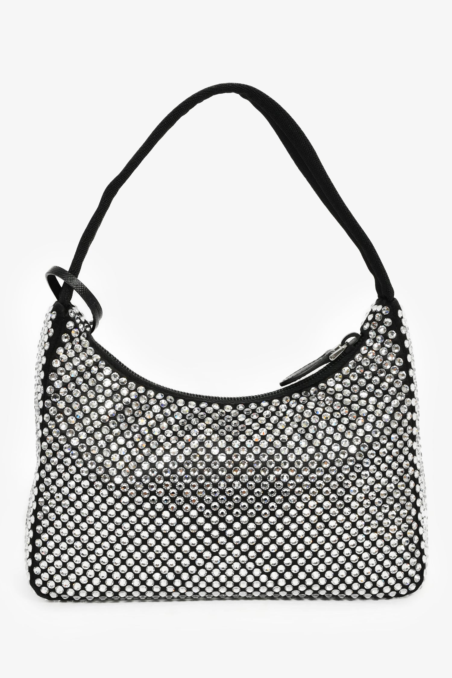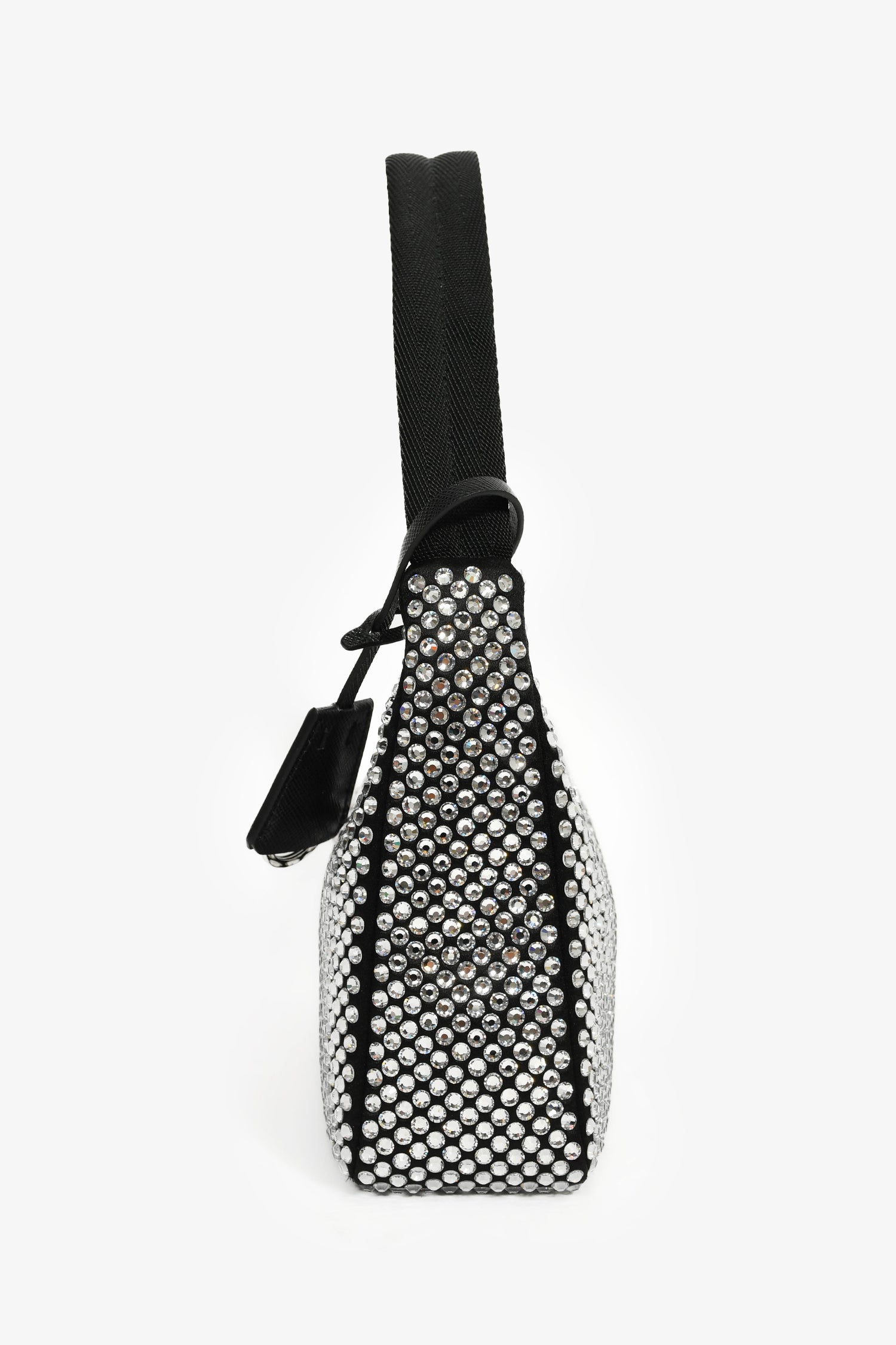 Refresh availabilityPrada Black Satin Crystal Re-Edition Mini Shoulder Bag. Top zipper closure. Single interior compartment. Textile-lined interior. Silver-tone hardware. Tonal stitching.