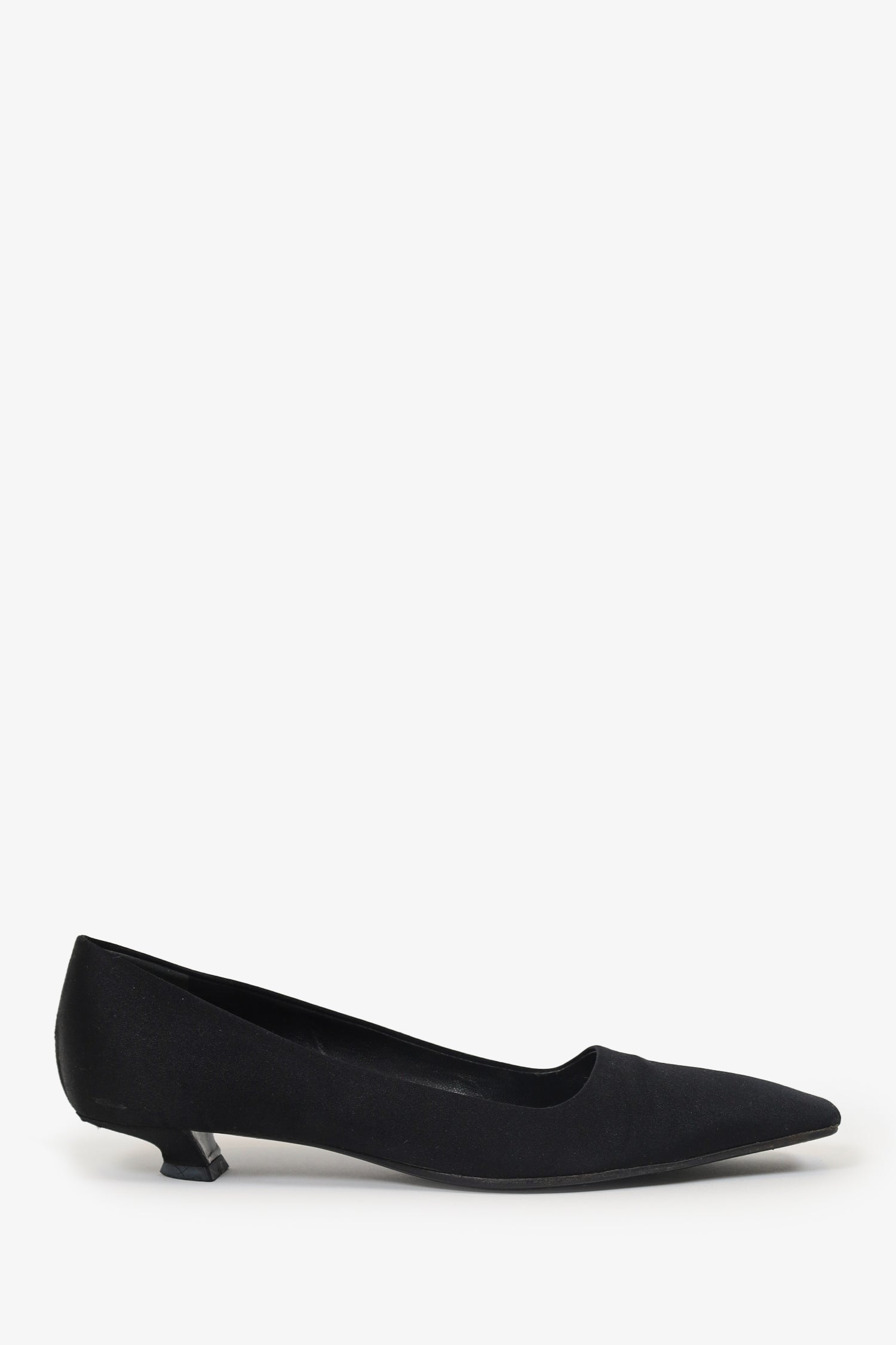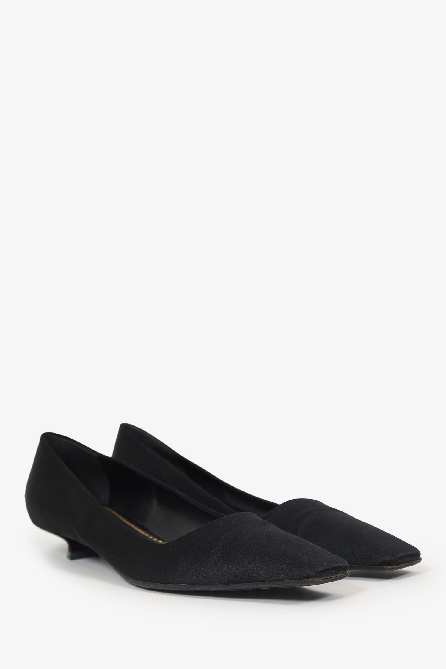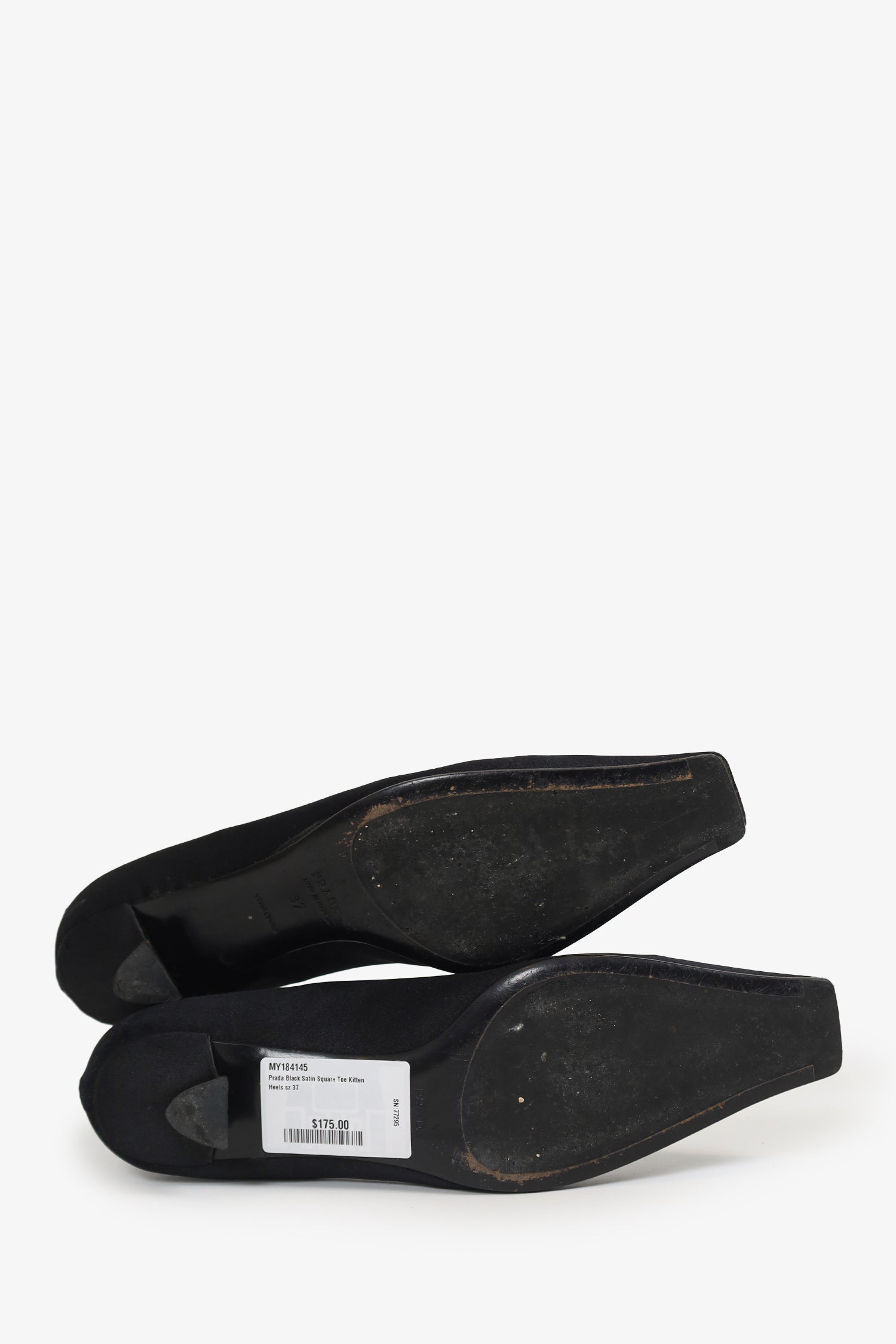 Refresh availabilityPrada Black Satin Square Toe Kitten Heels. Slip-on. Pointed-square toe. Lined interior. Tonal stitching.