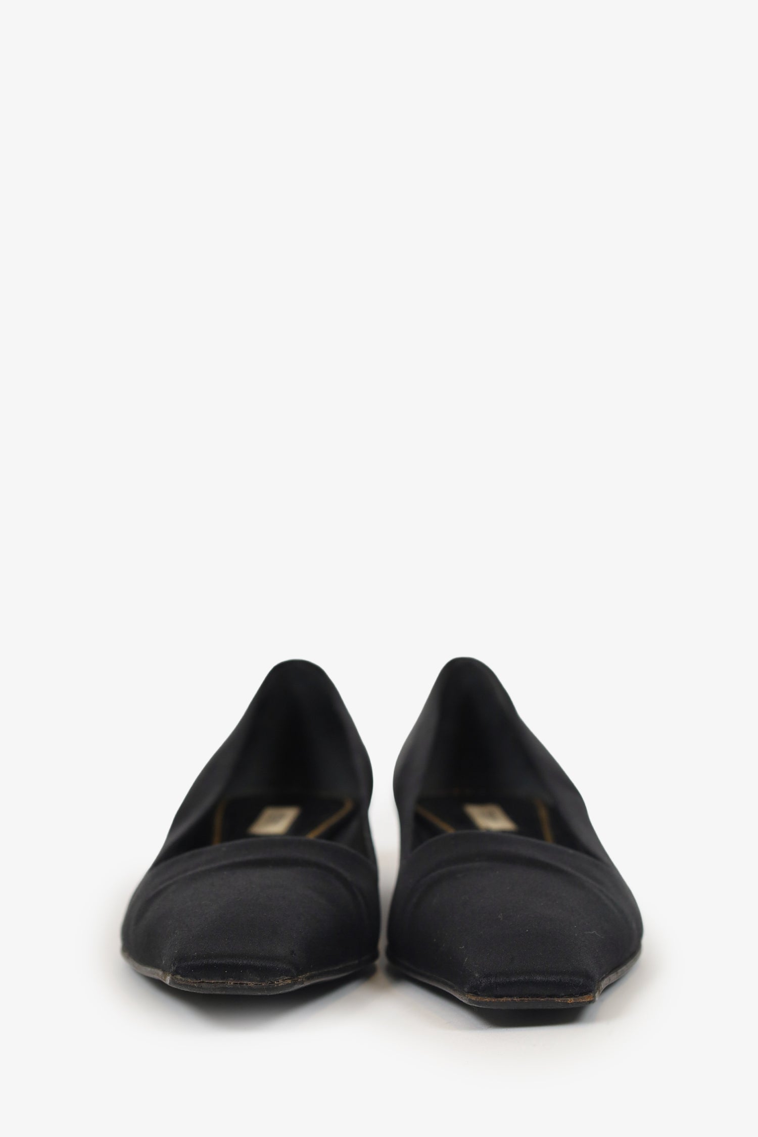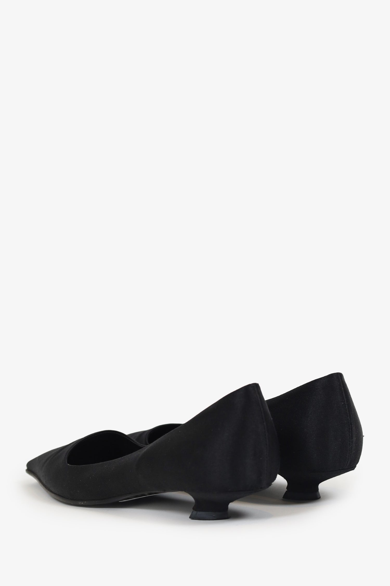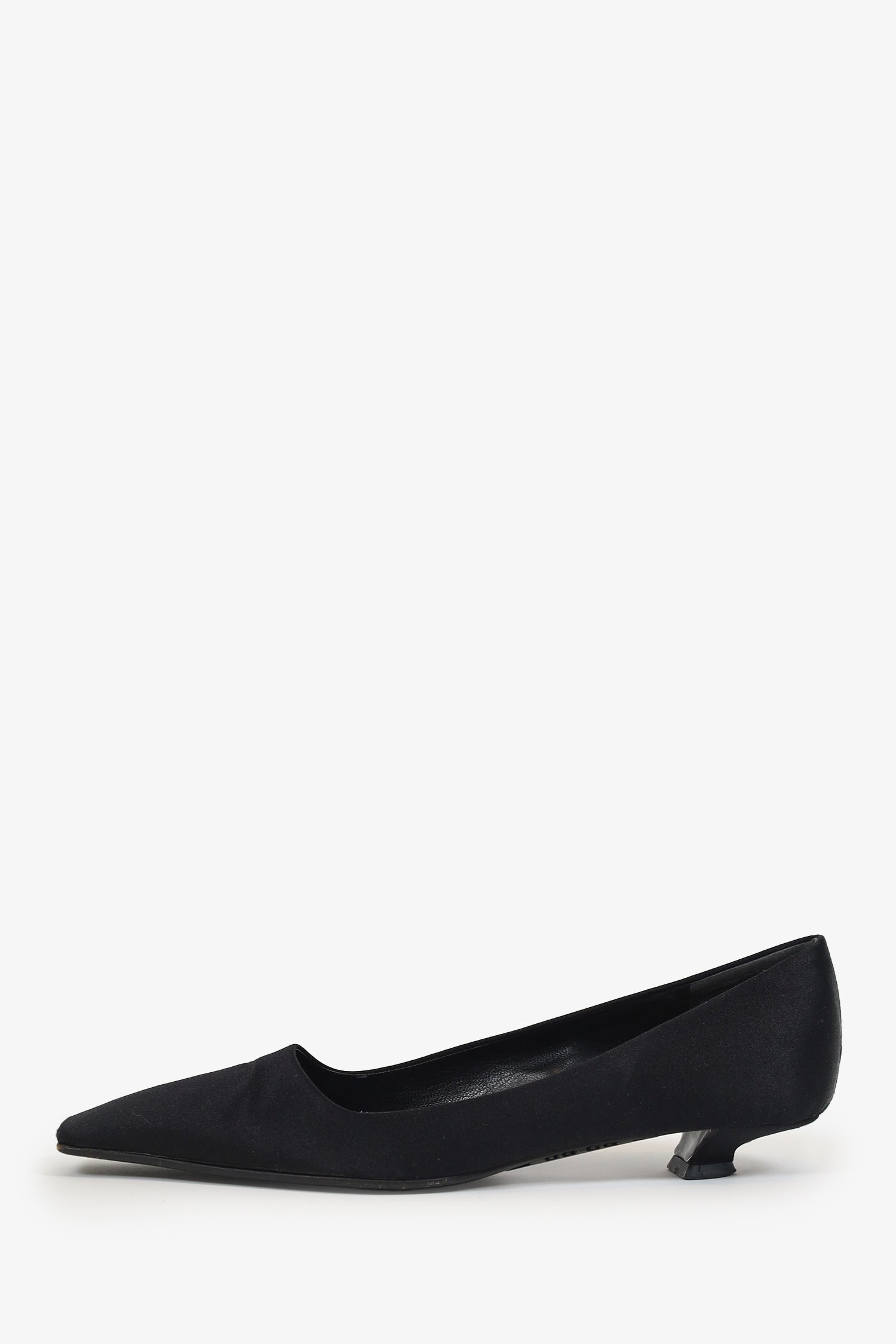 Refresh availabilityPrada Black Satin Square Toe Kitten Heels. Slip-on. Pointed-square toe. Lined interior. Tonal stitching.