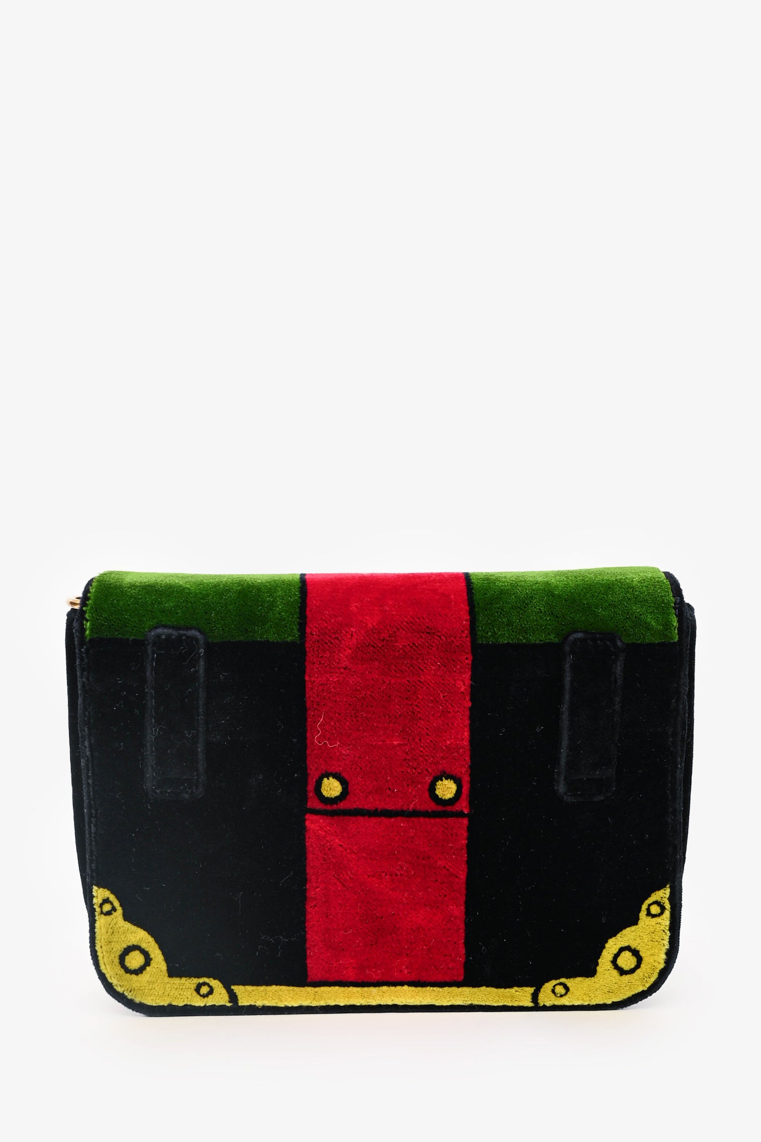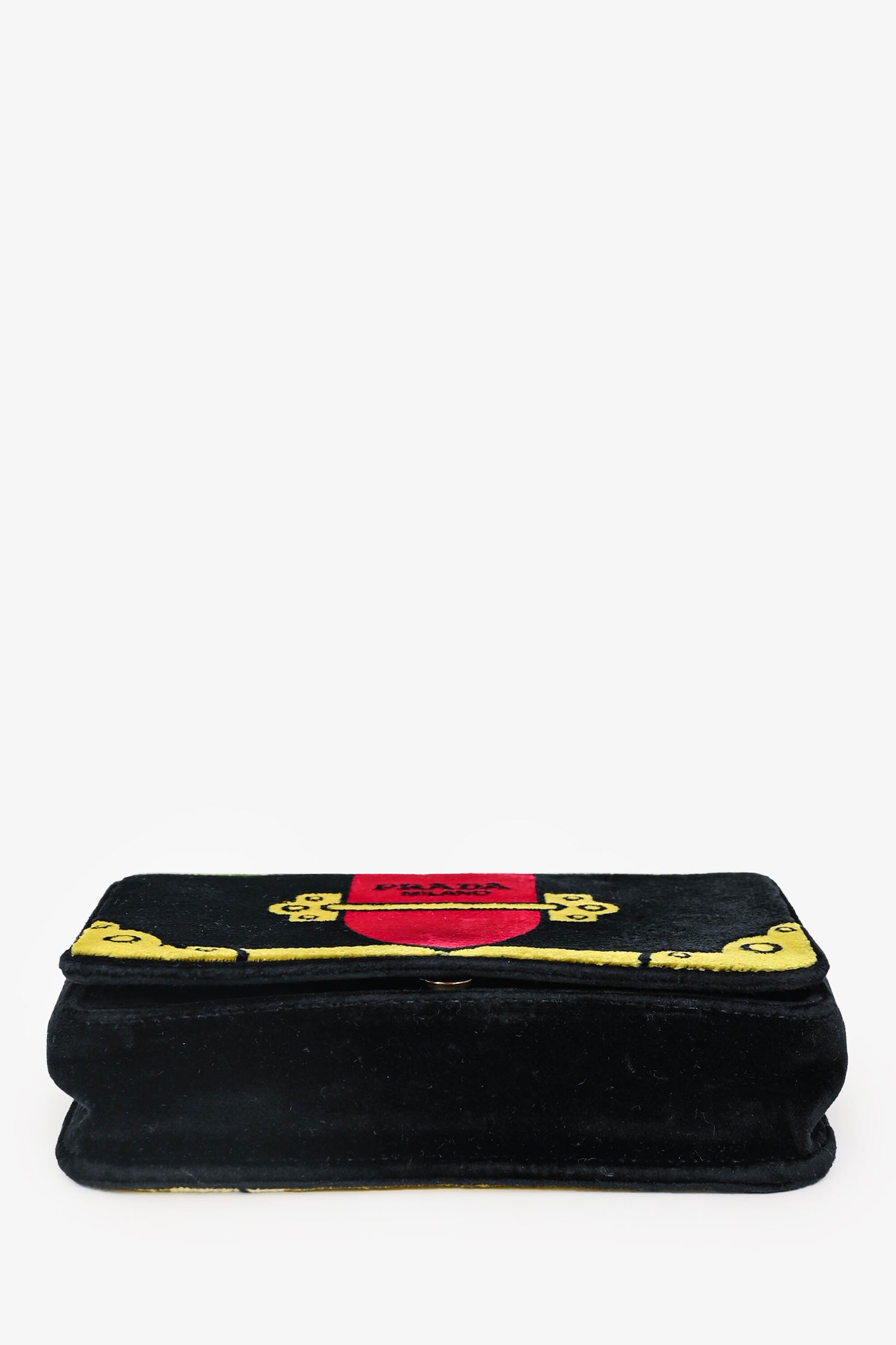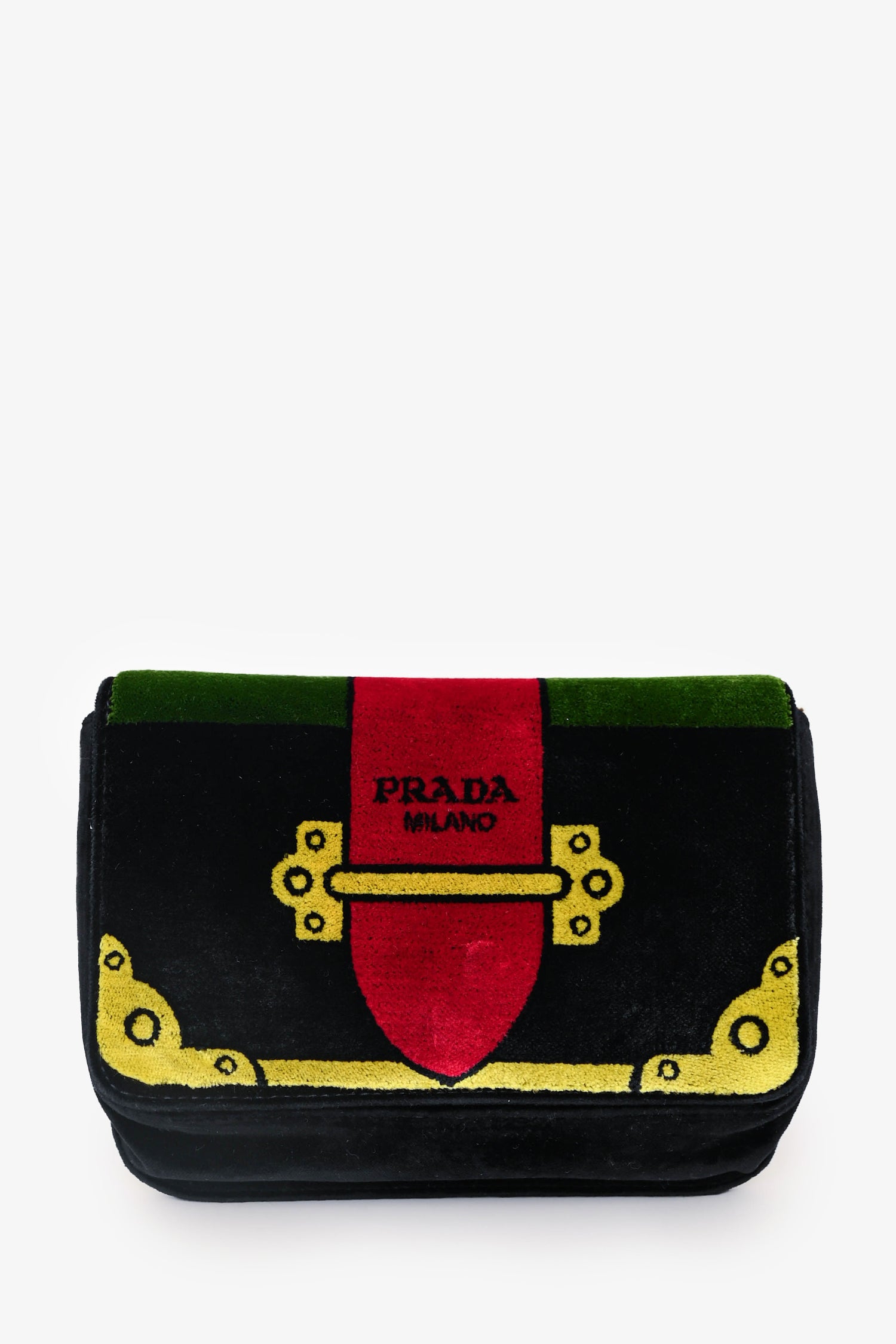 Refresh availabilityPrada Black Velvet Cahier Shoulder/Belt Bag with Chain. Front fold-over flap with magnetic button closure. Single interior wall slip pocket. Gold-tone hardware. Interchangeable straps.