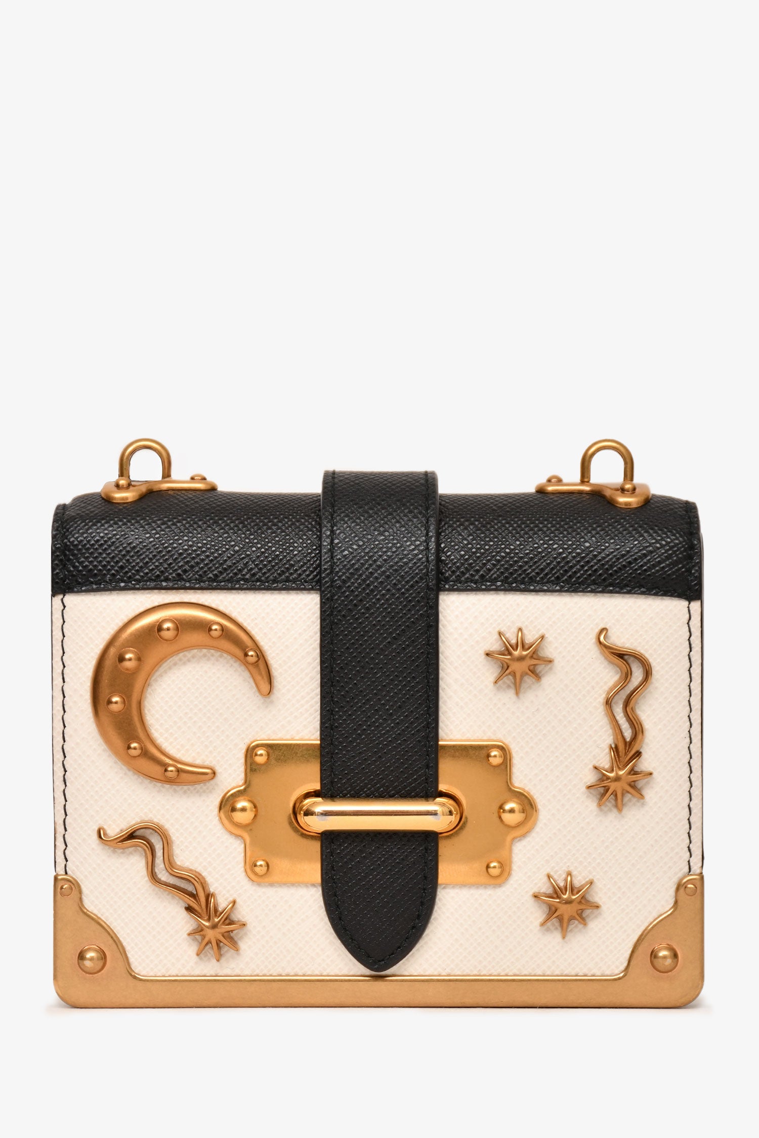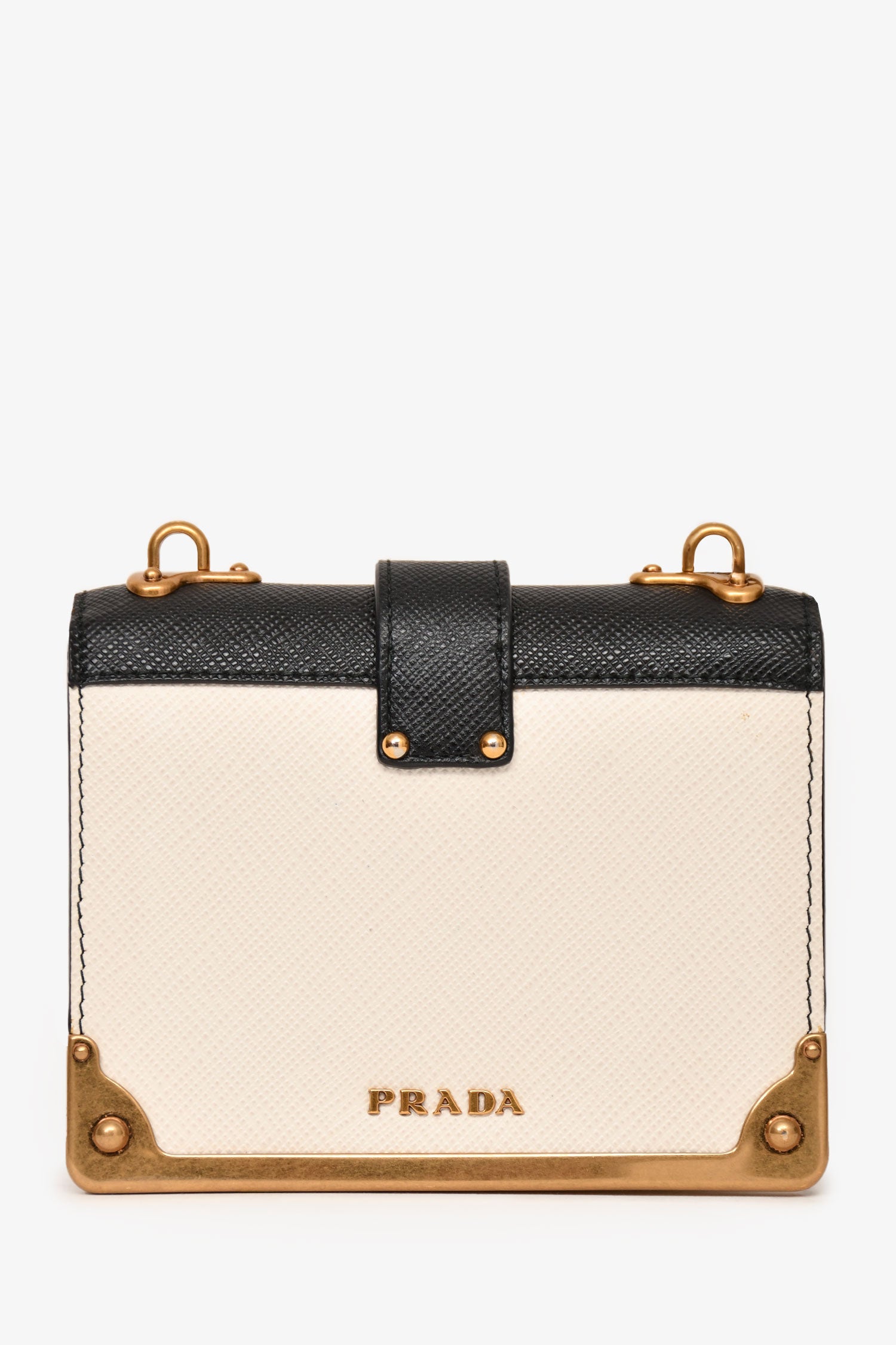 Refresh availabilityPrada Black/White Leather Micro 'Cahier' Chain Crossbody With Extra Strap. Top flap closure. Gold-tone hardware. Chain strap. Tonal stitching.
