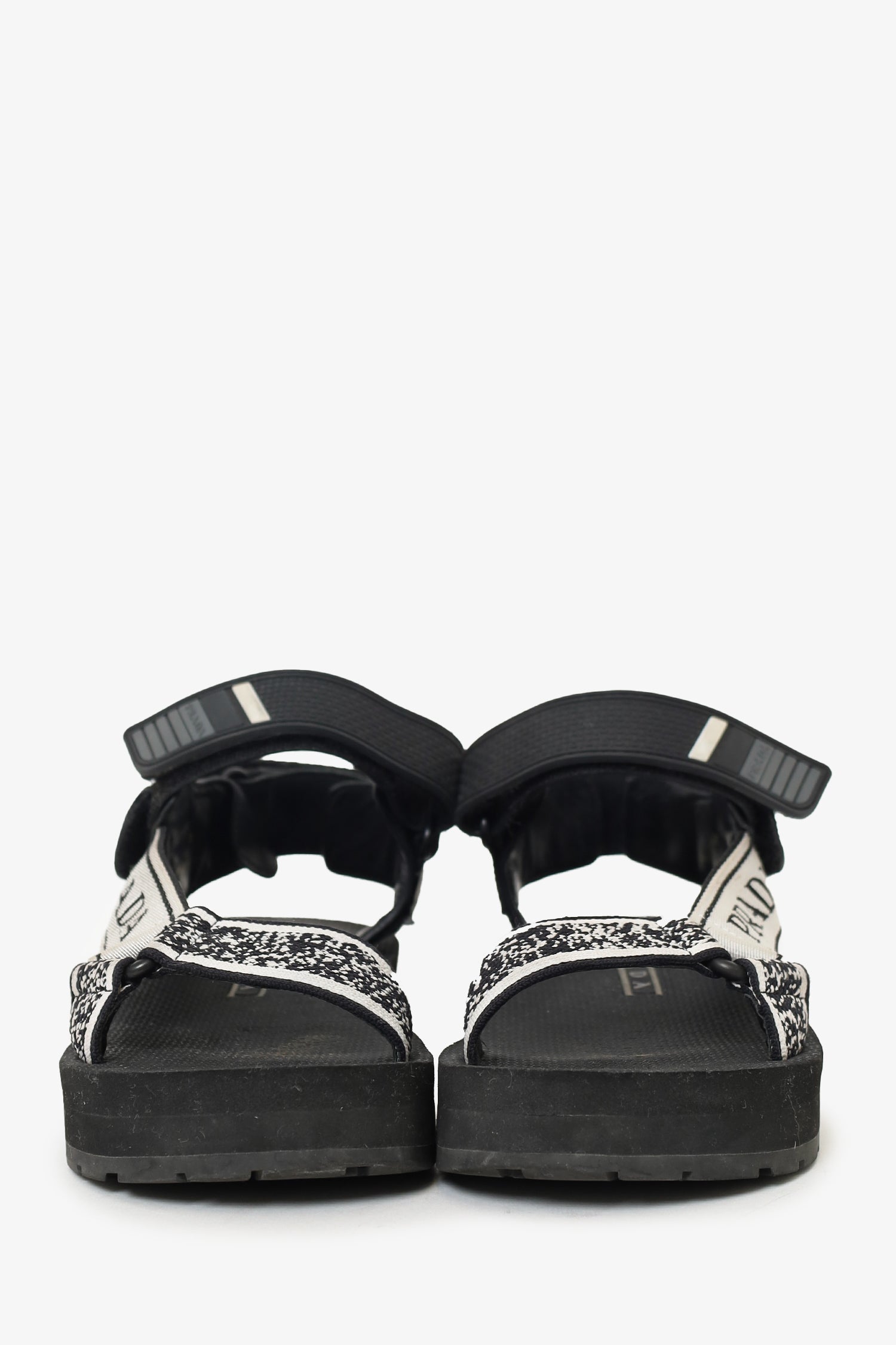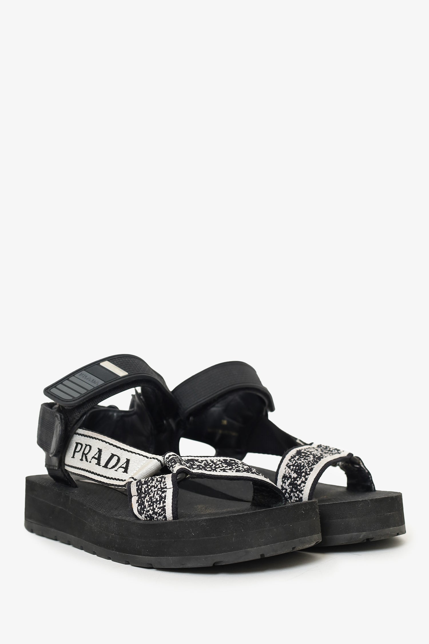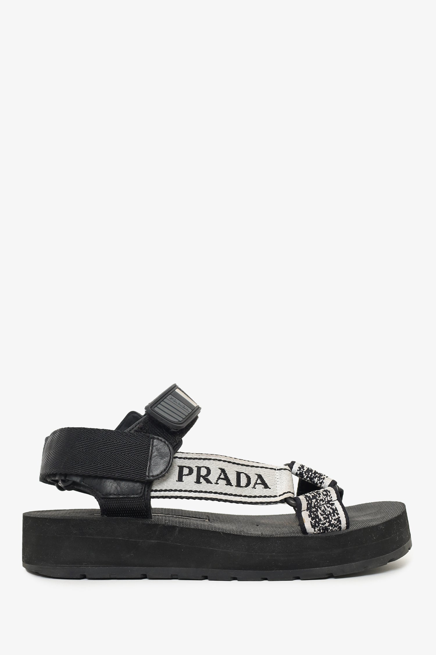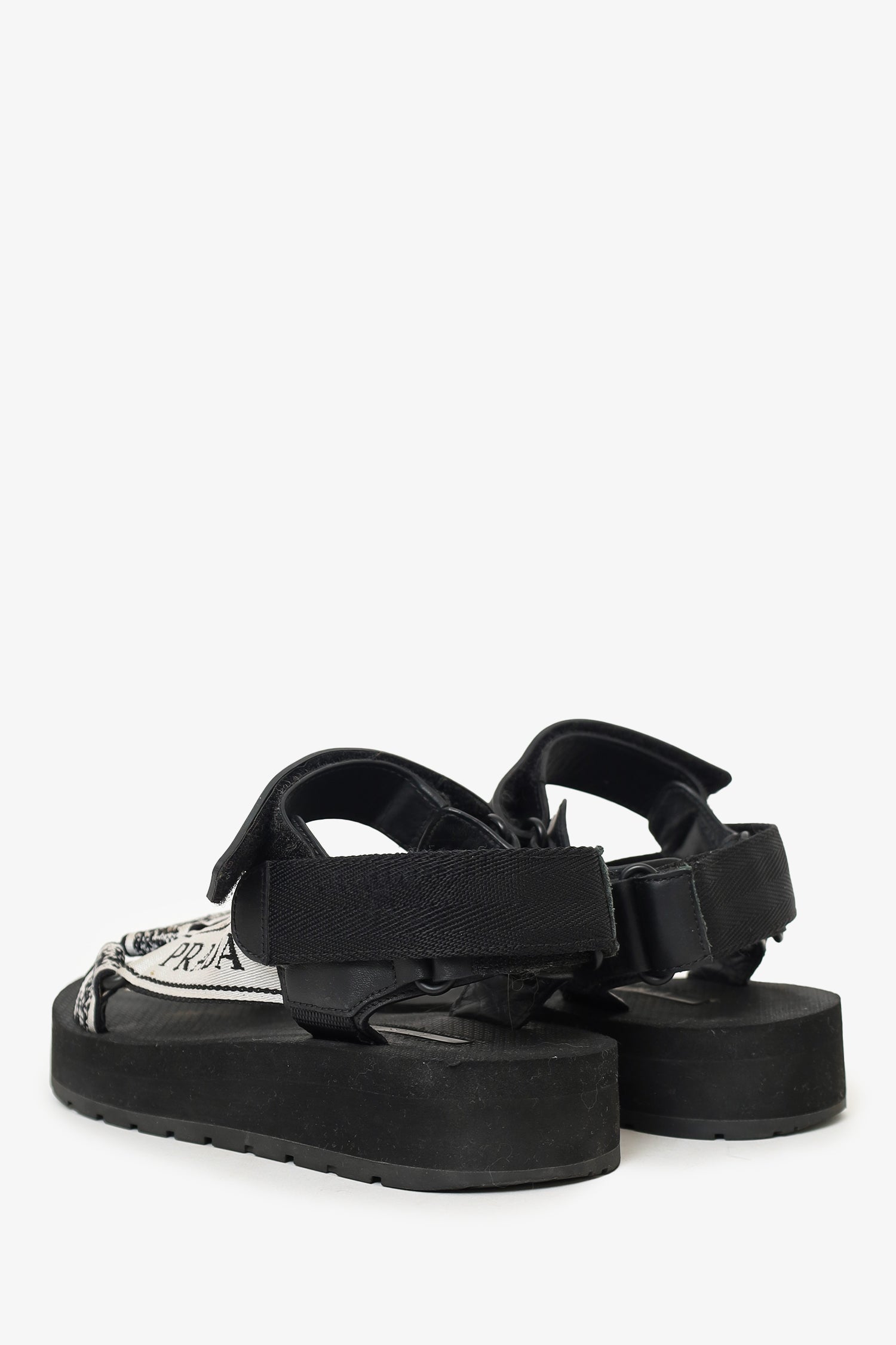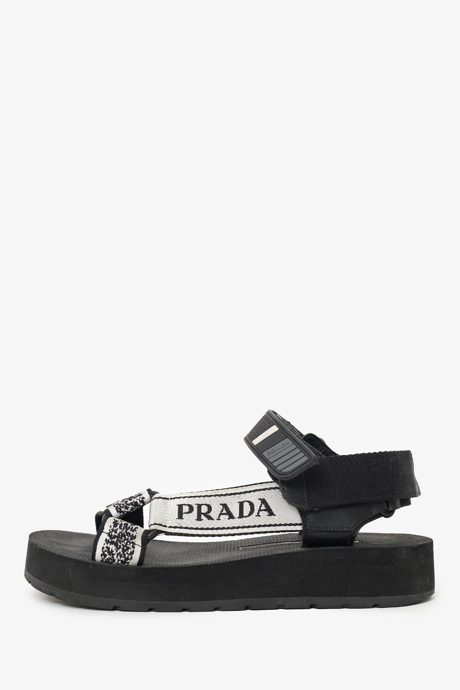 Refresh availabilityPrada Black/White Logo Sandals. Slip-on. Round open toe. Double velcro closure around ankle. Tonal and contrast stitching.