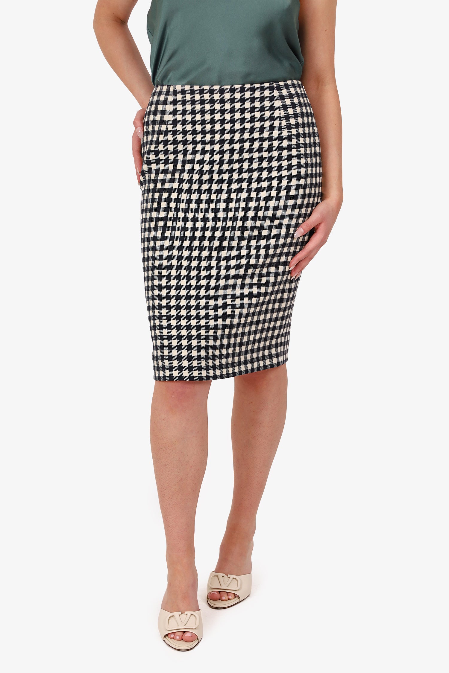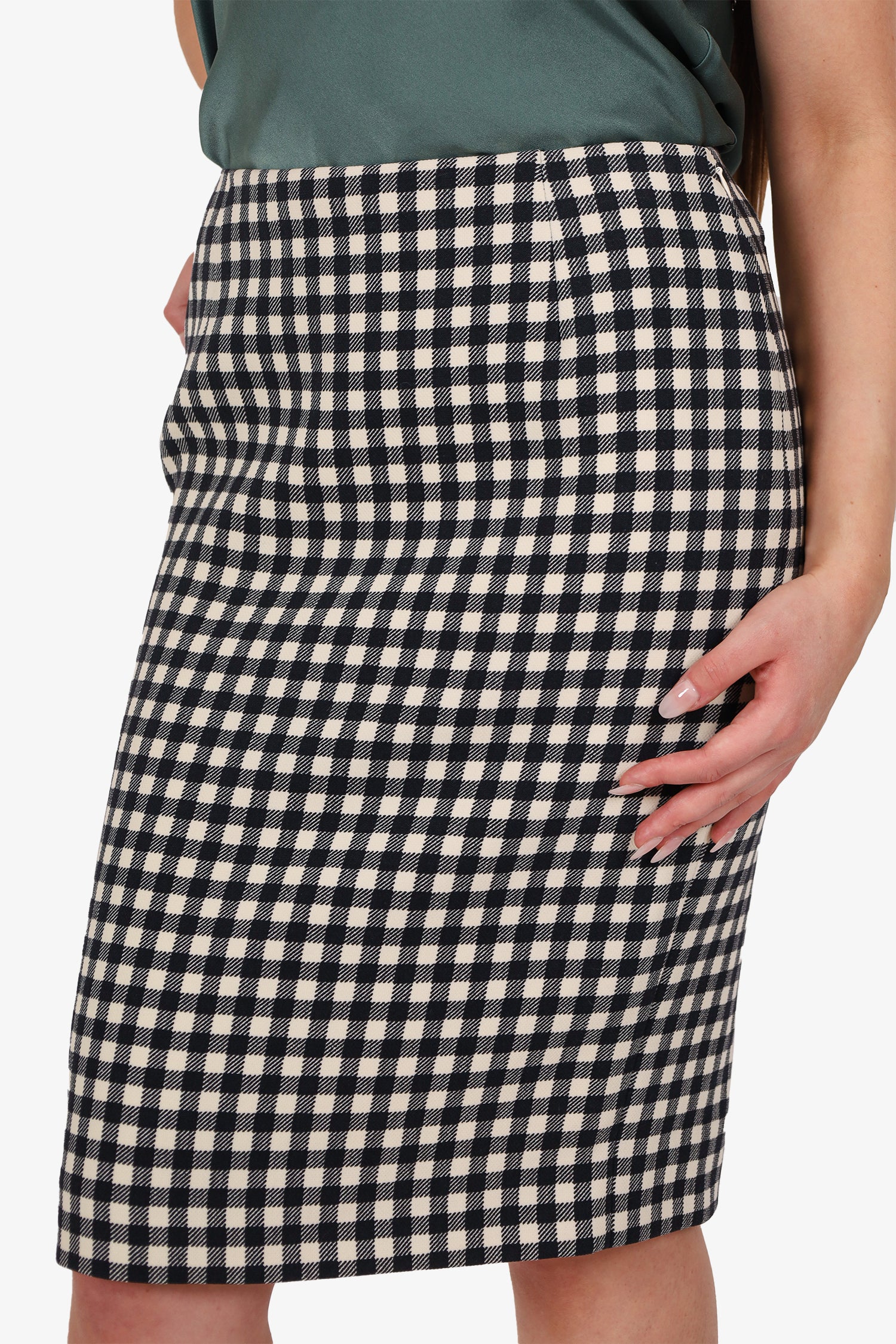 Refresh availabilityPrada Black/White Wool Check Mini Skirt. Slip-on. Side zip with hook closure. Split hem at rear. Lined interior. Tonal stitching.