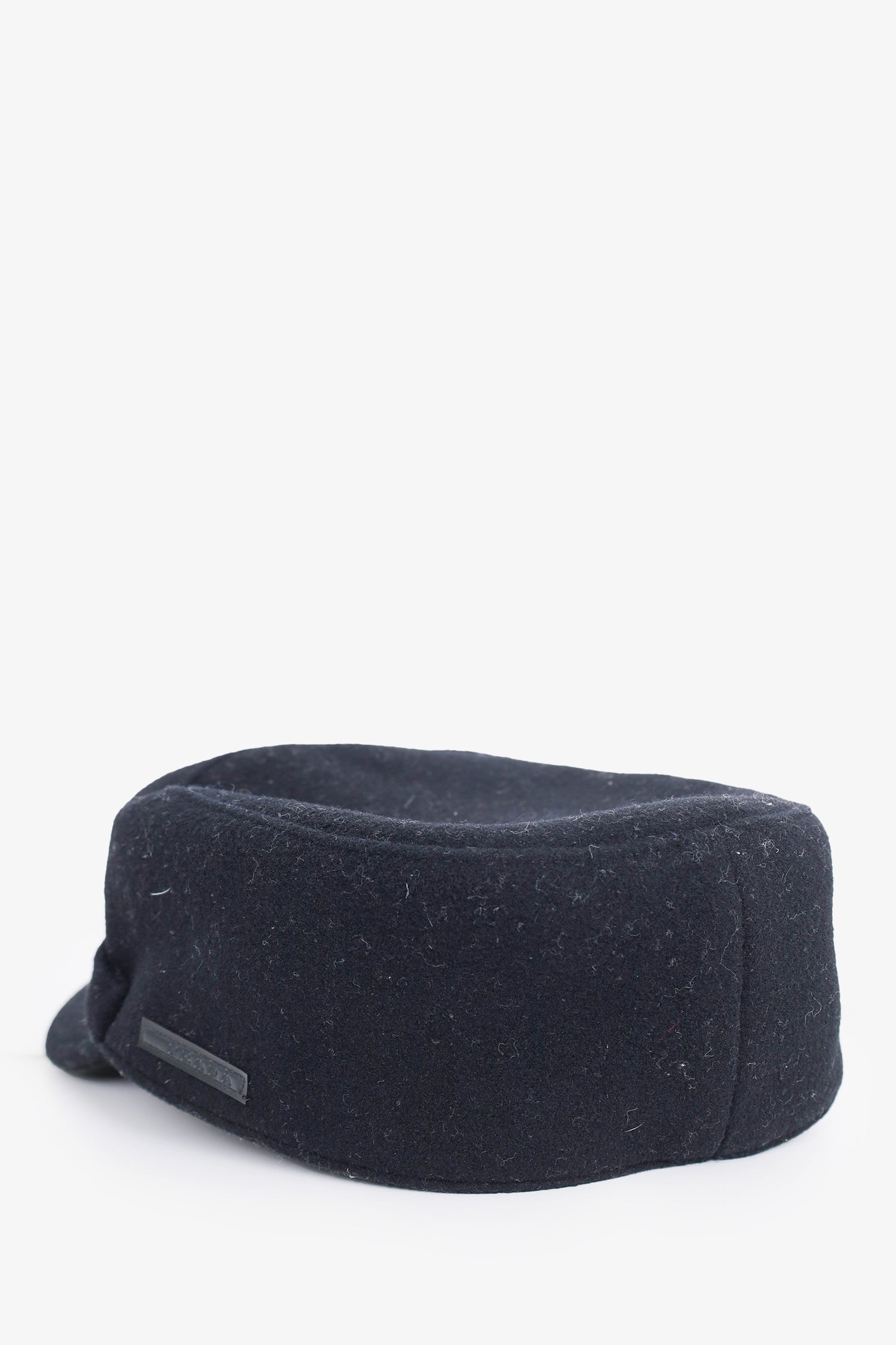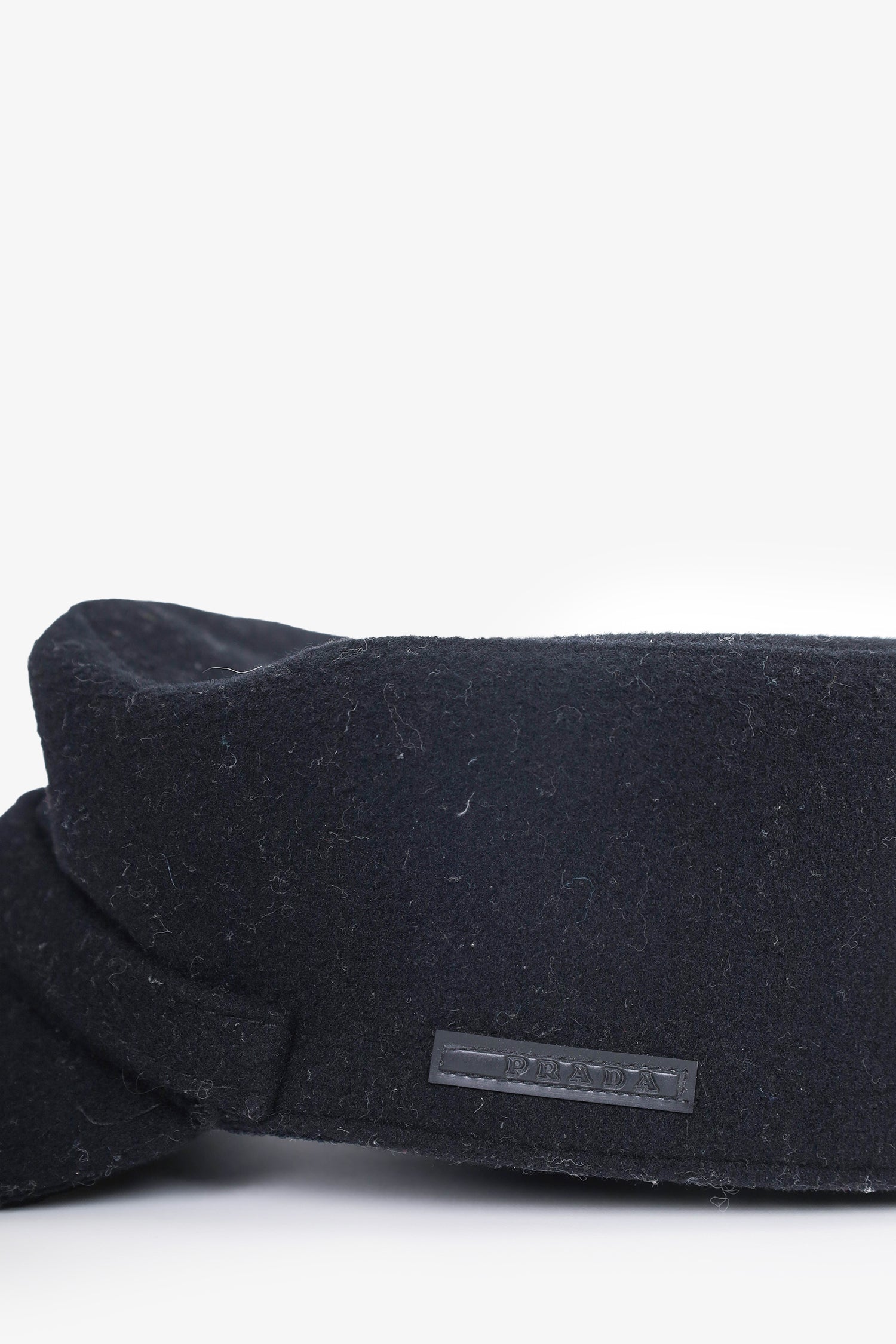 Refresh availabilityPrada Black Wool Newsboy Hat. Logo detailing on side. Tonal stitching.