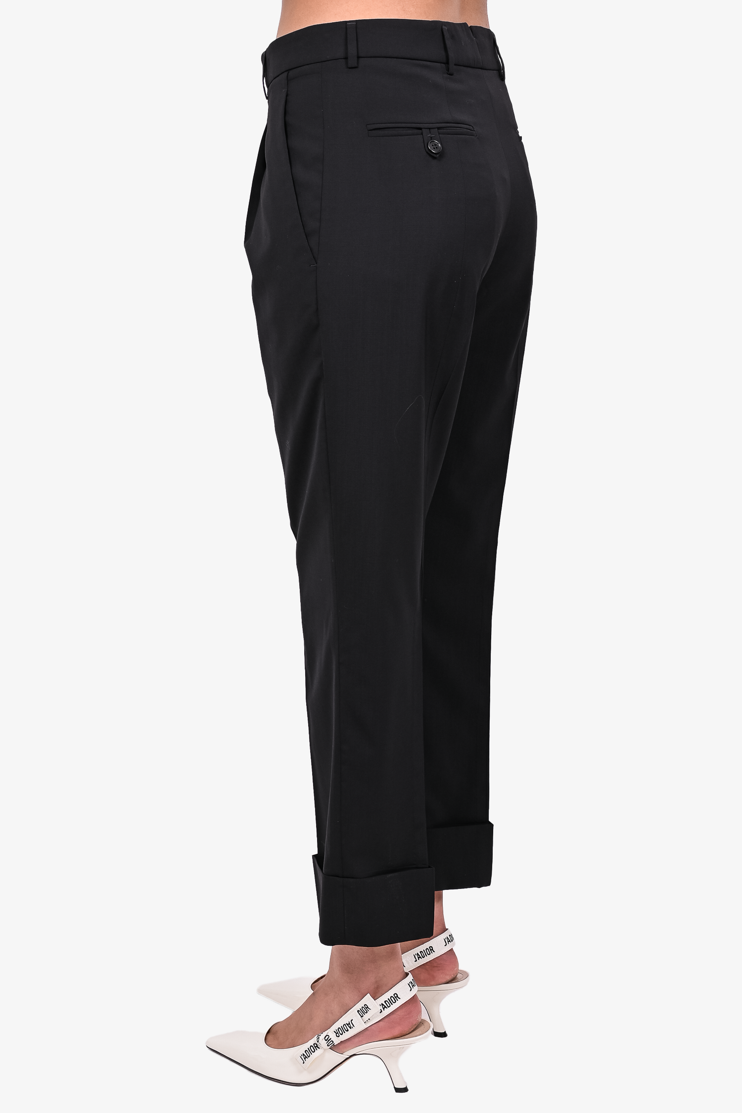 Refresh availabilityPrada Black Wool Rolled Trousers. Front button-up and hook closure. Front pockets. Waist belt loops. Tonal stitching.