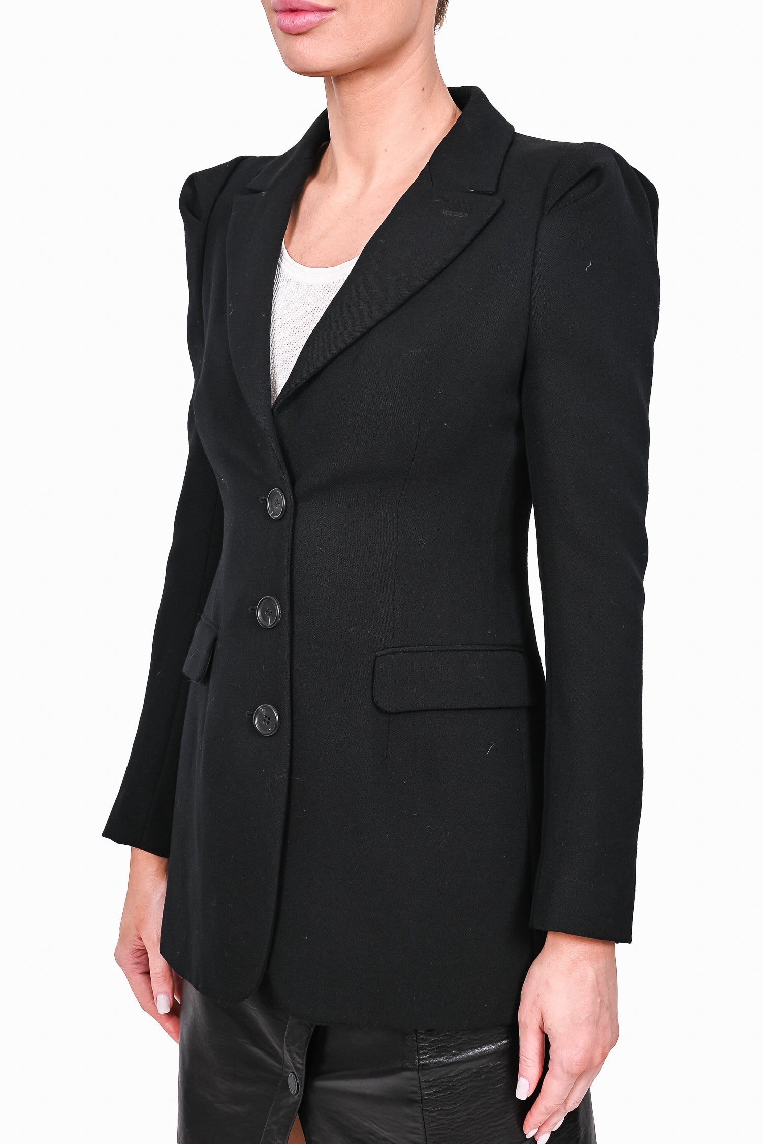 Refresh availabilityPrada Black Wool Single Breasted Blazer. Front button-up closure. Lined. Padded shoulders. Tonal stitching.