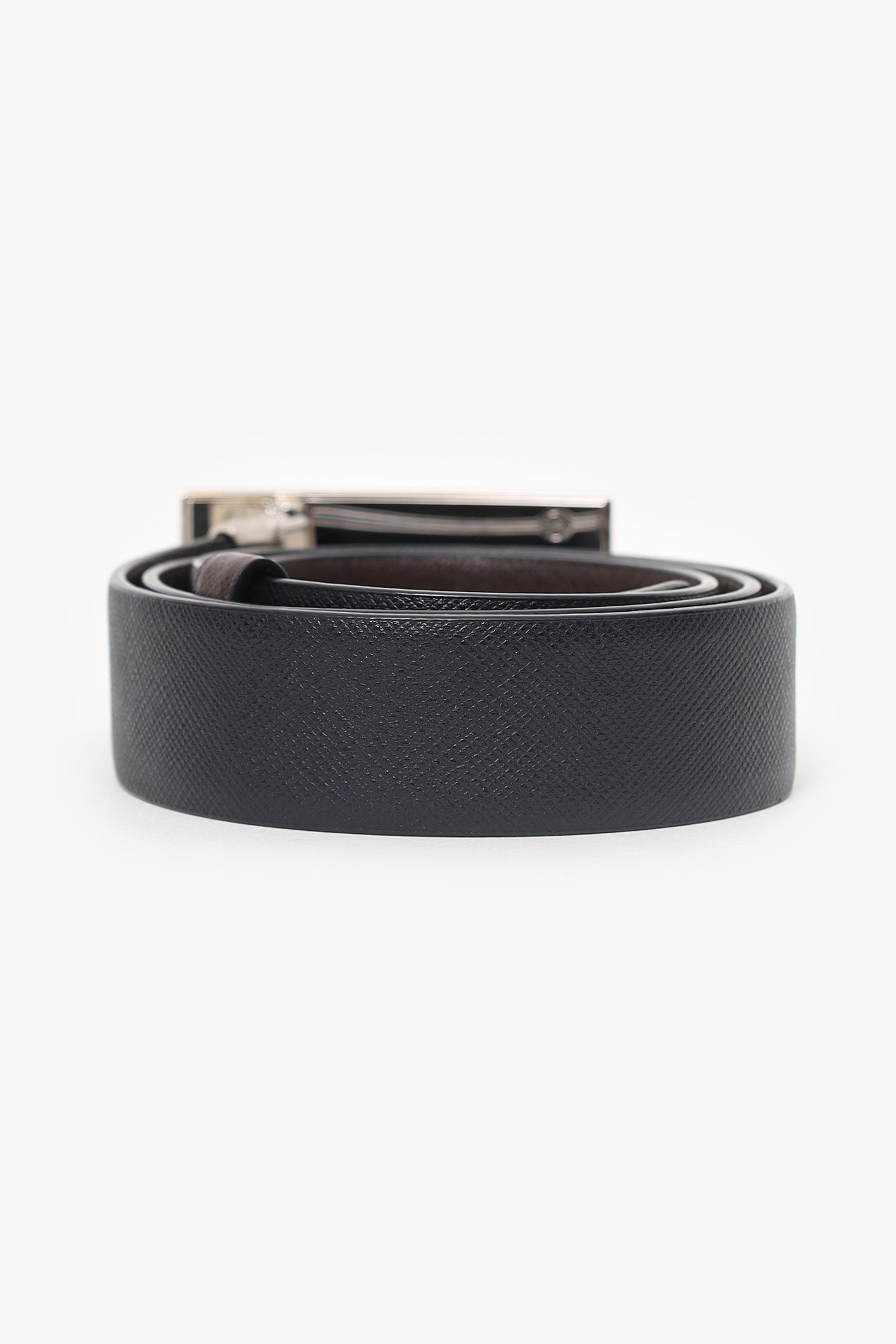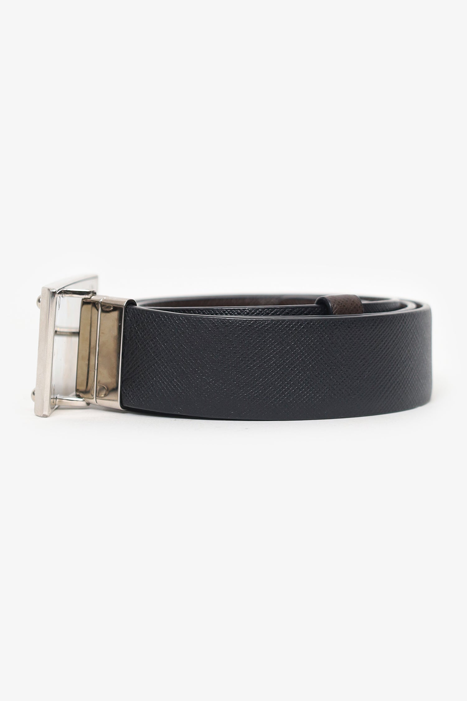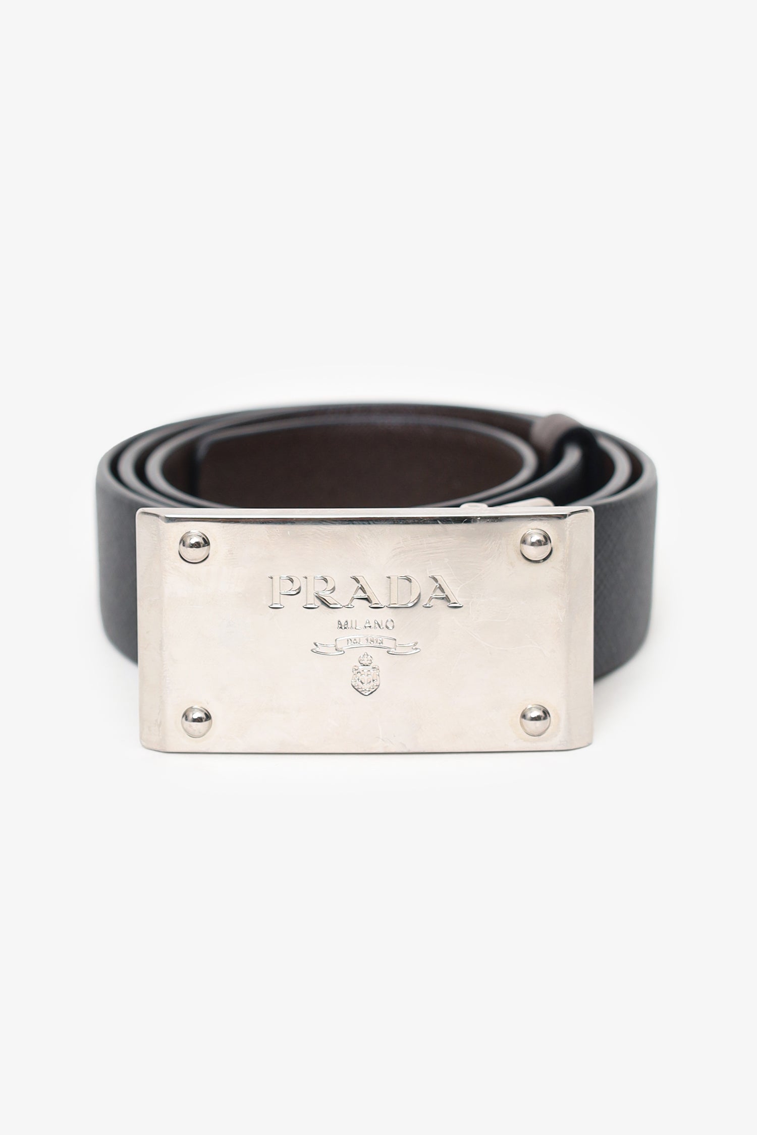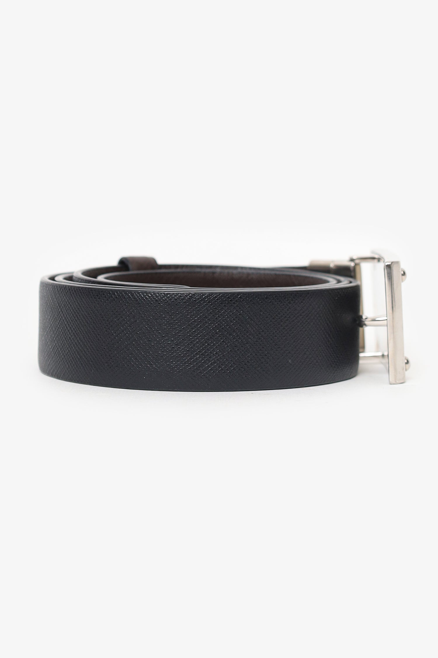 Refresh availabilityPrada Black/Brown Reversible Leather Belt. Adjustable pull-through push-pin closure. Tonal stitching. Silver-tone hardware.