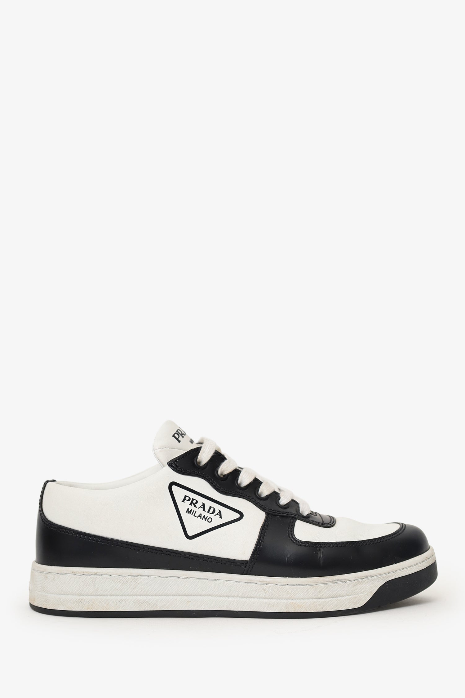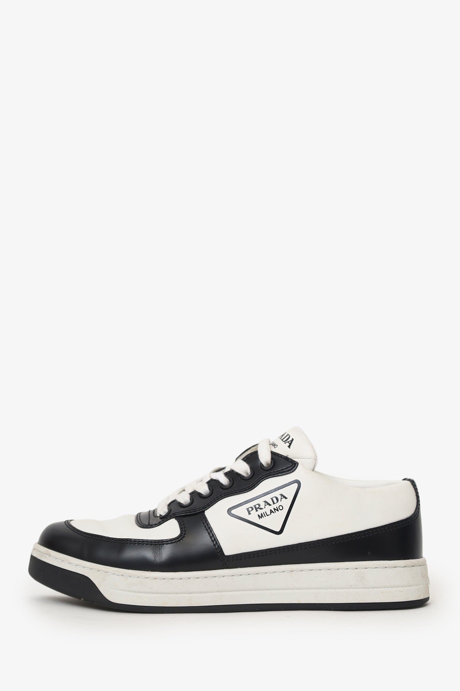 Refresh availabilityPrada Black/White Leather Logo Sneakers. Slip-on. Round toe. Front lace-up closure. Padded tongue. Tonal stitching.