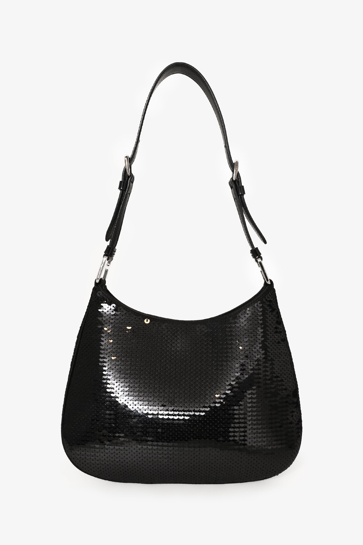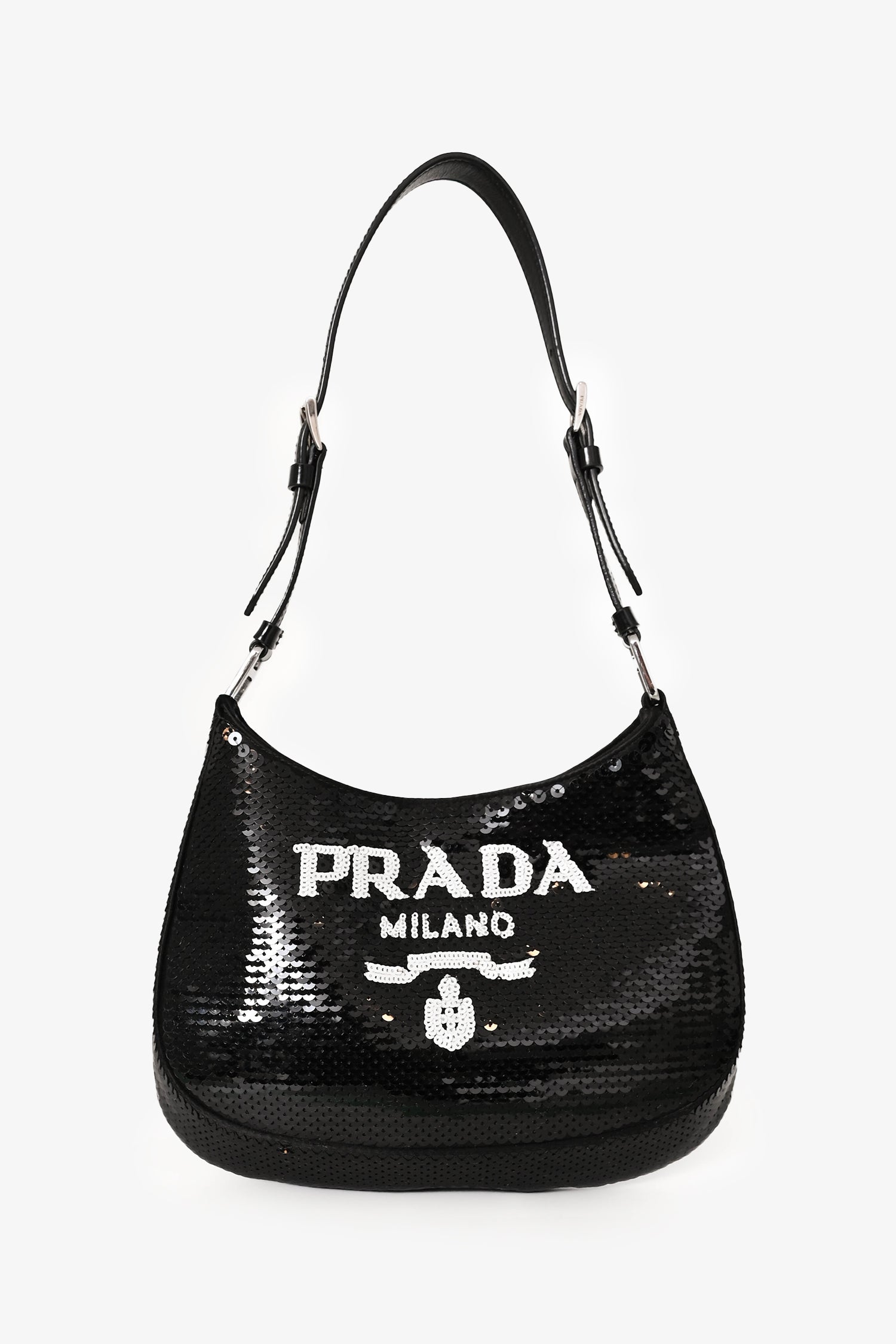 Refresh availabilityPrada Black/White Sequin 'Cleo' Small Shoulder Bag. Top interior magnetic button closure. Adjustable strap. Tonal textile interior lining. Single interior wall slip pocket. Silver-tone hardware. Tonal stitching.