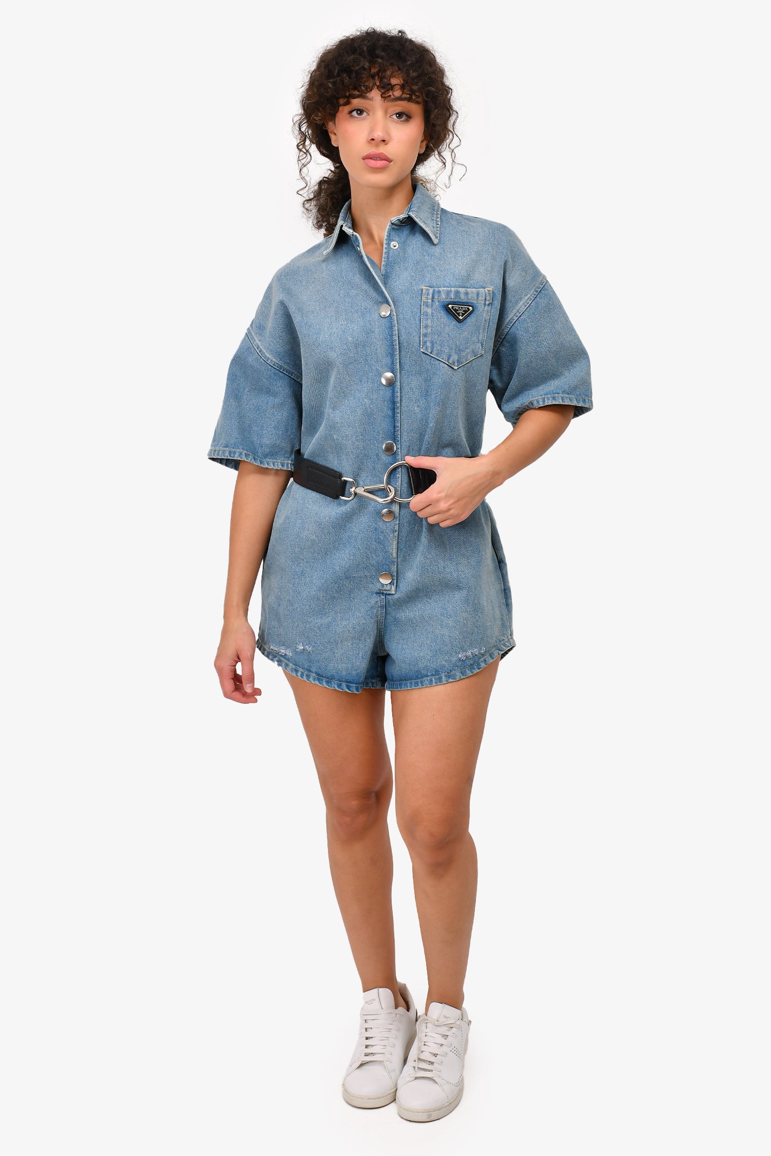 Refresh availabilityPrada Blue Denim Button-Up Playsuit. Light-wash denim. Silver-tone hardware. Snap-on button closure. Two side pockets and one breast pocket. Distressing on the hem. Contrast stitching. *Belt not included