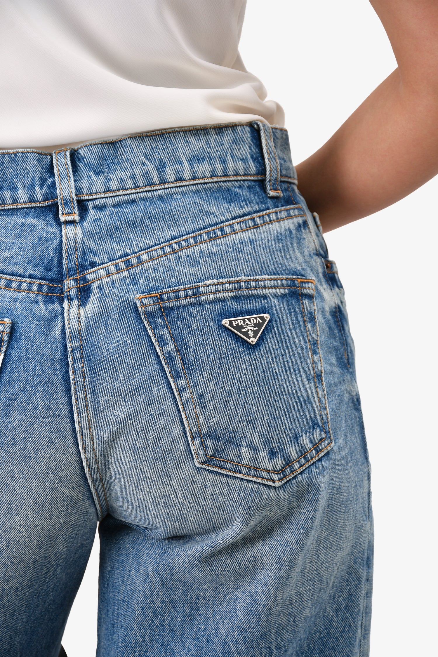 Refresh availabilityPrada Blue Denim 'Mans Fit' Jeans Size 26. Front button and zipper closure. Back pocket hardware detailing. Silver-tone hardware. Mid waist. Tonal stitching.