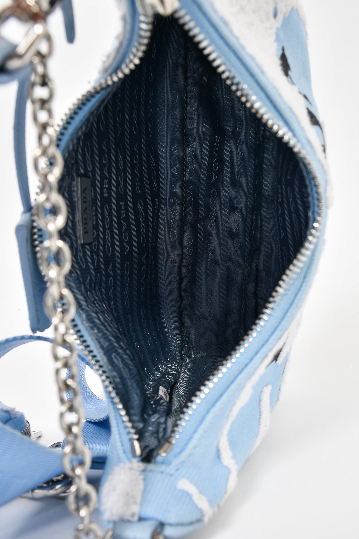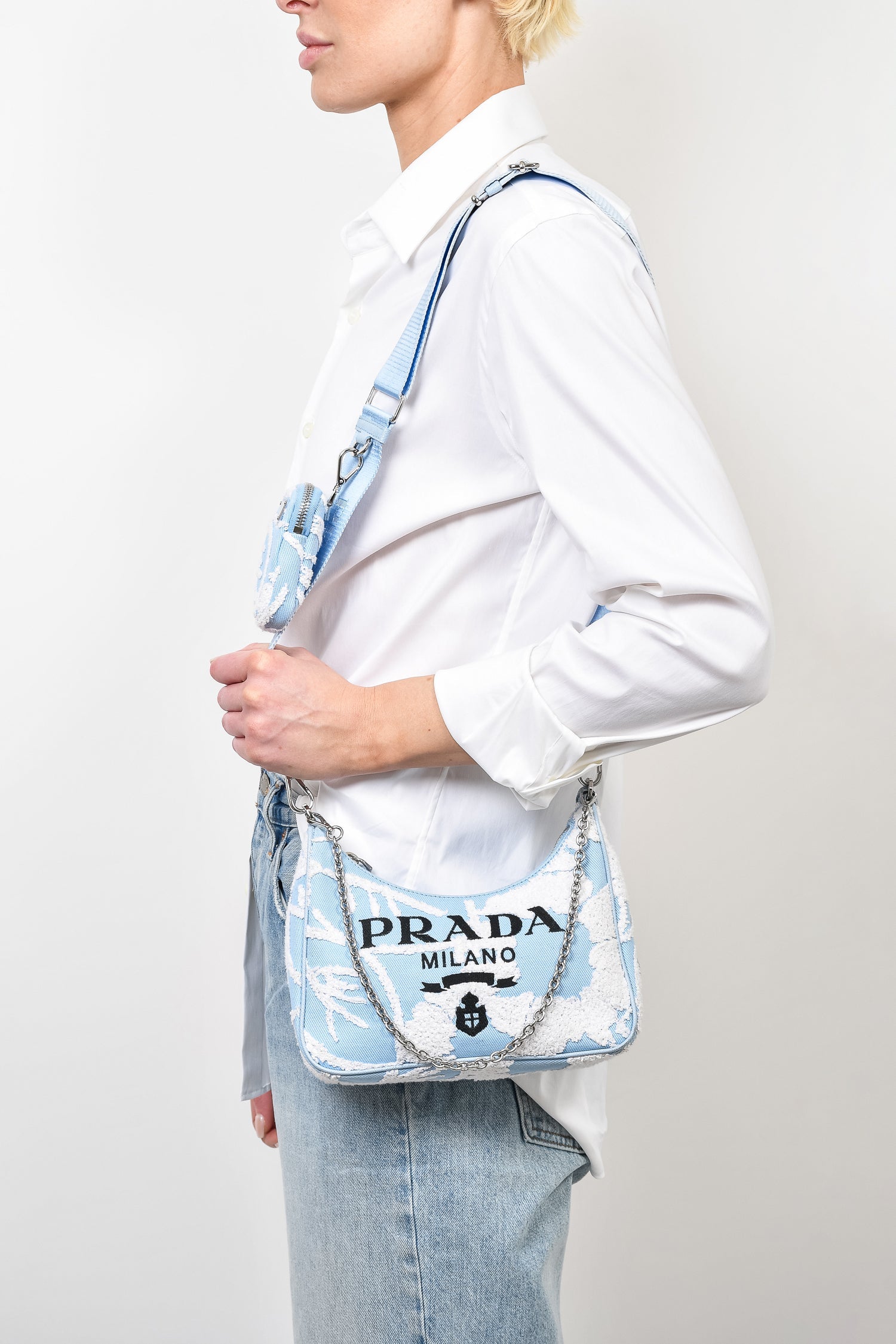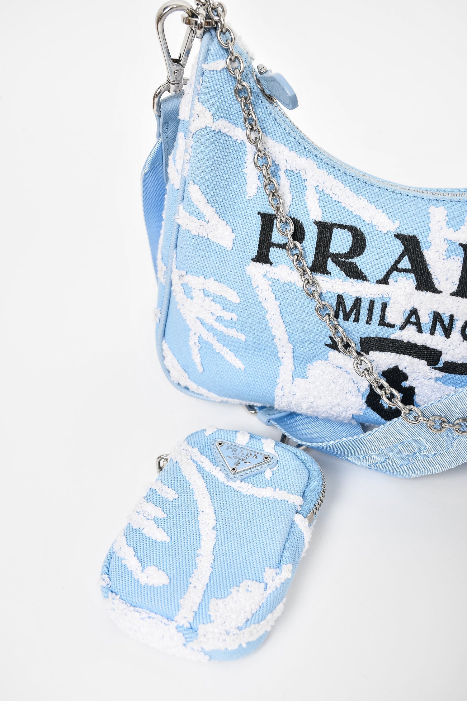 Refresh availabilityPrada Blue Embroidered Drill Re-Edition 2005 Shoulder Bag. Top zip closure. Removable shoulder chain. Removable adjustable crossbody strap with pouch. Blue interior lining. Silver-tone hardware. Tonal stitching.