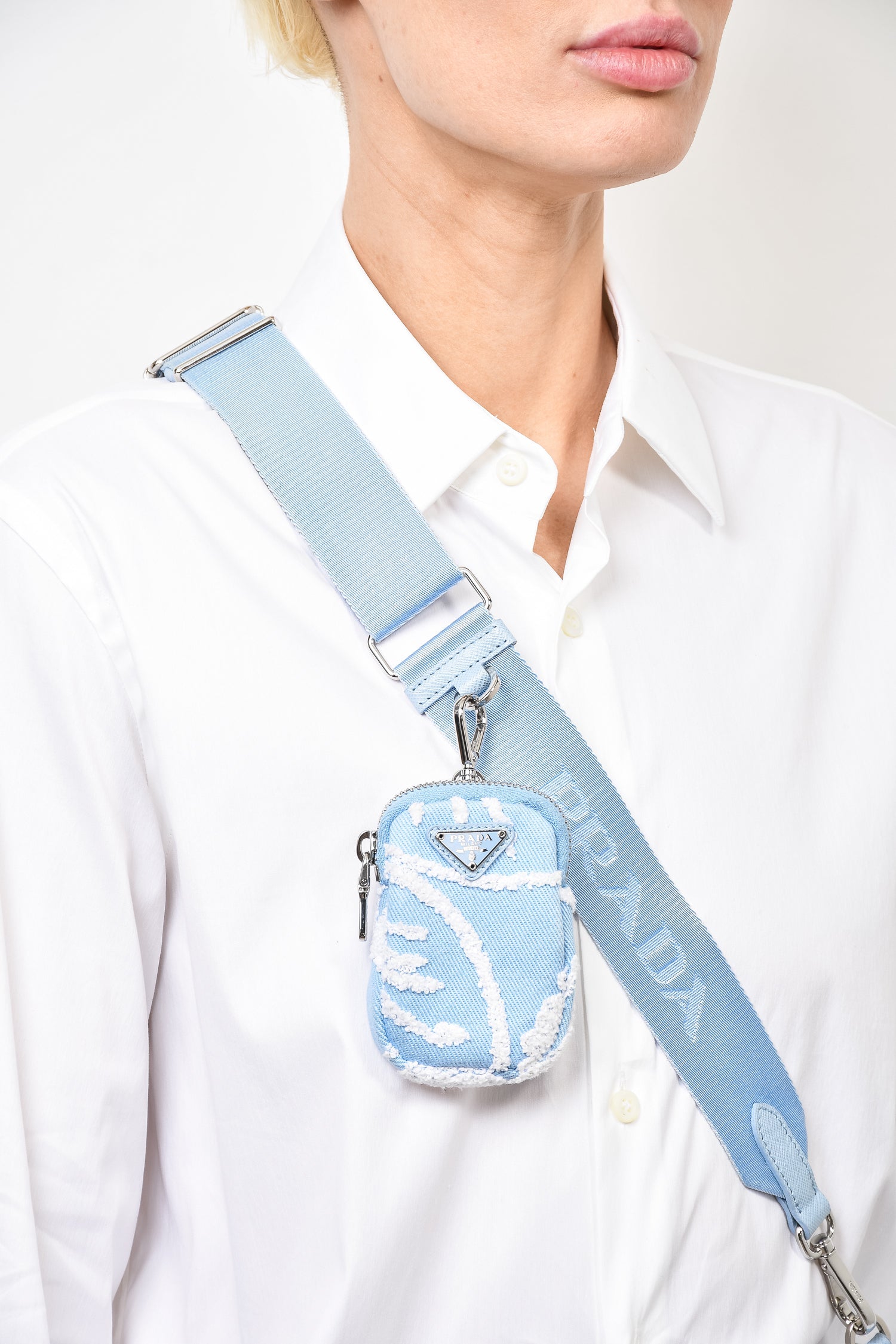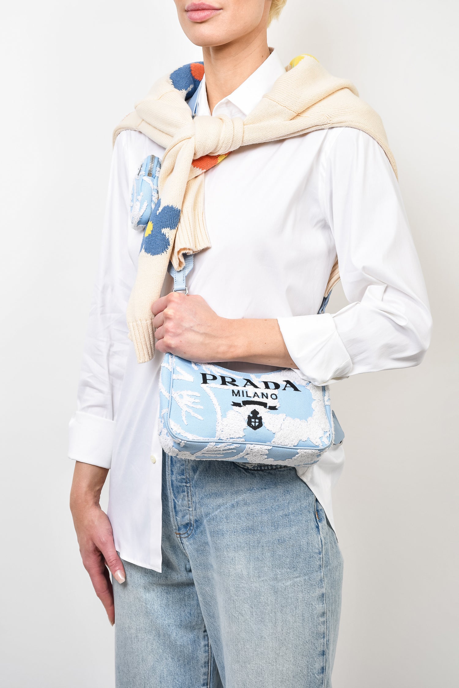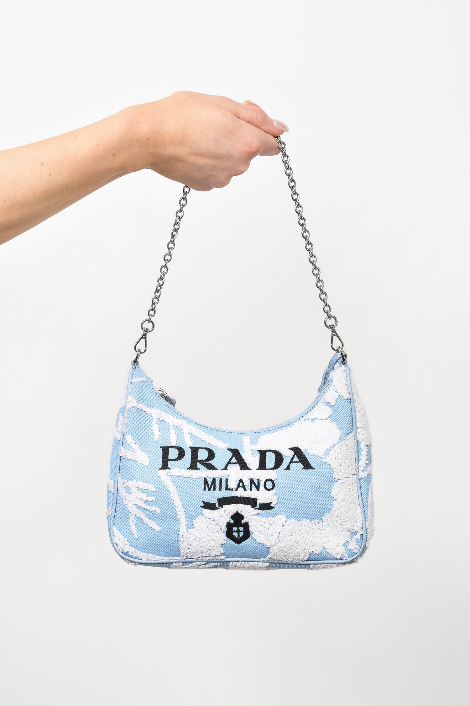 Refresh availabilityPrada Blue Embroidered Drill Re-Edition 2005 Shoulder Bag. Top zip closure. Removable shoulder chain. Removable adjustable crossbody strap with pouch. Blue interior lining. Silver-tone hardware. Tonal stitching.