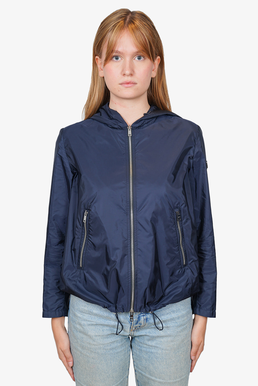 Refresh availabilityPrada Blue Nylon Hooded Raincoat. Hooded neckline with drawstring. Front zip closure. Front zip pockets. Waist drawstring. Silver hardware. Tonal stitching.