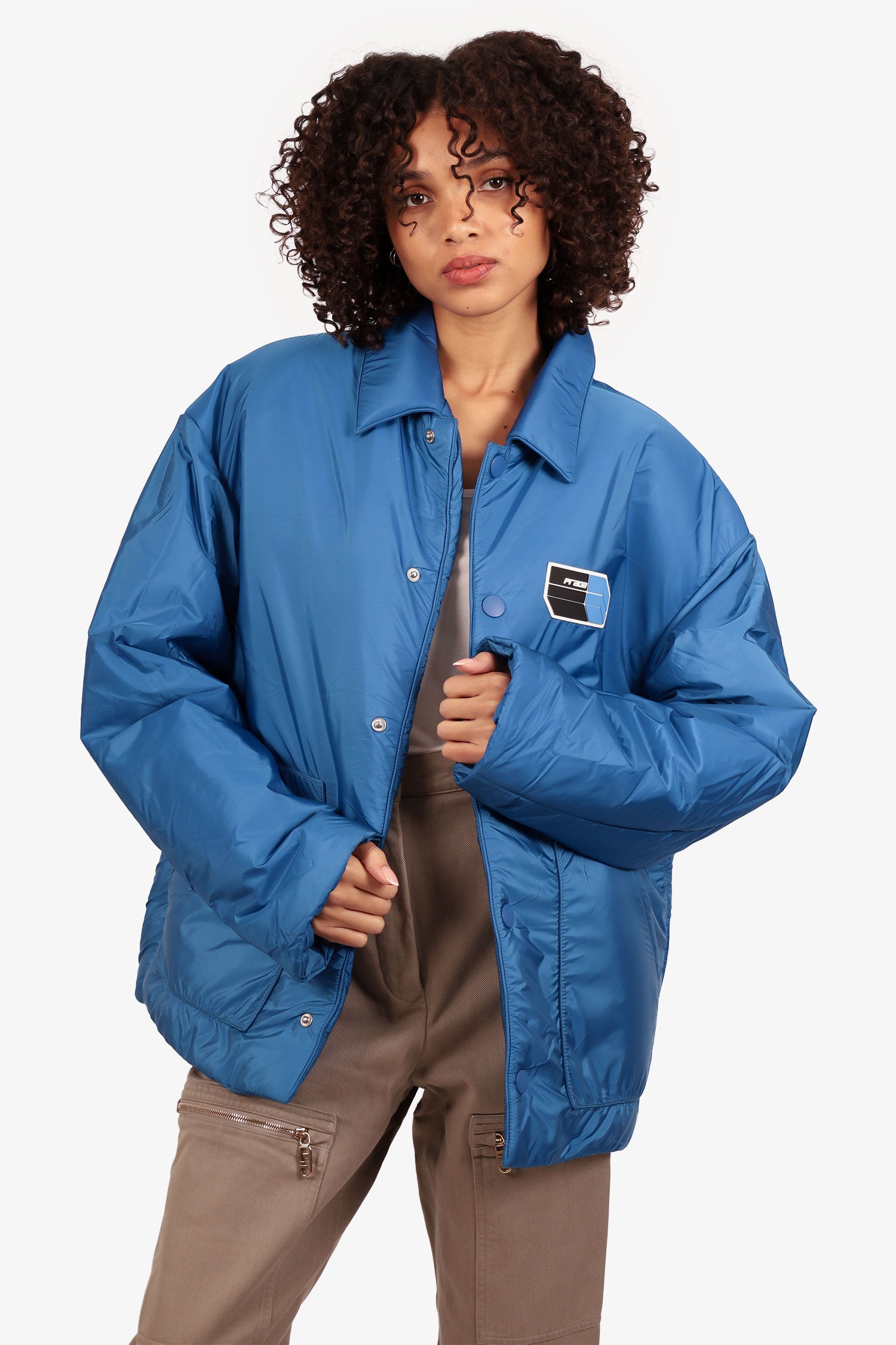 Refresh availabilityPrada Blue Padded Nylon Logo Patch Jacket. Collared-neckline. Front snap-button-up closure. 2 front exterior side slip pockets. 3 interior pockets; 1 zip, 1 with snap button closure, 1 with button closure. Silver-tone hardware. Tonal stitching.