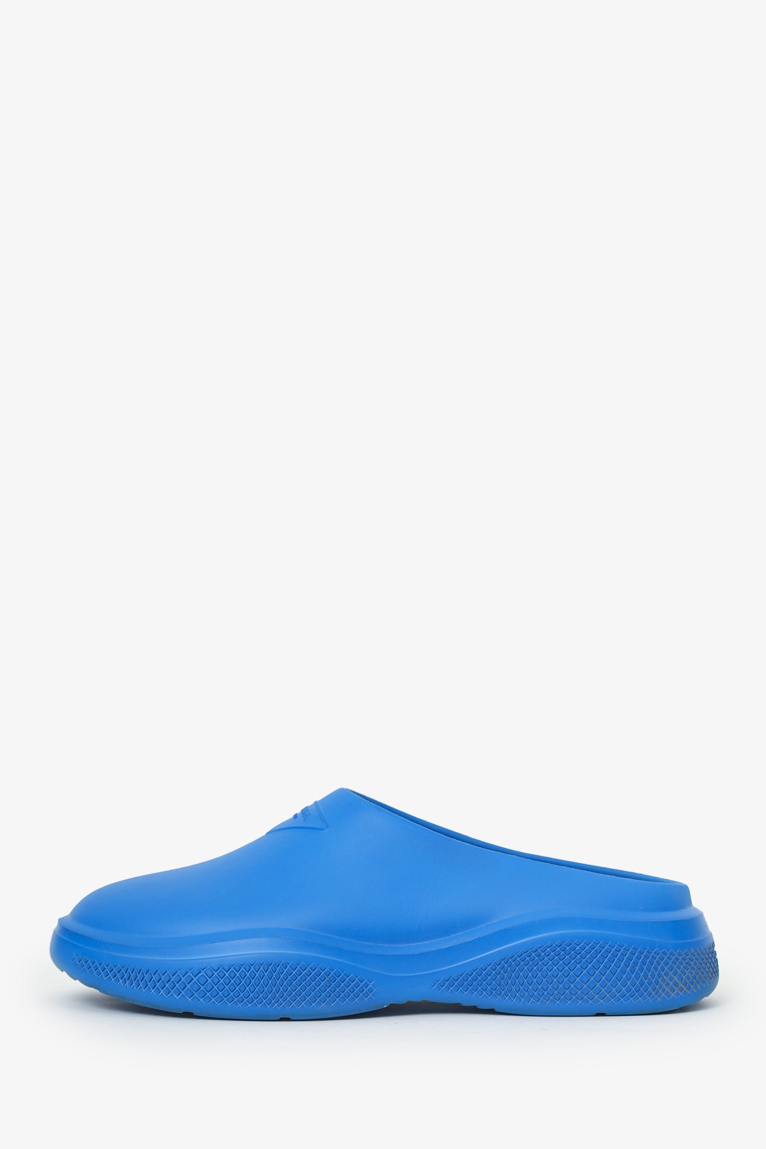 Refresh availabilityPrada Blue Rubber Mellow Logo-embellished Slides. Slip-on. Rounded toe. Logo detail to front.