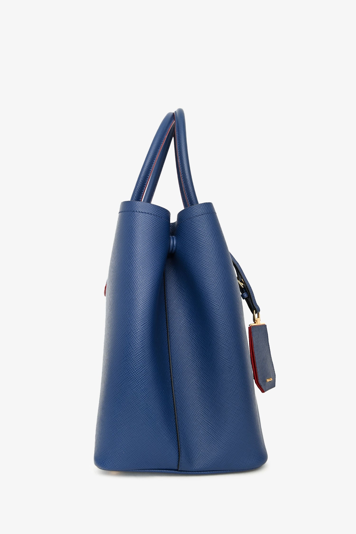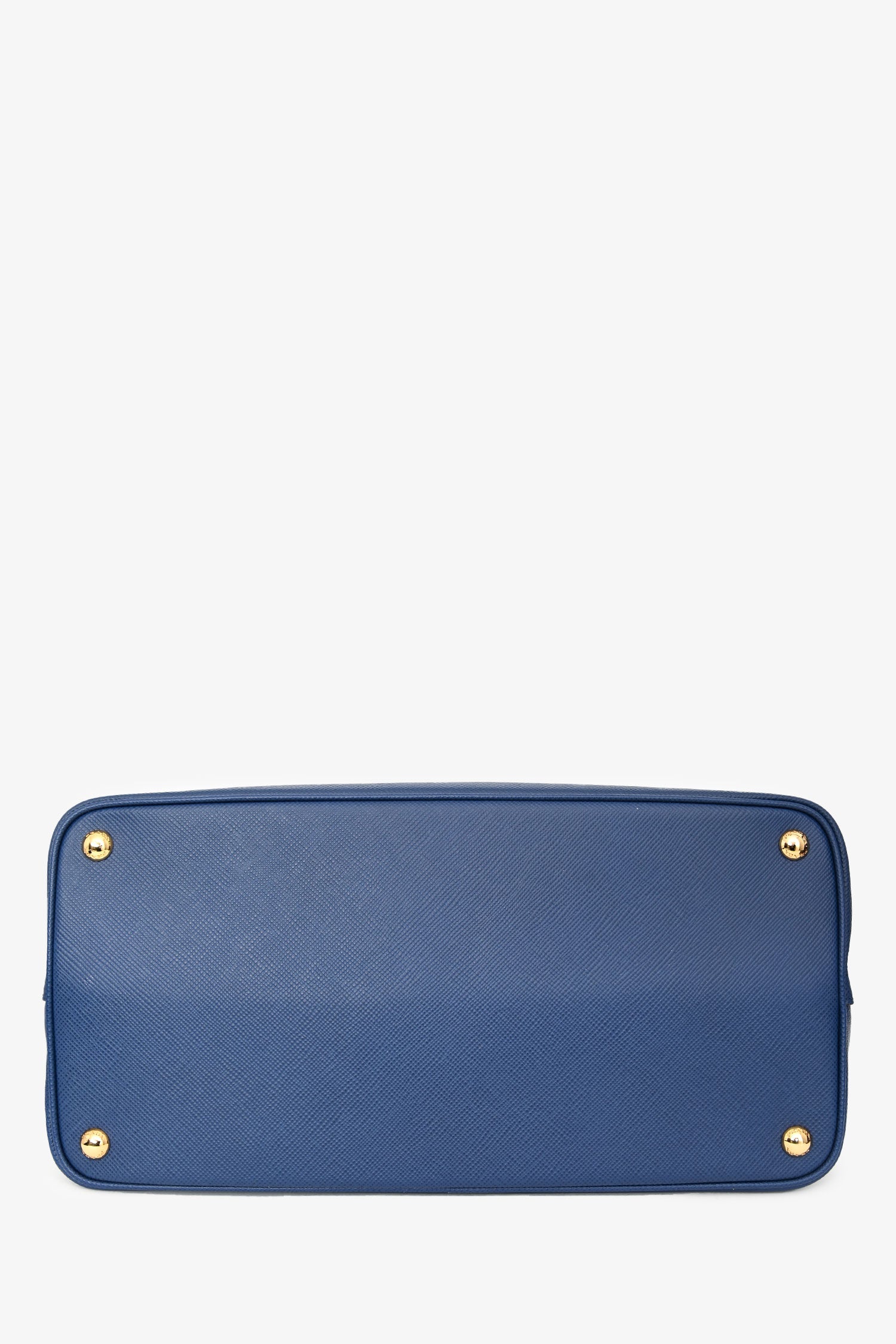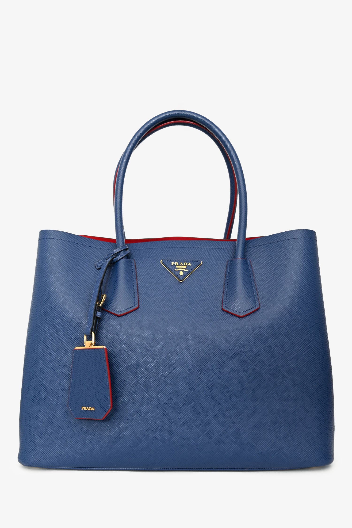 Refresh availabilityPrada Blue Saffiano Cuir Medium Double Tote. Dual handles. Protective base studs. Detachable and adjustable strap. 3 interior compartments; 2 open, 1 with fold-over flap and magnetic button closure. Leather-lined interior. Detachable luggage tag. Gold-tone hardware. Tonal stitching.