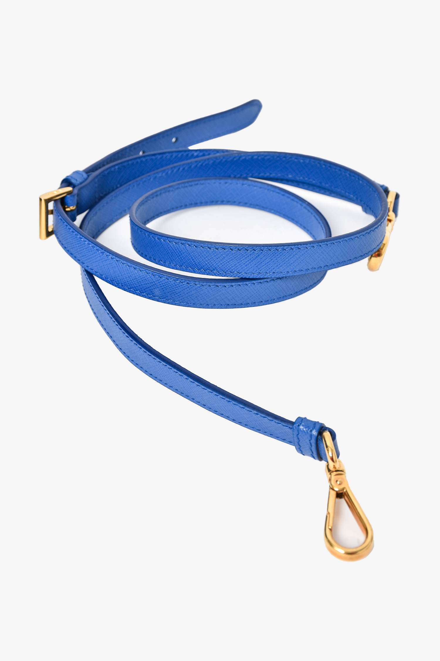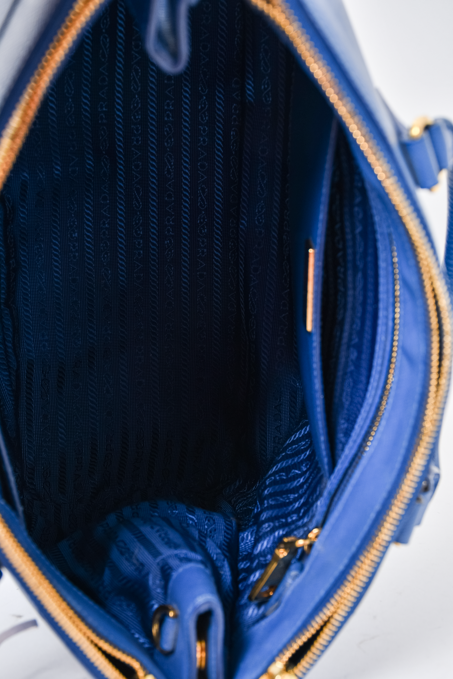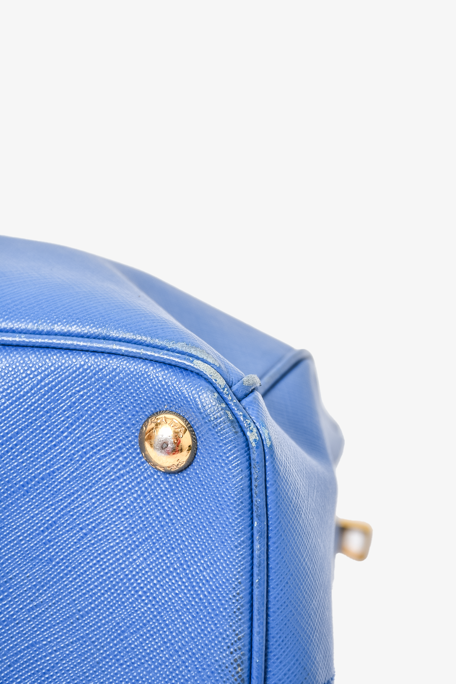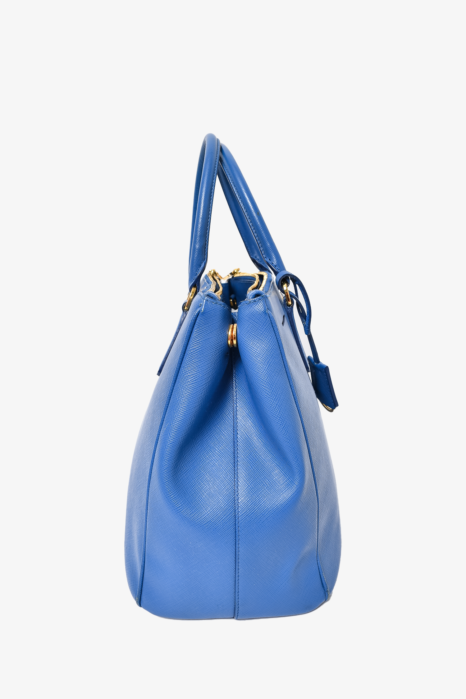 Refresh availabilityPrada Blue Saffiano Leather Large Galleria Tote Bag with Strap. Dual rolled handles. Top zip closures. Tonal textile logo'd interior lining. 3 interior wall pockets; 2 open and 1 with zip closure. Protective metal bottom. Gold-tone hardware. Removable and adjustable strap. Tonal stitching.