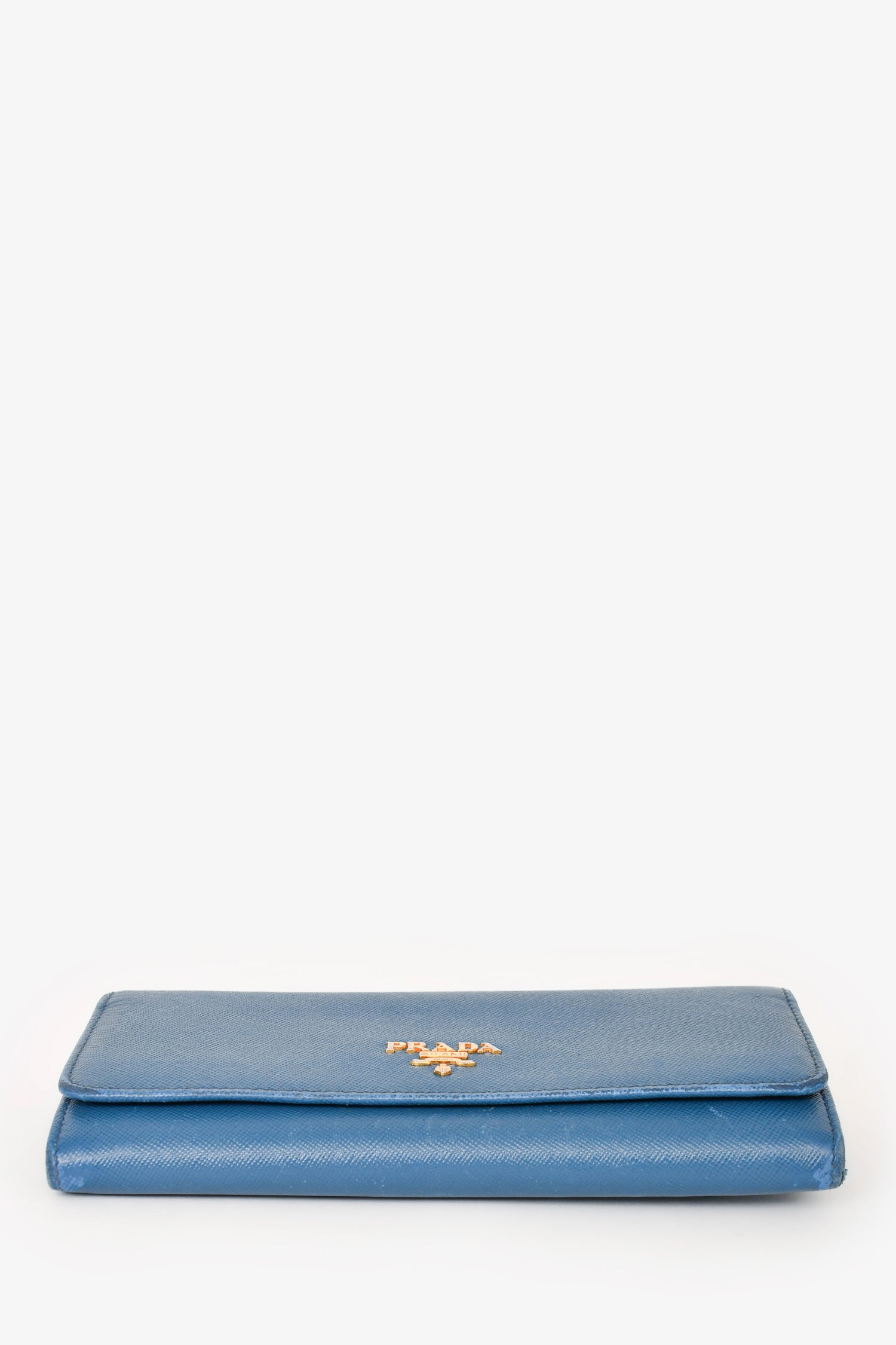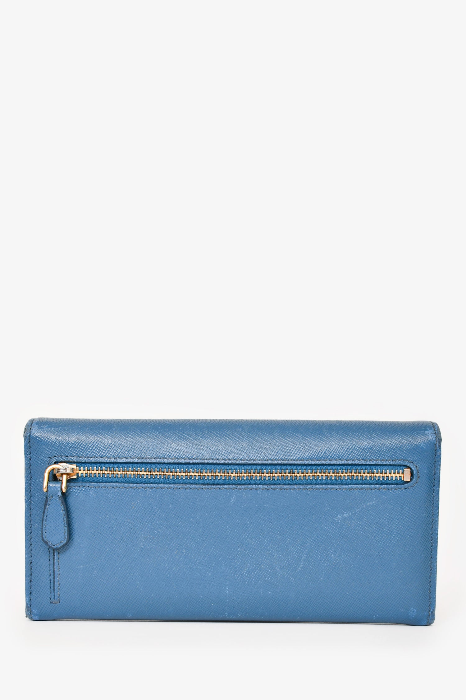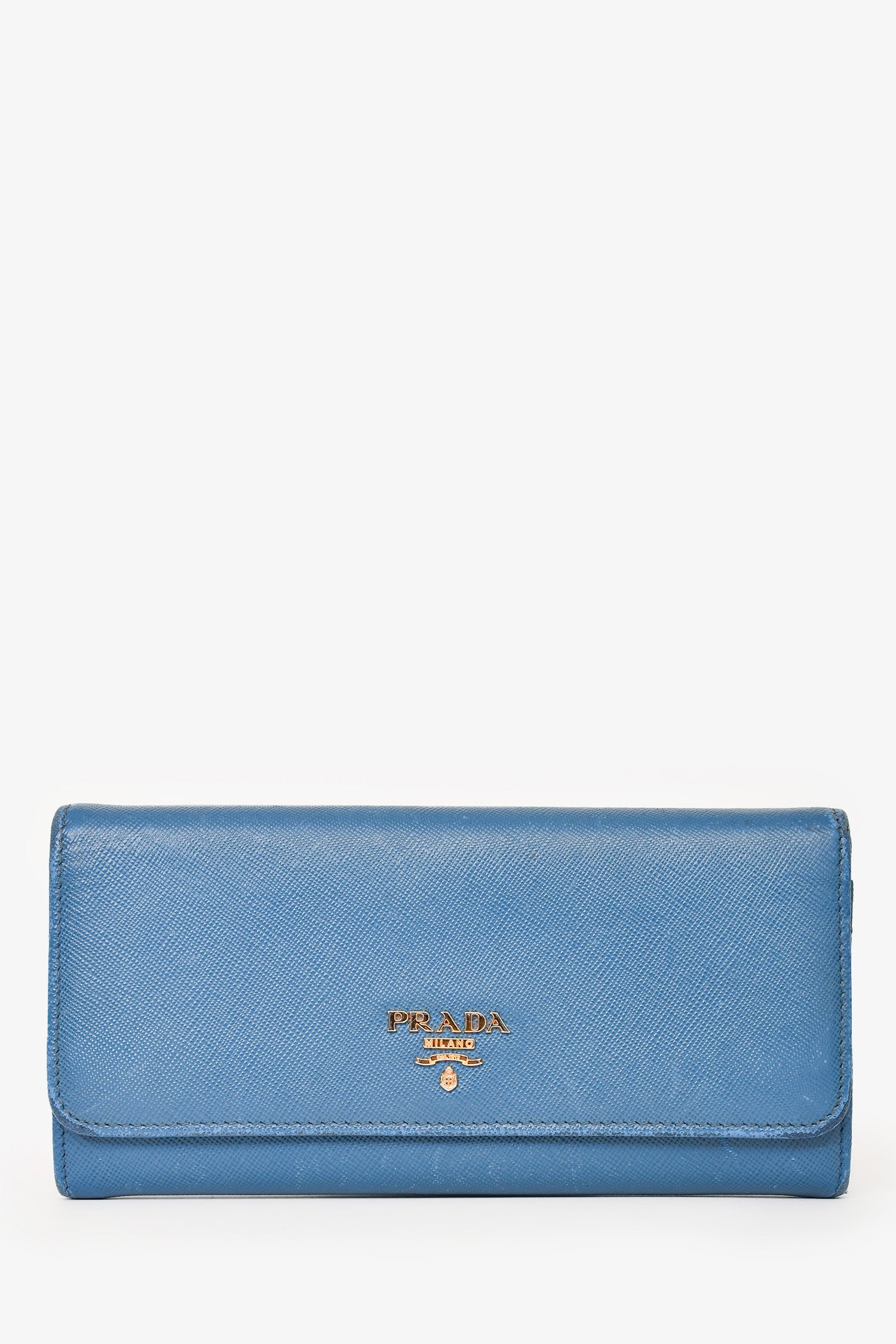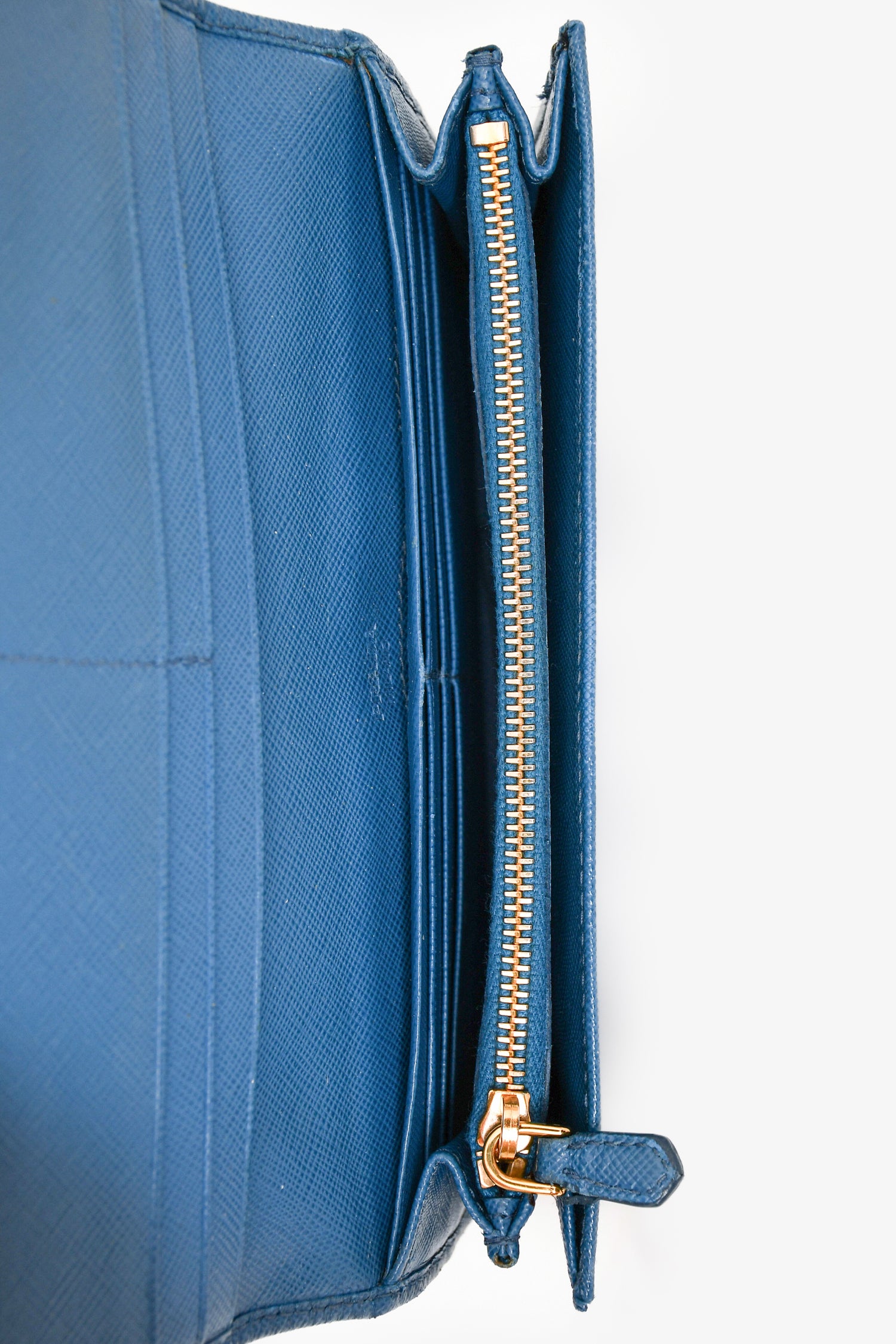 Refresh availabilityPrada Blue Saffiano Leather Long Wallet. Fold over flap with snap button closure. Multiple interior card slots. Two open compartments and one zipped. One exterior zip pocket. Lampo zipper. Gold-tone Prada logo detail. Tonal stitching.