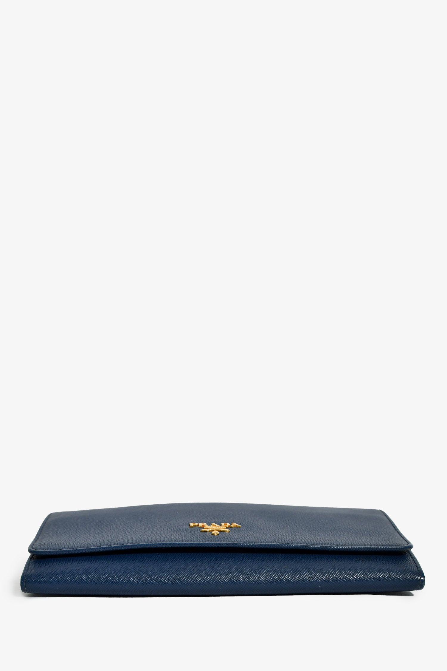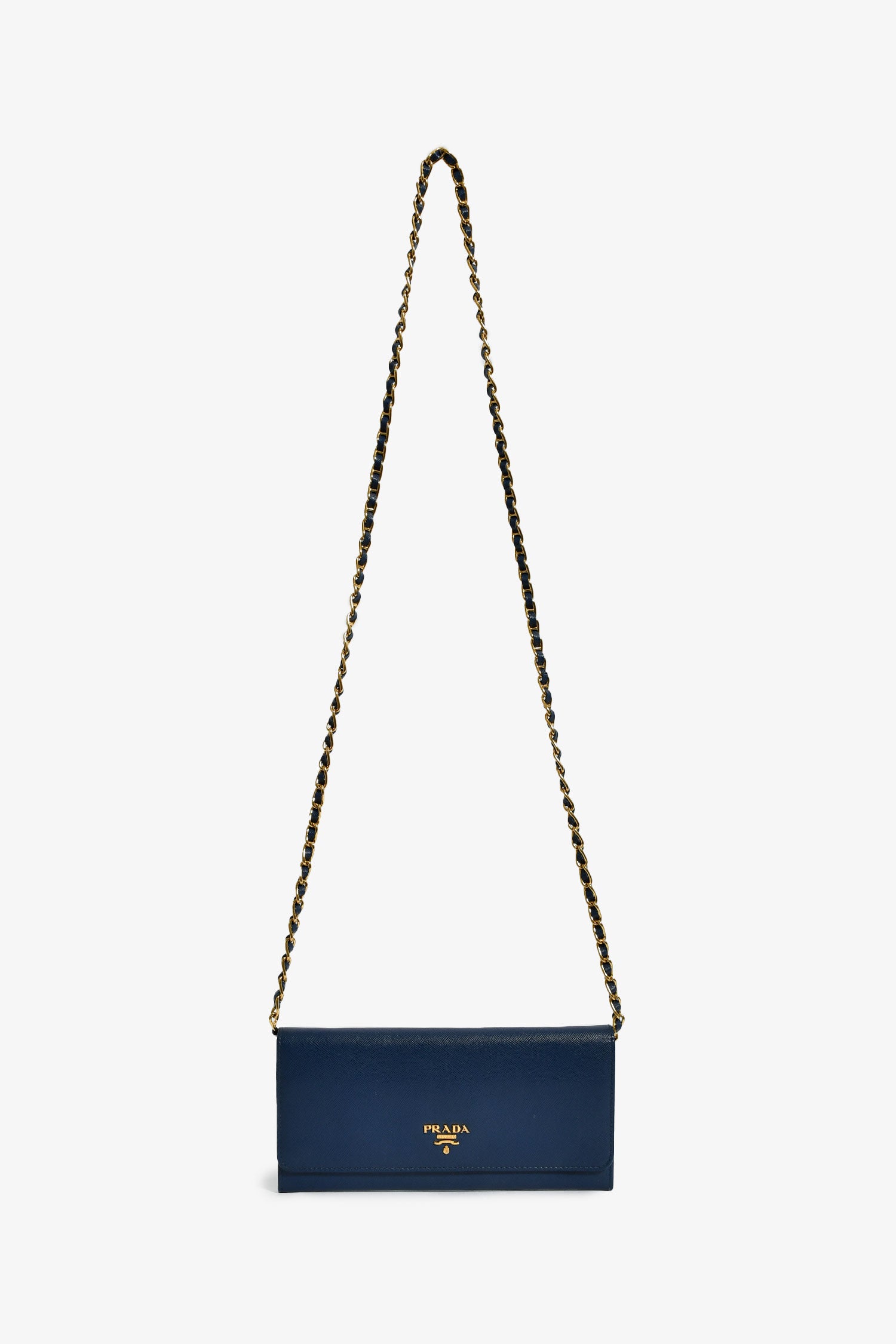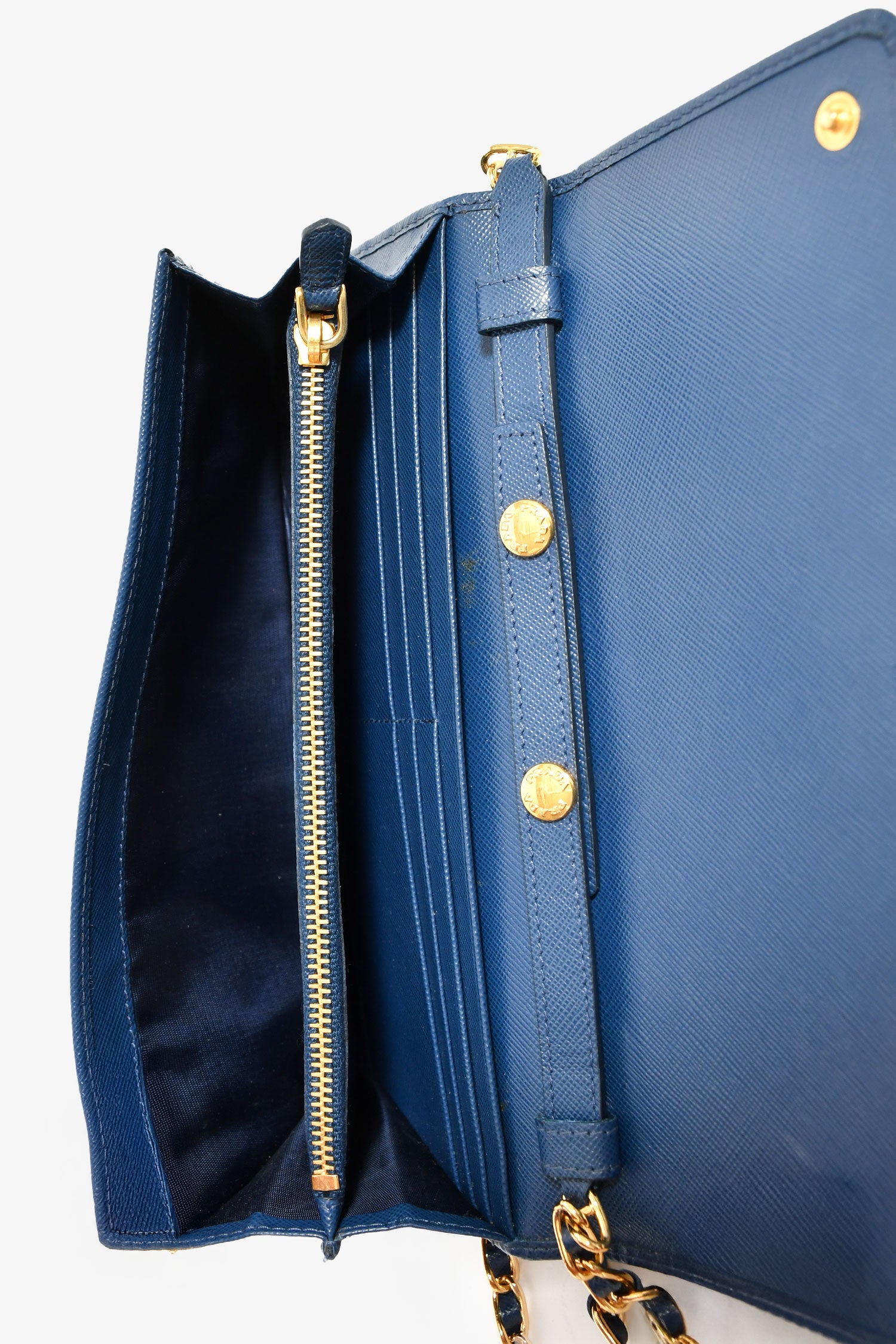 Refresh availabilityPrada Blue Saffiano Wallet On Chain. Front fold-over flap with snap button closure. 12 compartments: 2 front exterior slip pockets; 6 card slots, 2 cash slots, middle zip pocket, interior wall slip pocket. Detachable strap. Gold-tone hardware. Tonal stitching.