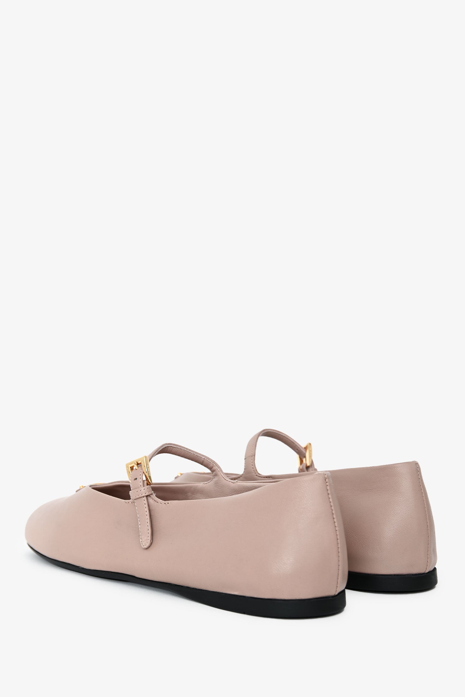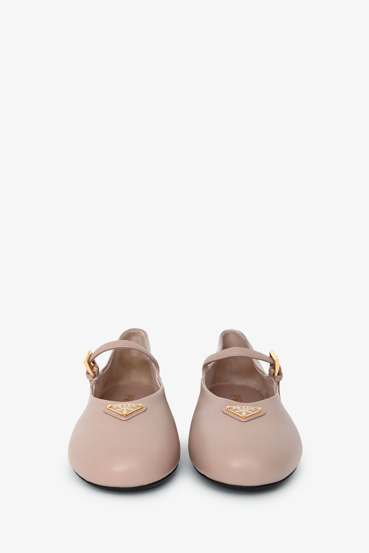 Refresh availabilityPrada Blush Leather Mary Jane Ballet Flats. Slip-on. Round toe. Leather-lined interior. Gold-tone hardware. Tonal stitching.