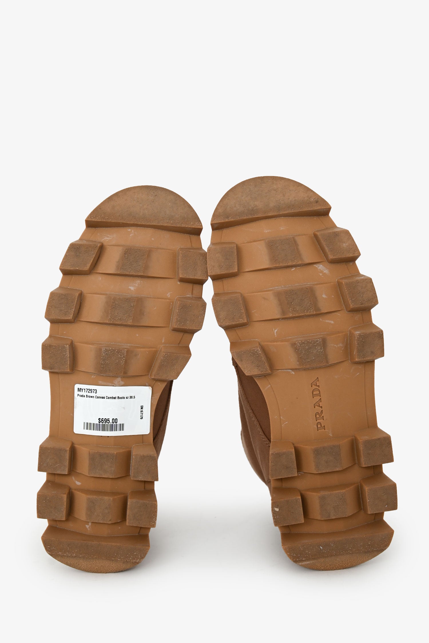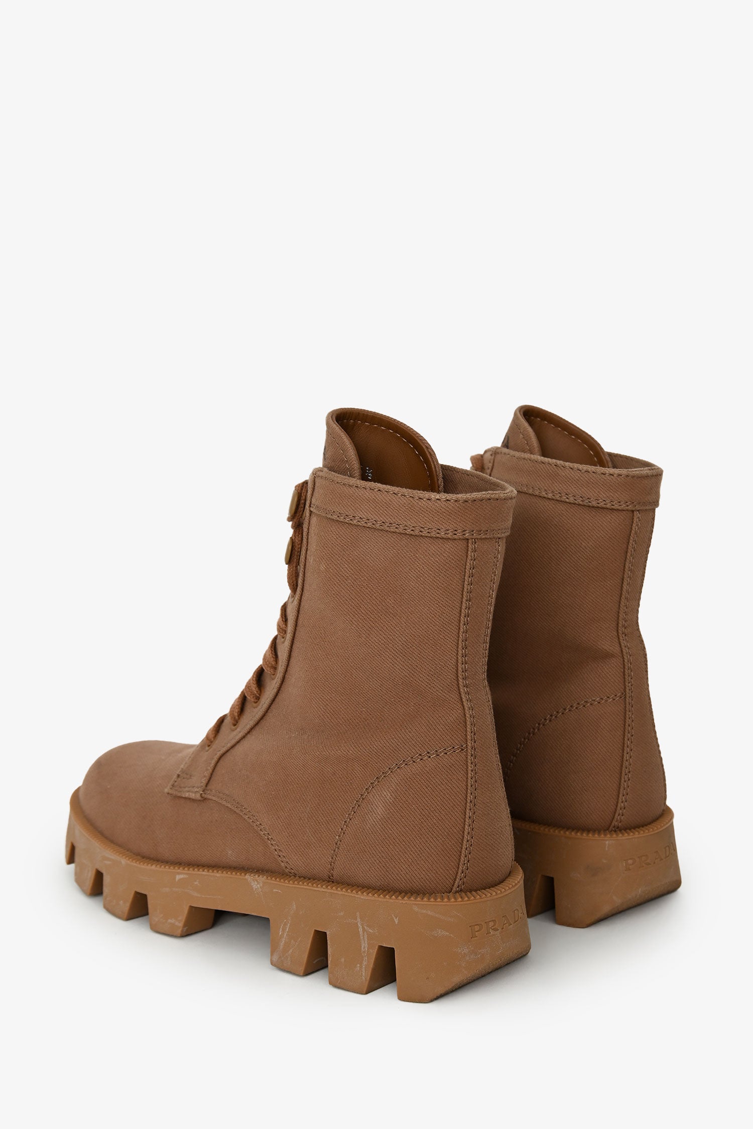 Refresh availabilityPrada Brown Canvas Combat Boots. Round toe. Front lace-up closure. Tonal hardware and stitching.