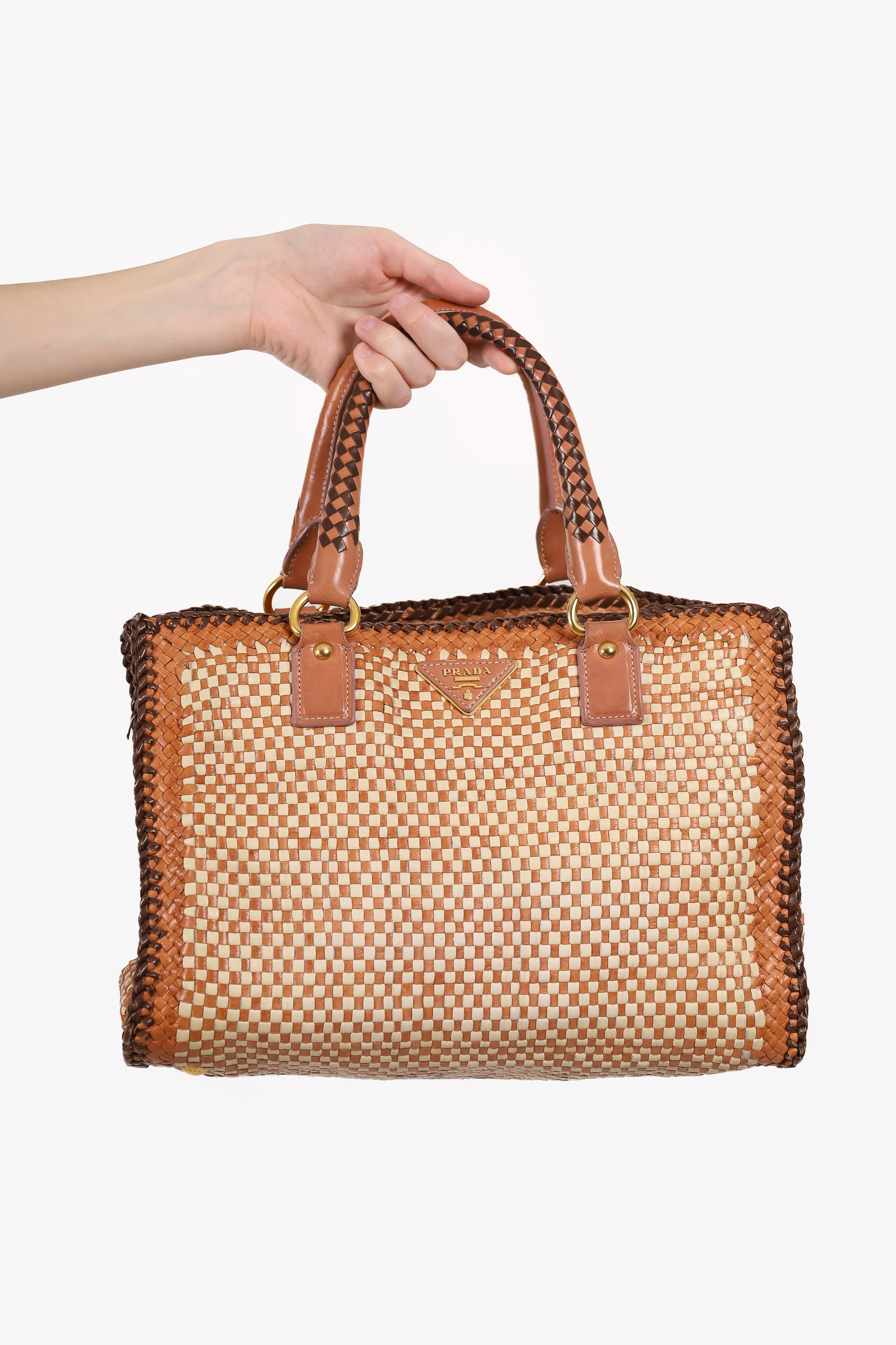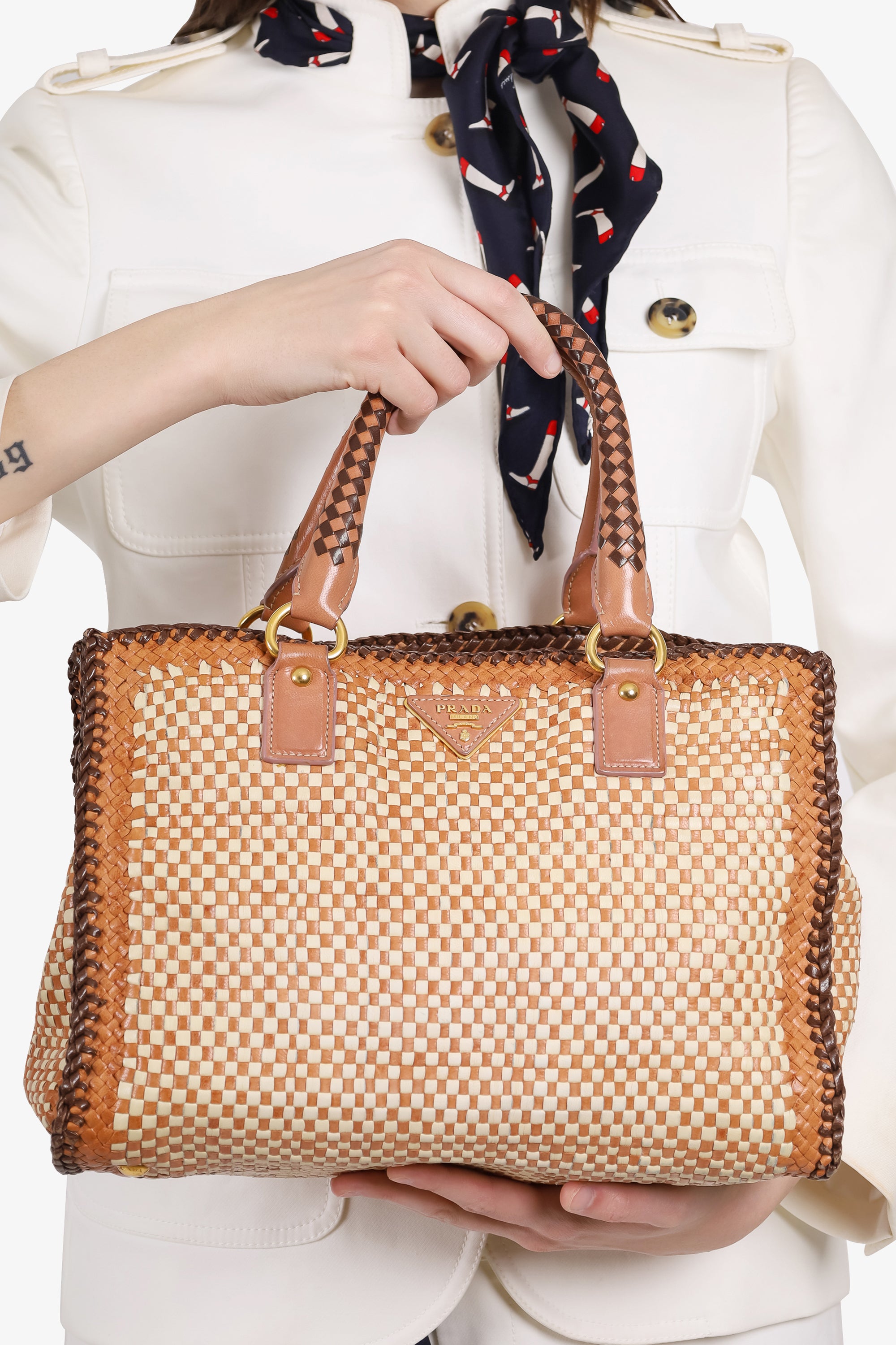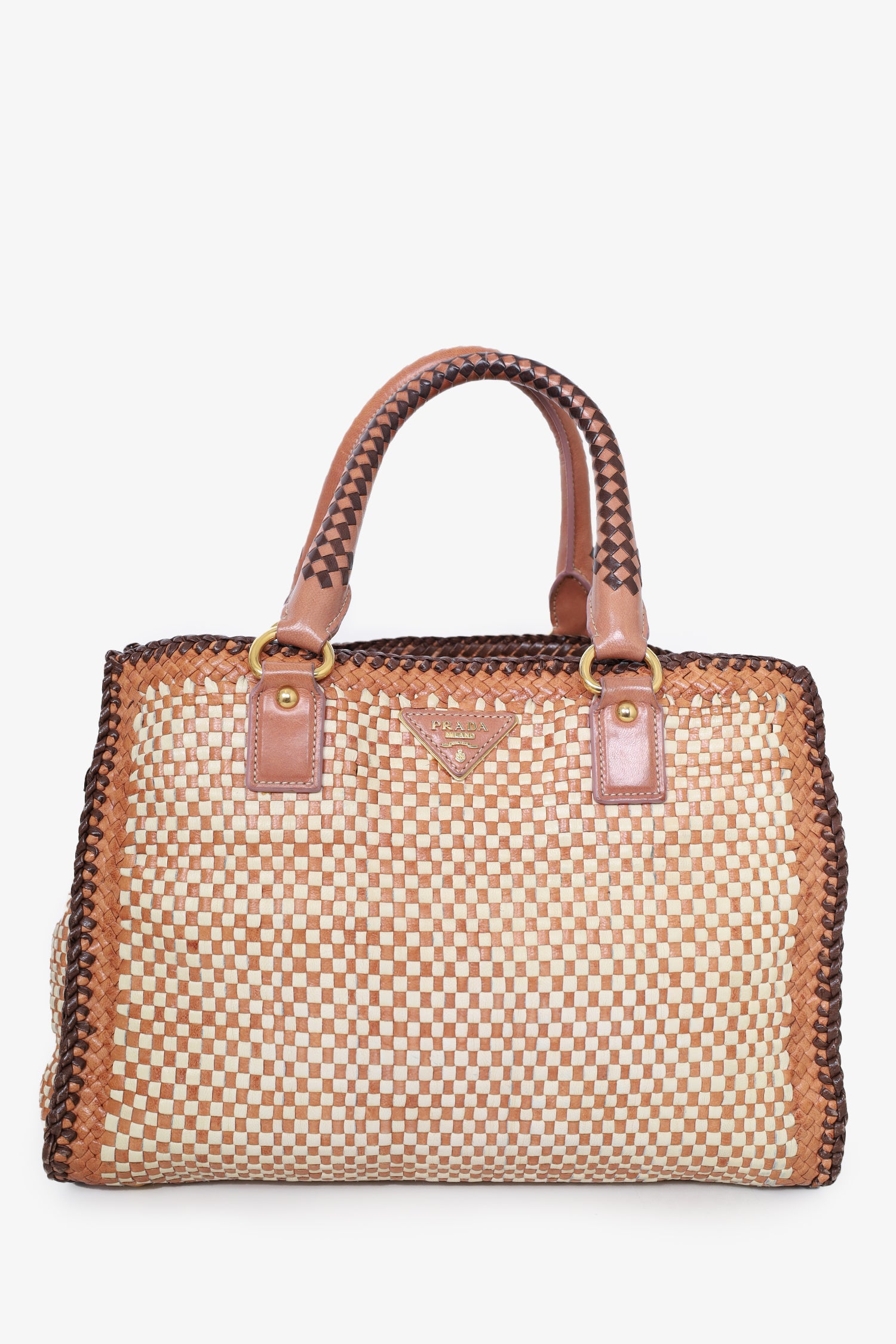 Refresh availabilityPrada Brown/Cream Woven Leather Madras Top Handle With Strap. Open top with push button closure. 2 interior wall pockets with zipper closure. Single wall slip pocket. Gold-tone hardware. Tonal stitching. Detachable cross body strap.