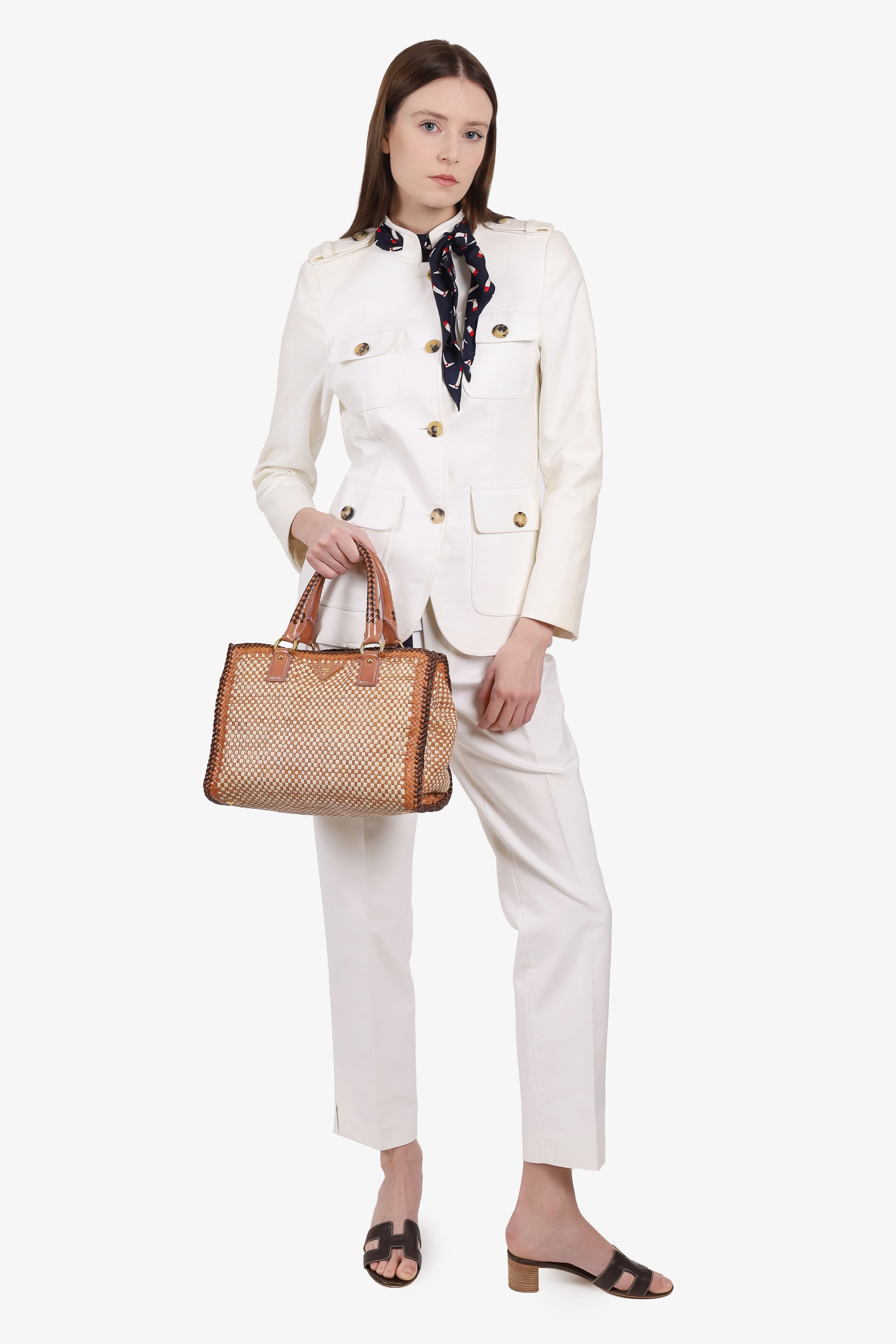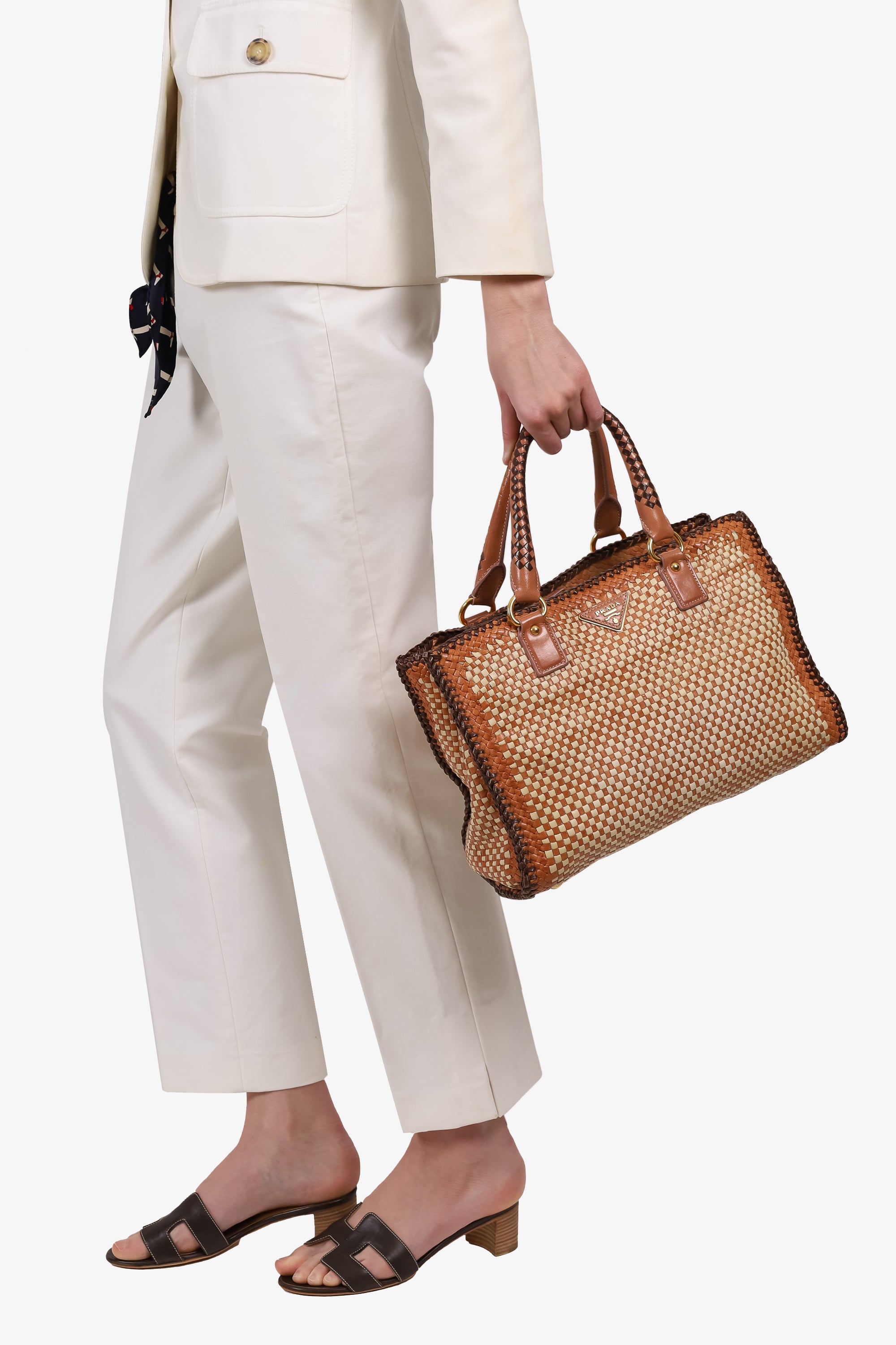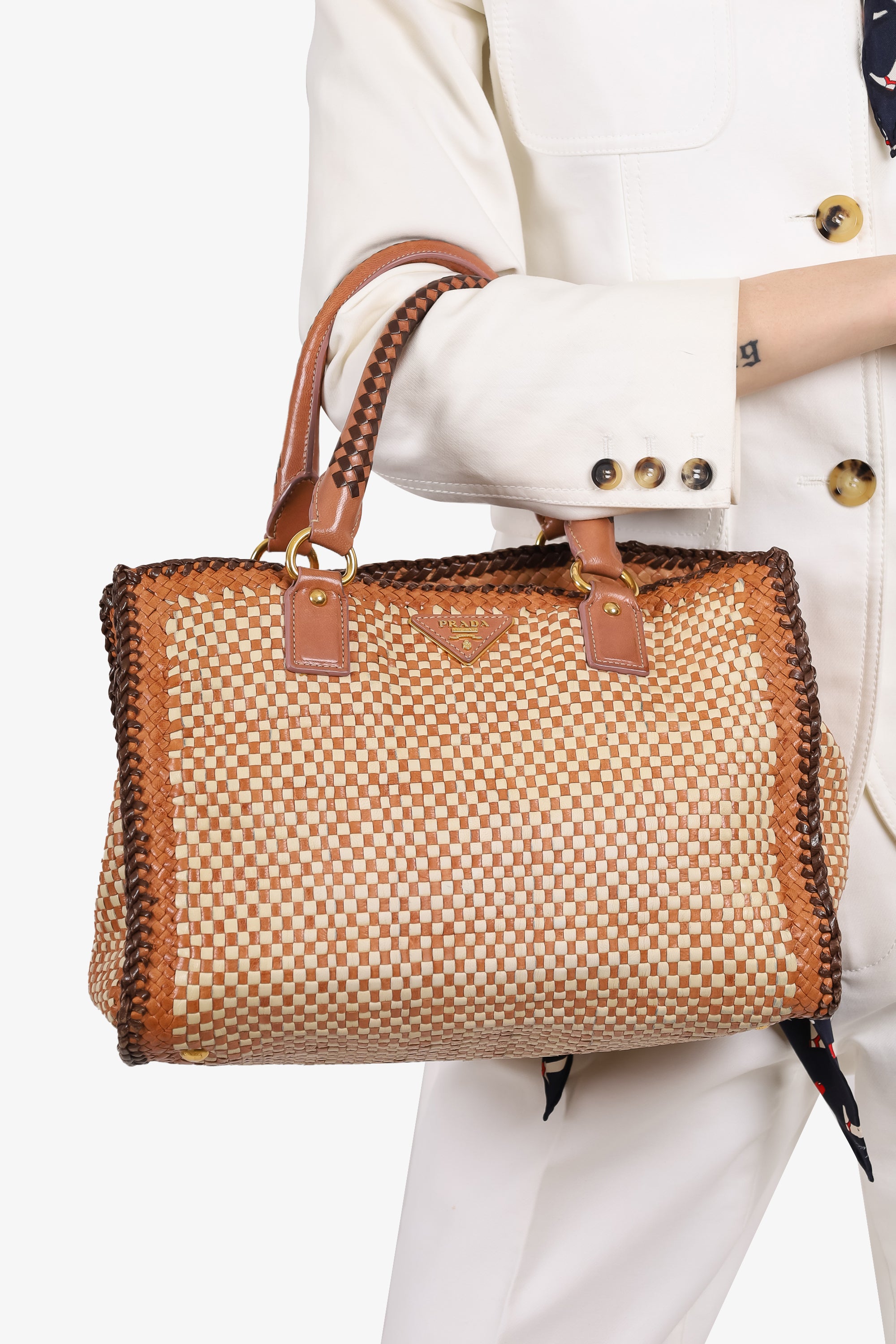Refresh availabilityPrada Brown/Cream Woven Leather Madras Top Handle With Strap. Open top with push button closure. 2 interior wall pockets with zipper closure. Single wall slip pocket. Gold-tone hardware. Tonal stitching. Detachable cross body strap.
