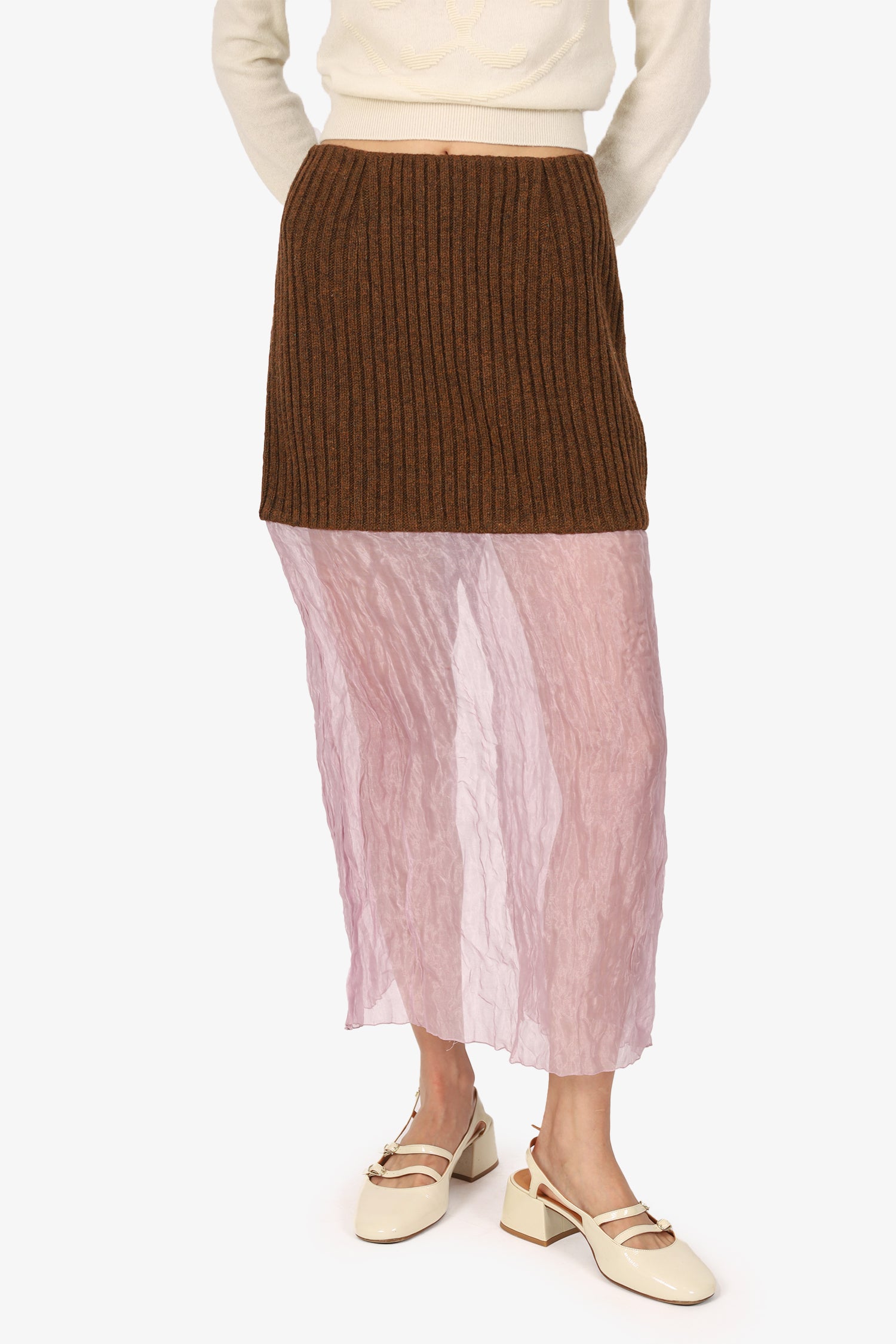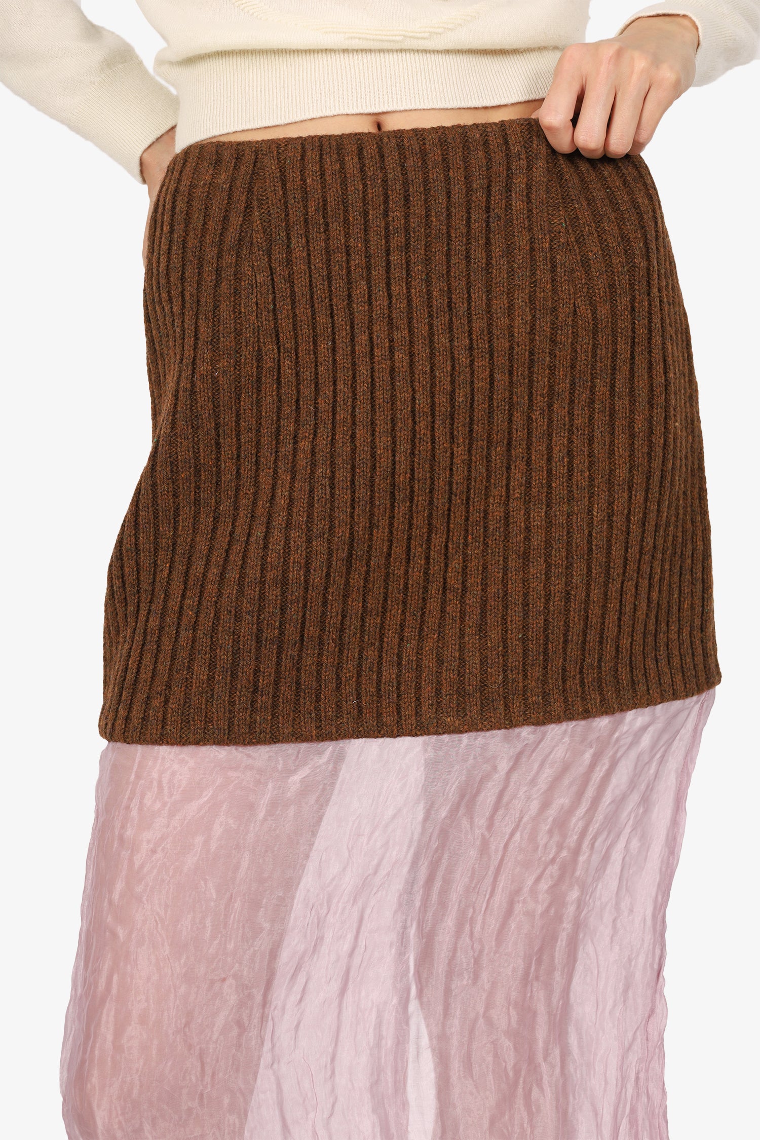 Refresh availabilityPrada Brown/Pink Contrast-panel Knit Sheered Midi Skirt. Slip-on. Side zip and hook closure. Bottom slit at sheer panel. Tonal stitching.