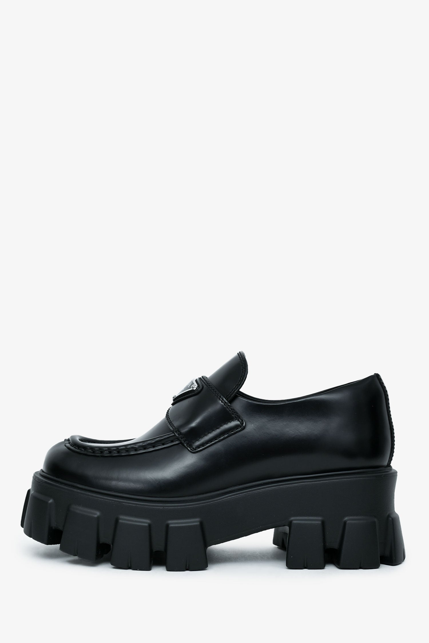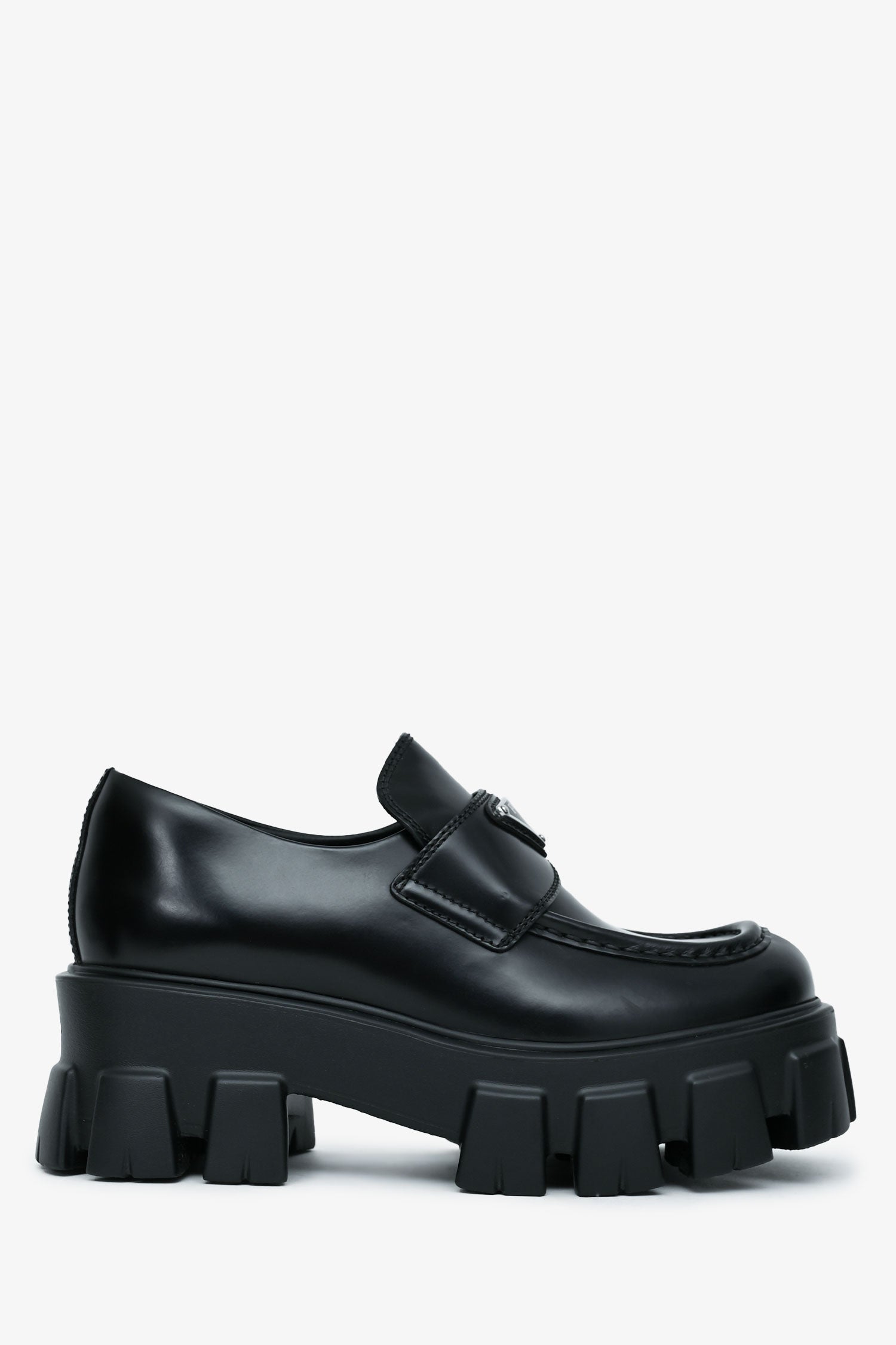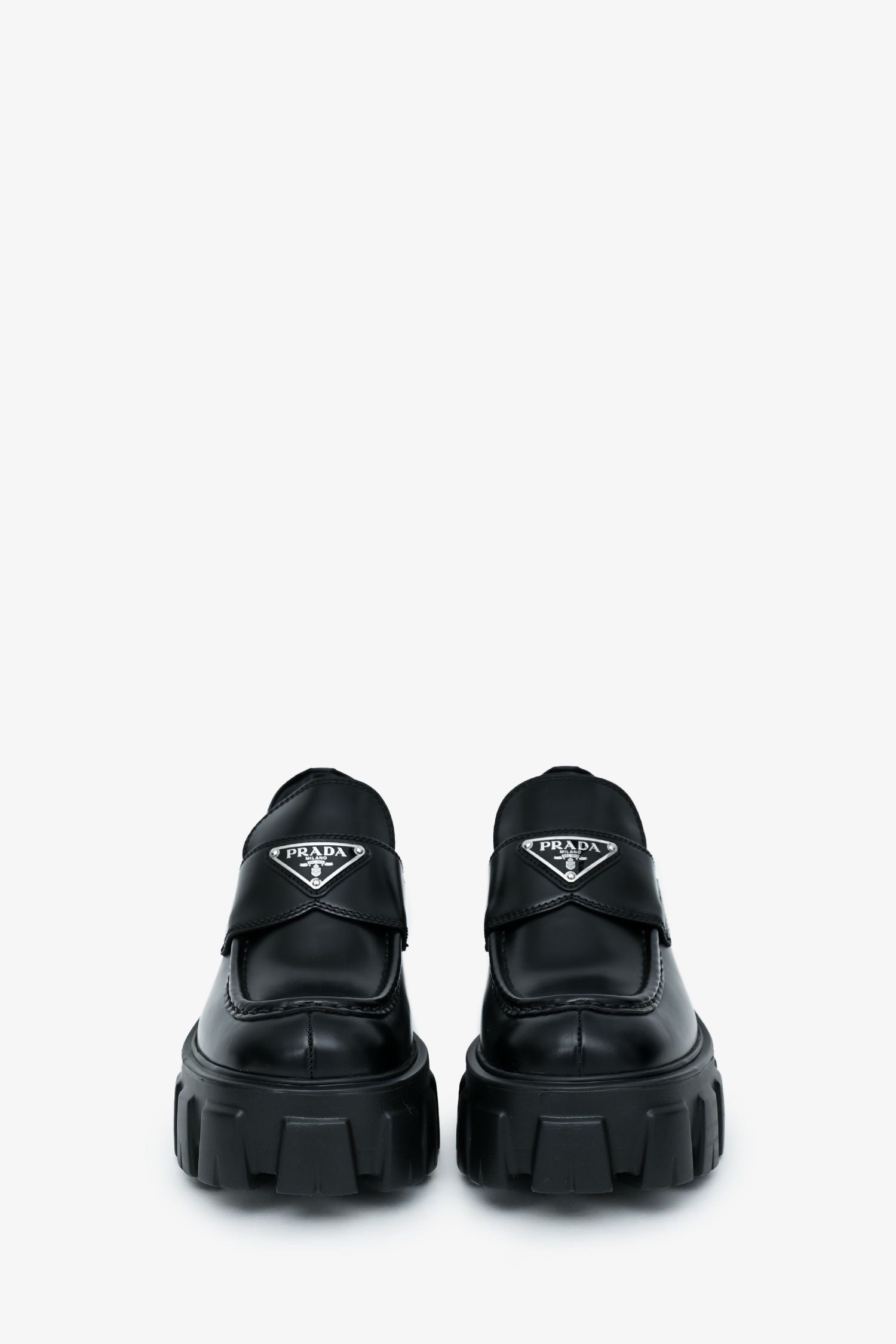 Refresh availabilityPrada Brushed Leather Extra Light Monolith Loafers. Slip-on. Silver-tone brand emblem detail at the upper.