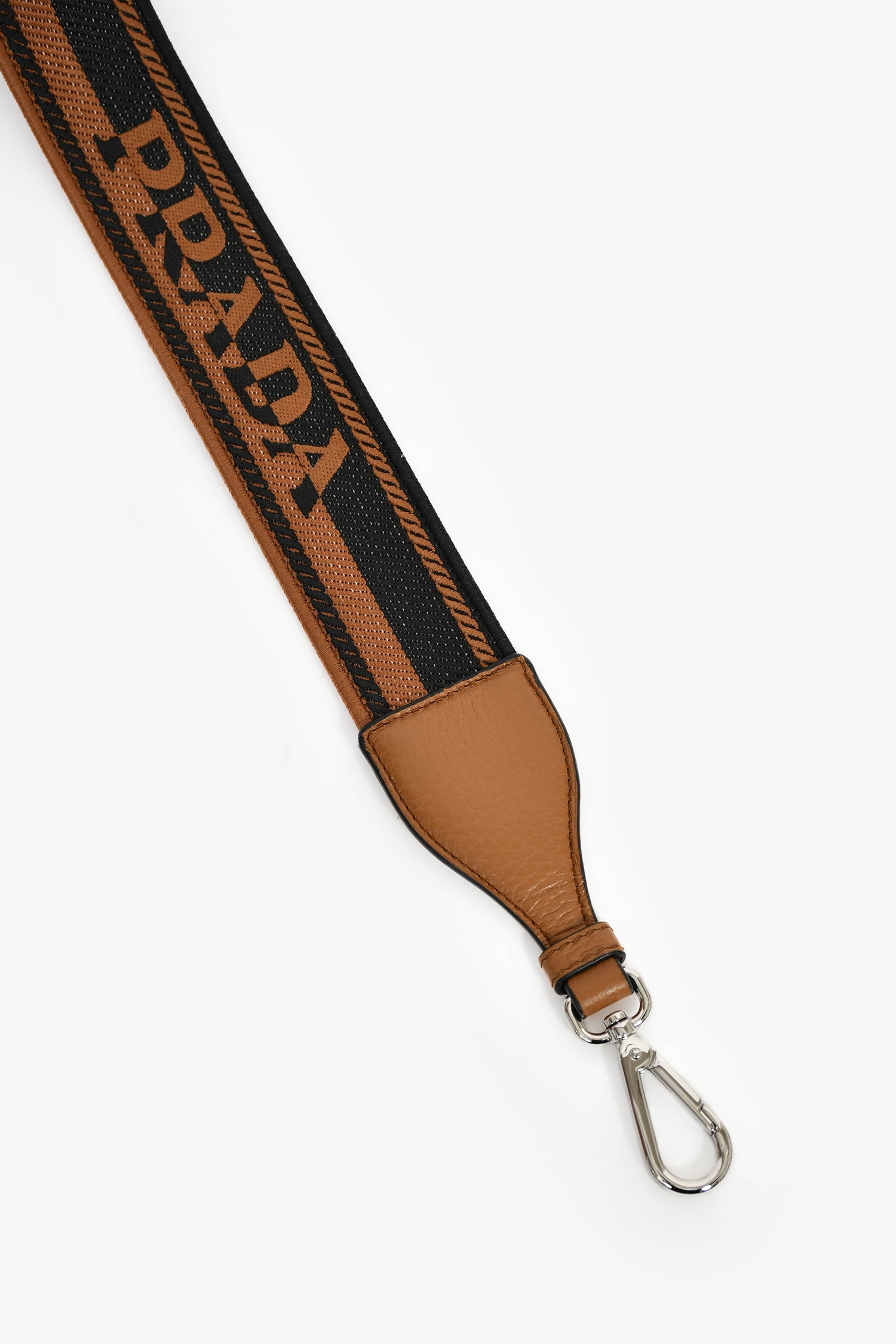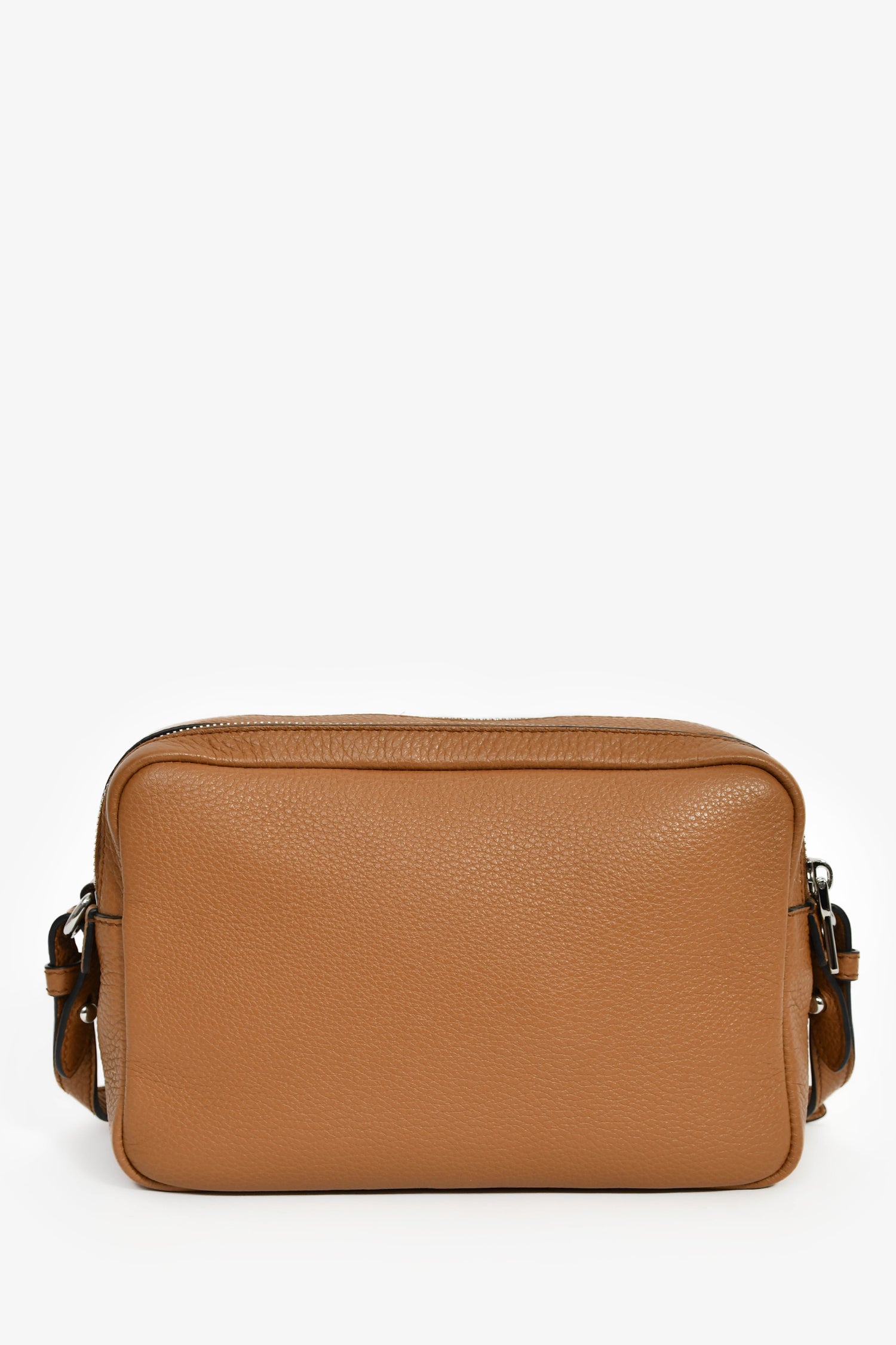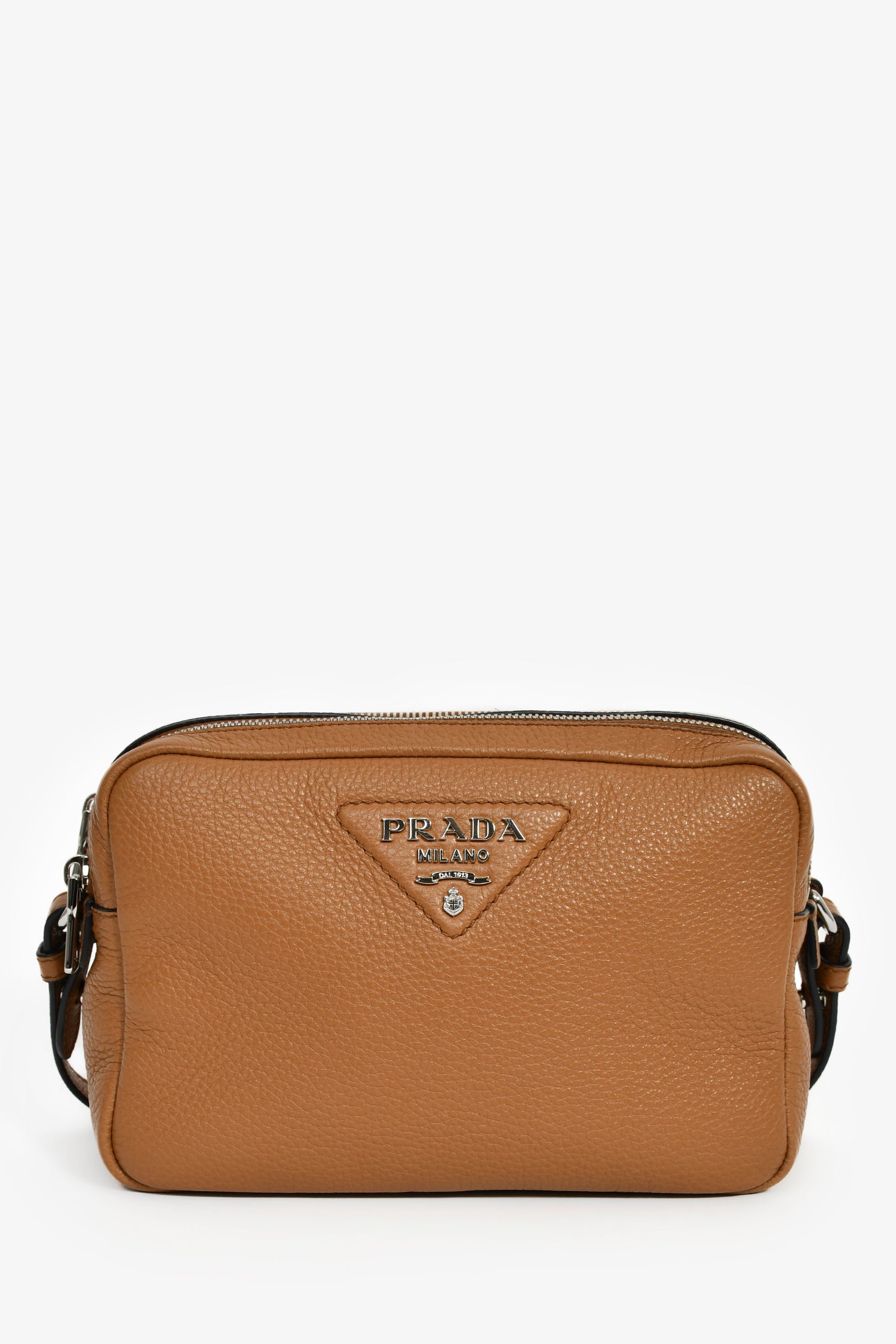Refresh availabilityPrada Caramel Leather 'Vitello Daino' Double Zip Crossbody Camera Bag. Dual top zip closure. Adjustable crossbody strap and webbed strap. Lined interiors with 1 slip pocket. Silver-tone hardware. Tonal stitching.