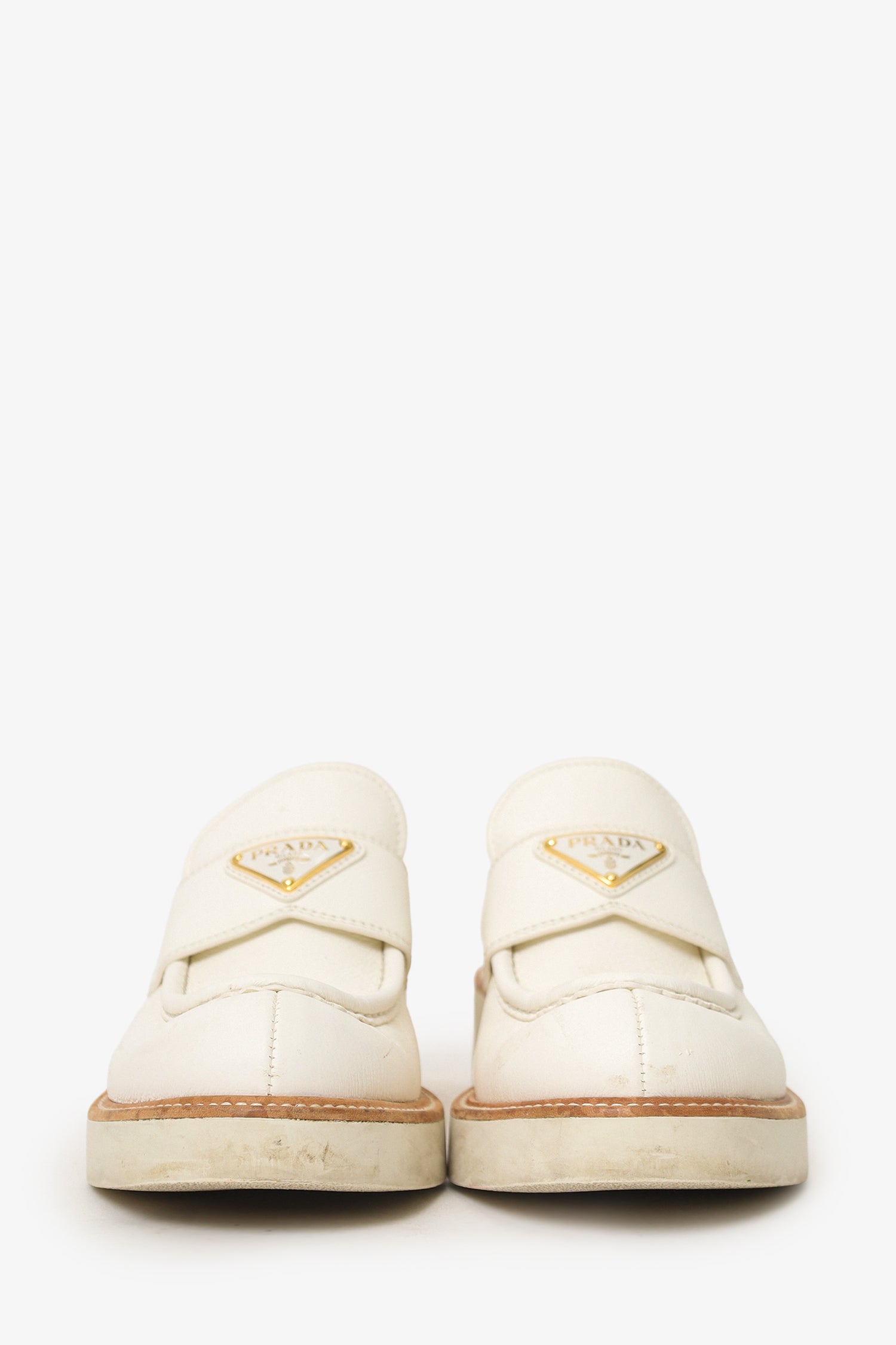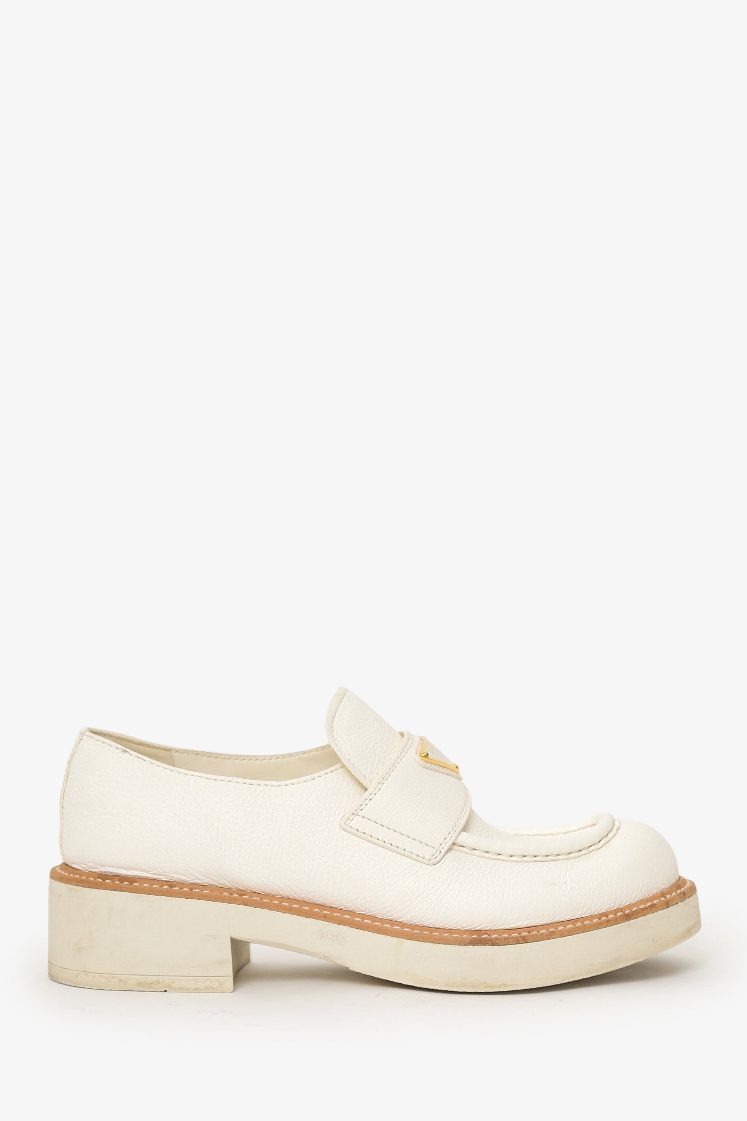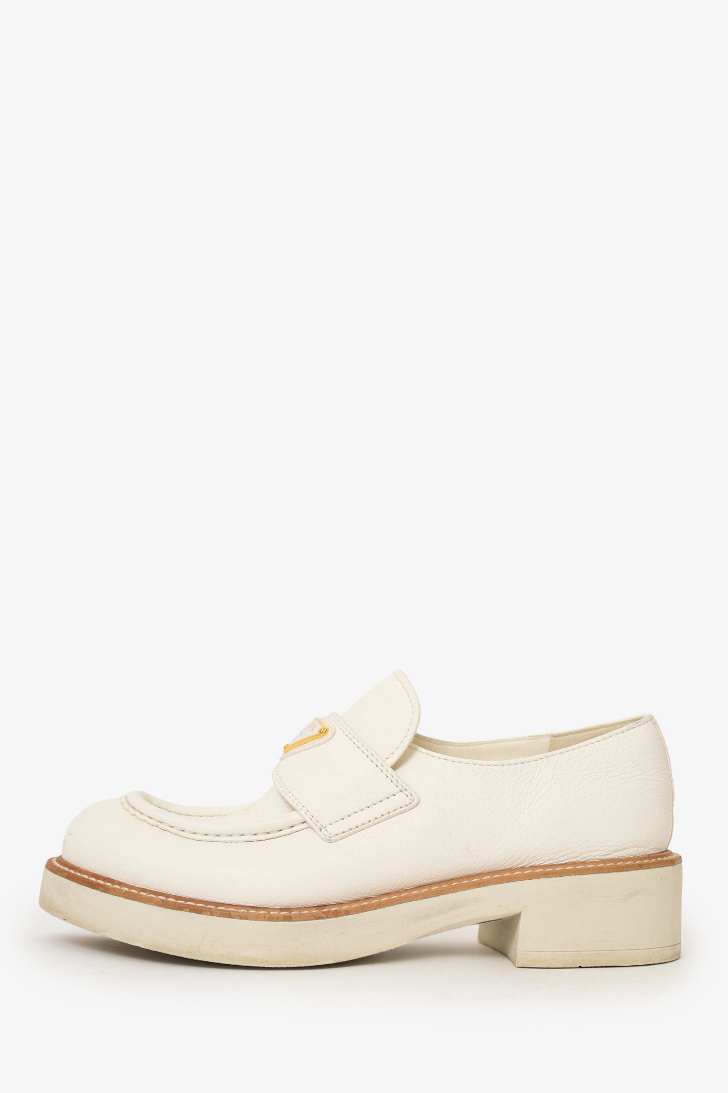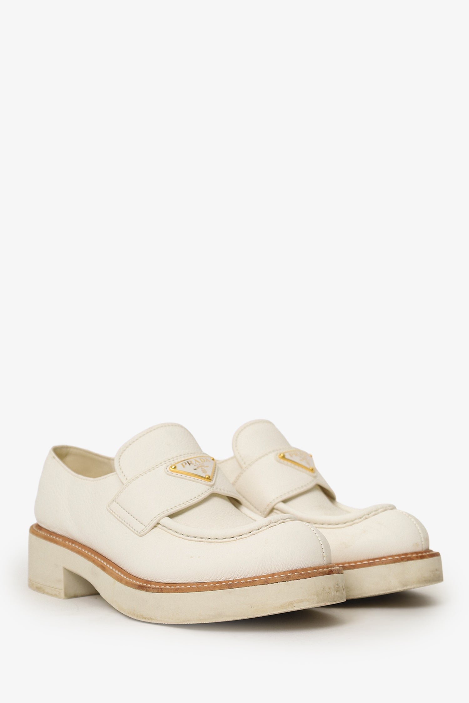 Refresh availabilityPrada Cream/Tan Brushed Leather Loafers. Slip-on. Round toe. Gold-tone hardware. Tonal and Contrast stitching.