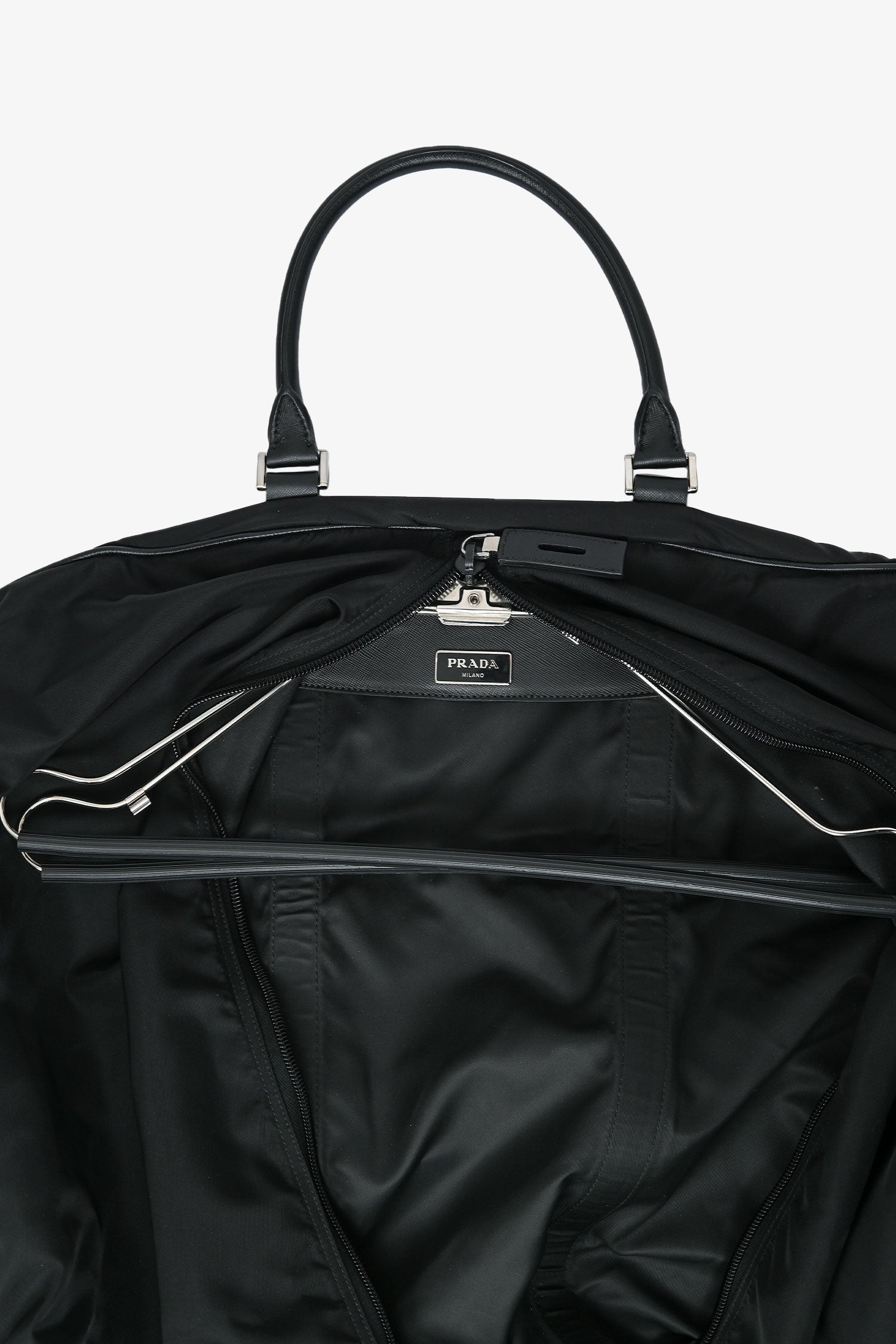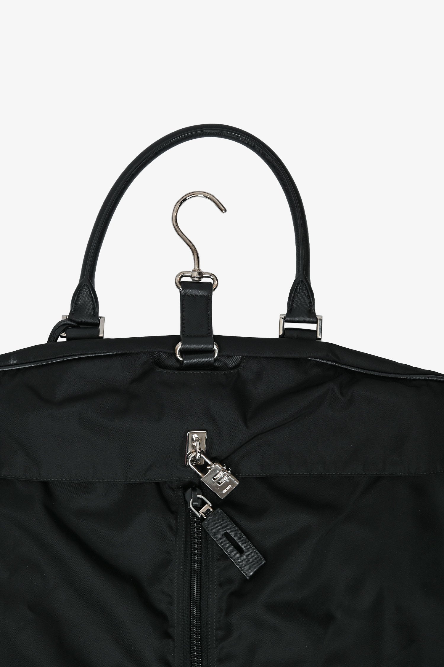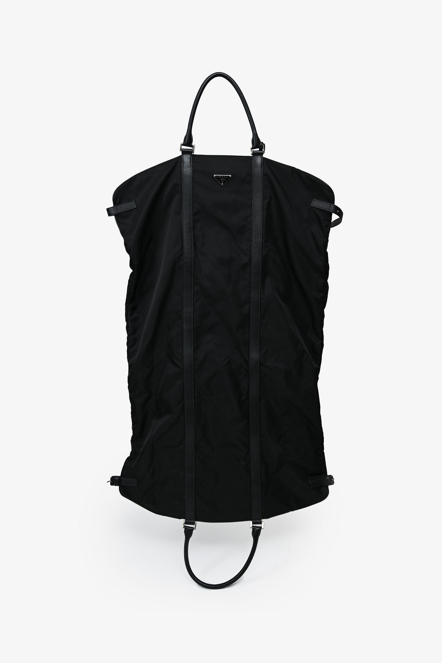 Refresh availabilityPrada Enameled Metal Triangle Garment Bag. Front zip closure. Upper fold-over flap with a lock. 2 rolled top handles. Side buckled closures. Silver-tone hardware. Tonal stitching. Inclusions: 2 silver-tone hangers, 1 luggage tag.