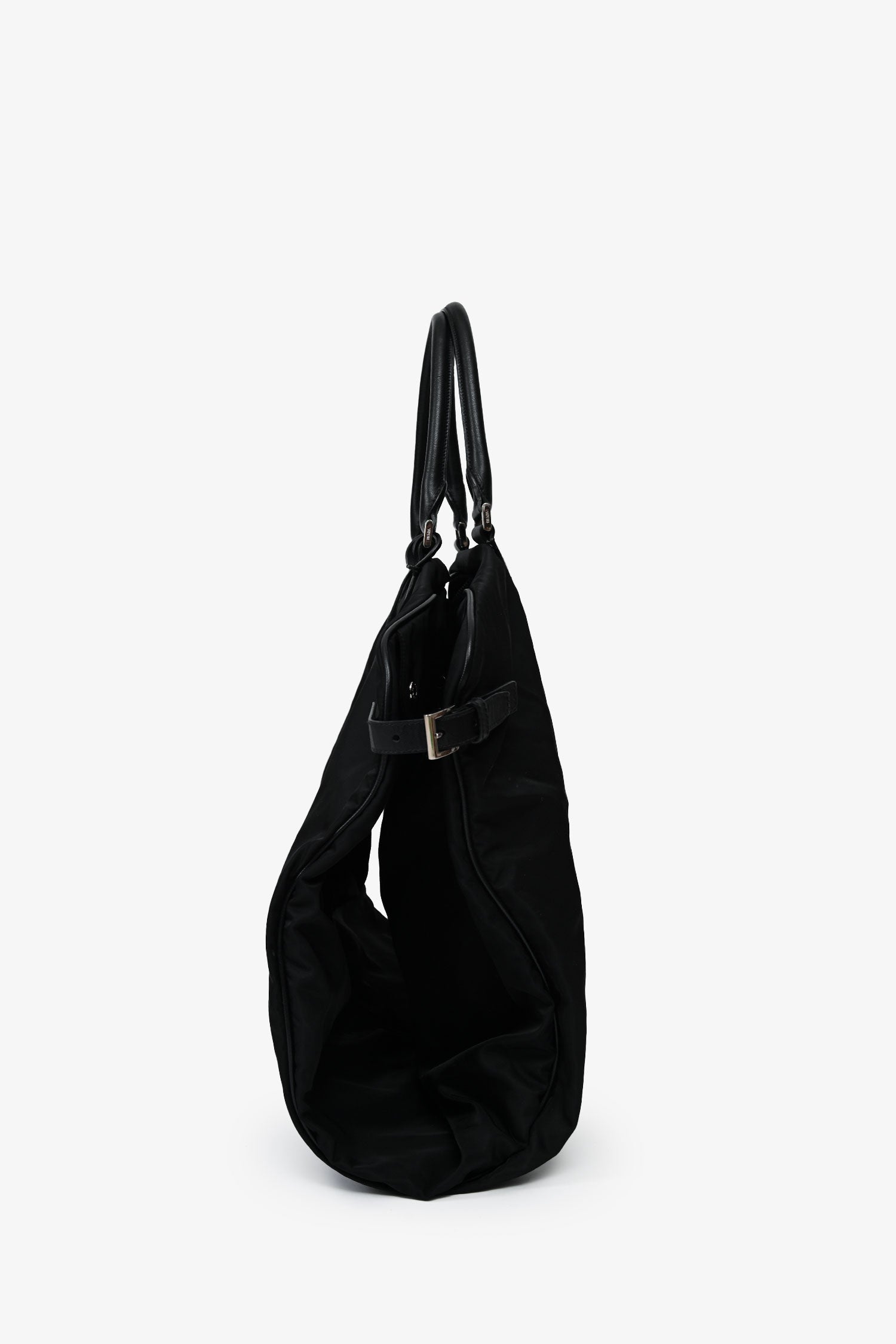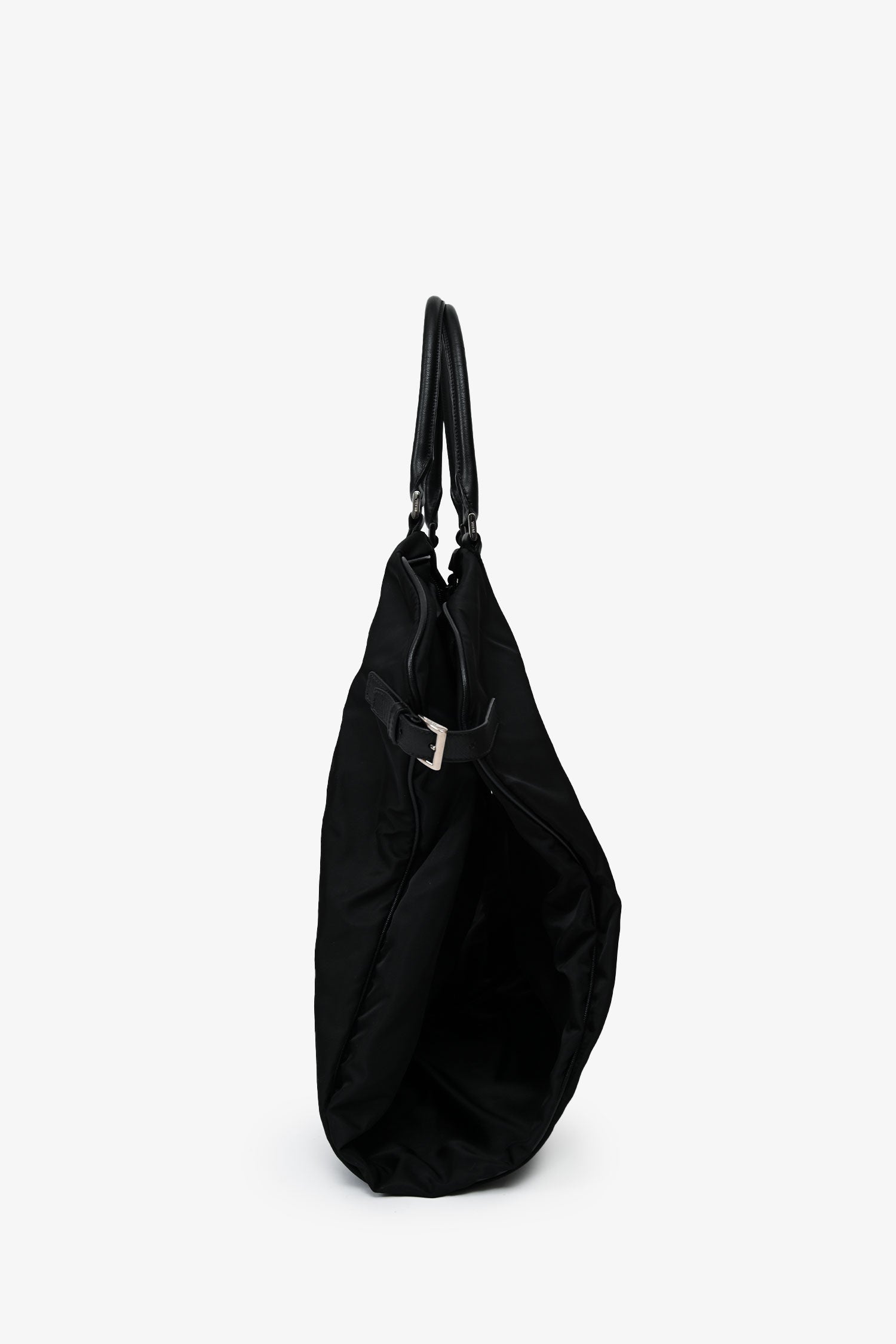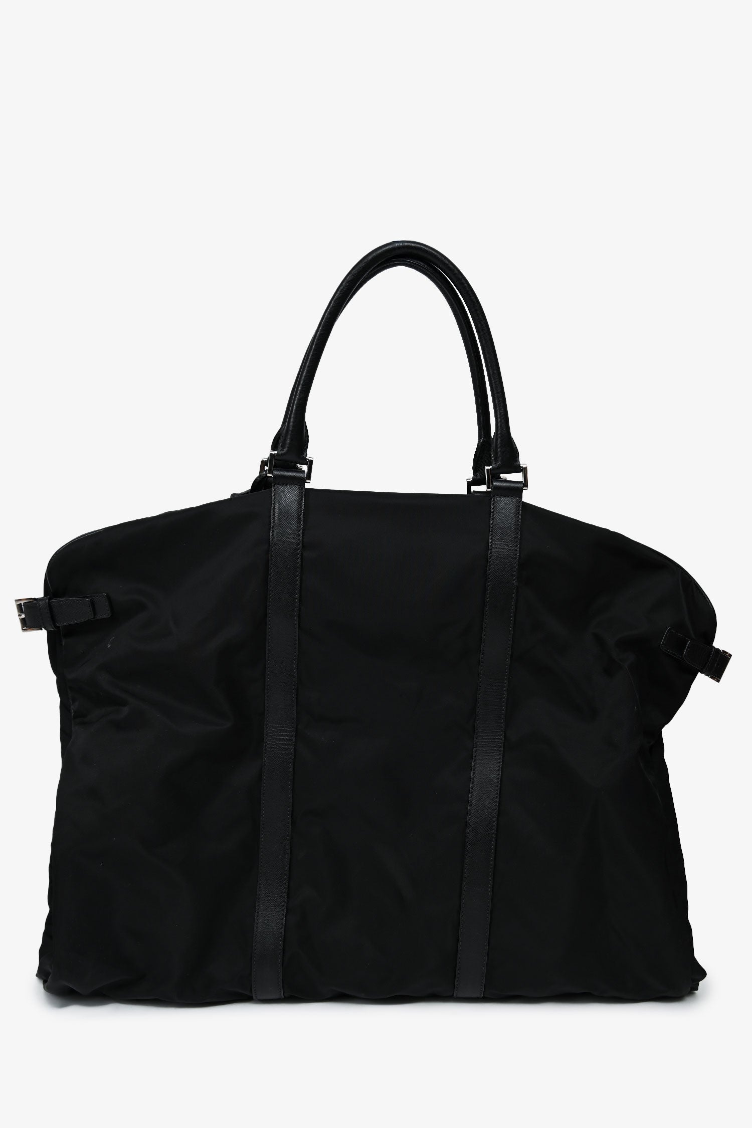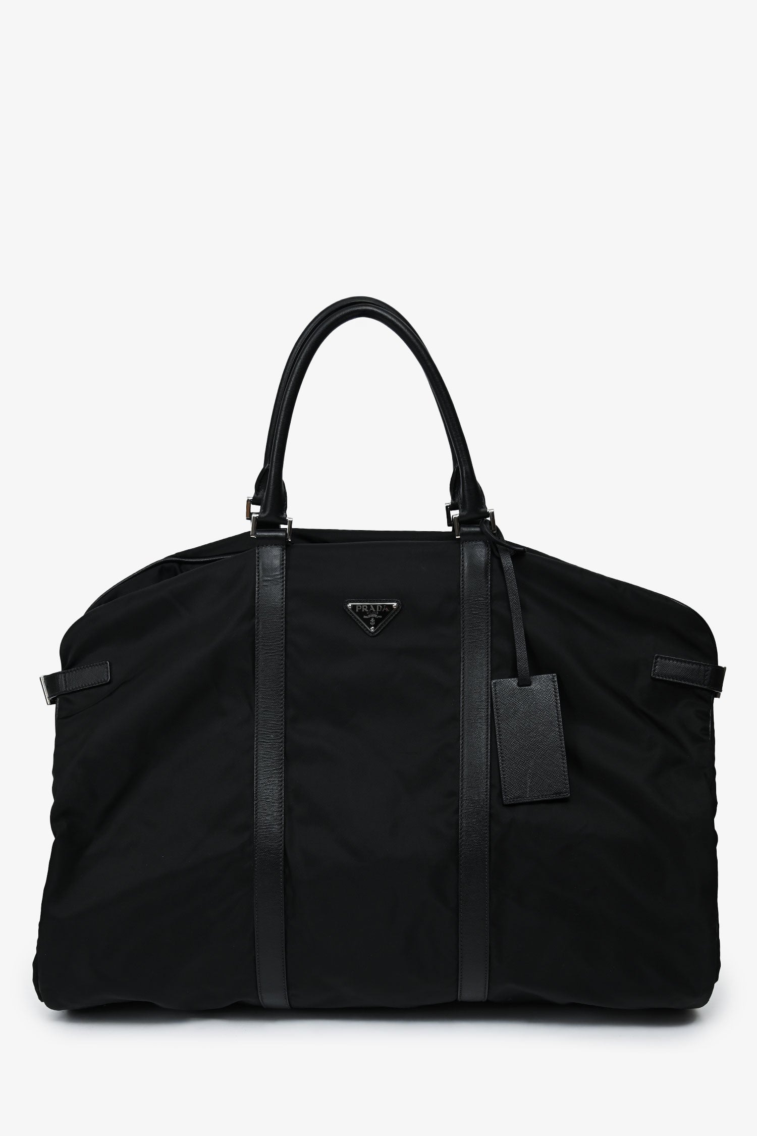 Refresh availabilityPrada Enameled Metal Triangle Garment Bag. Front zip closure. Upper fold-over flap with a lock. 2 rolled top handles. Side buckled closures. Silver-tone hardware. Tonal stitching. Inclusions: 2 silver-tone hangers, 1 luggage tag.
