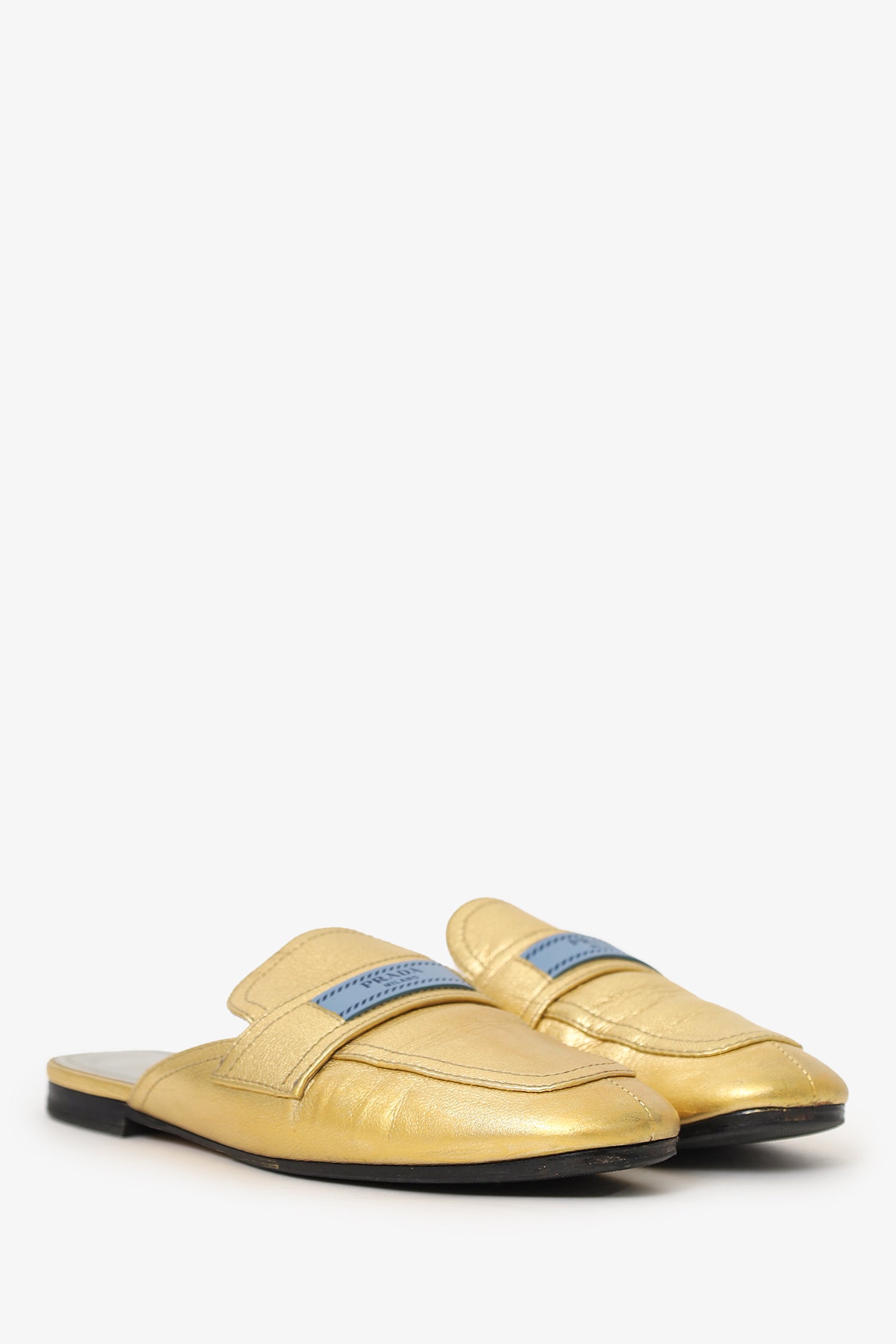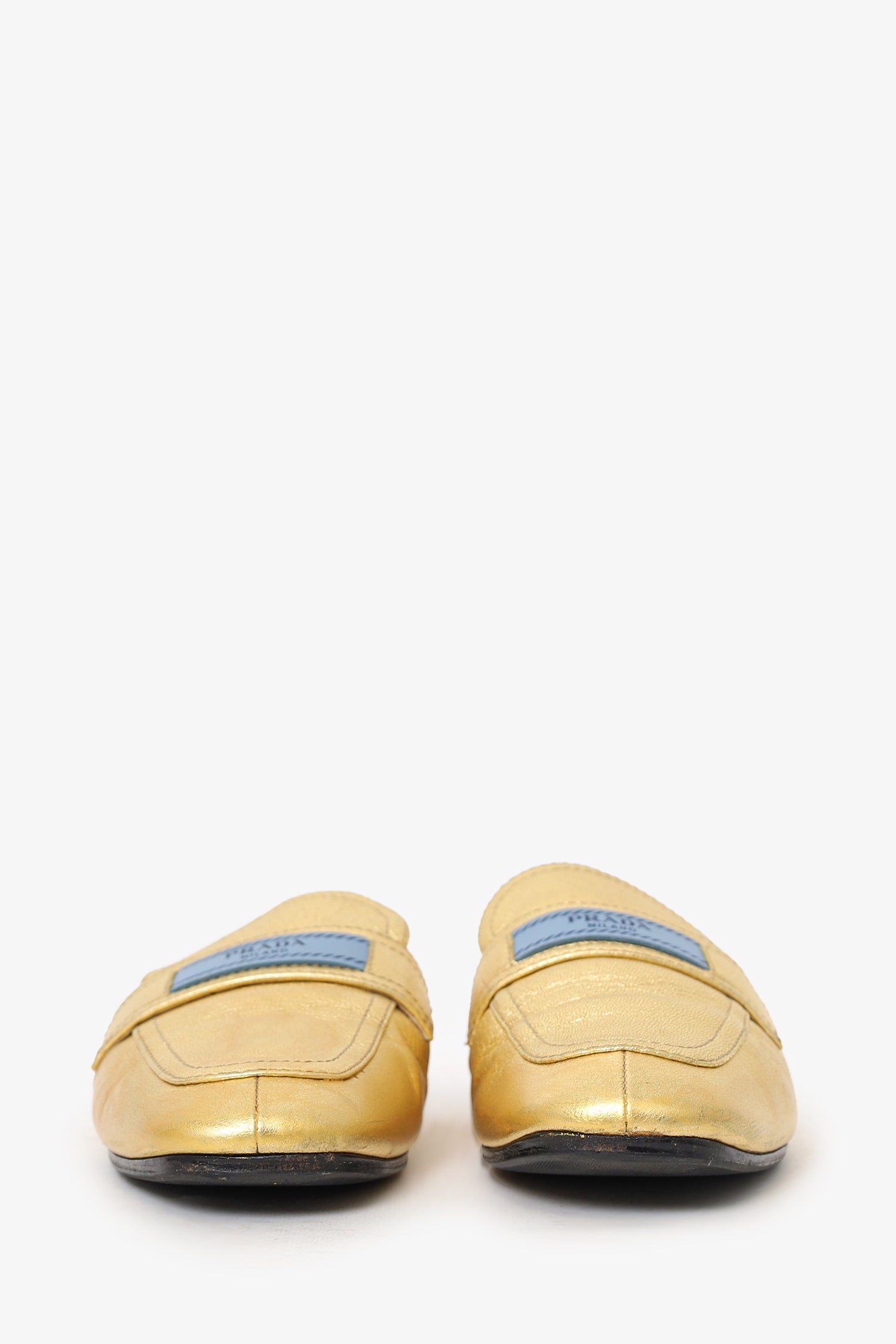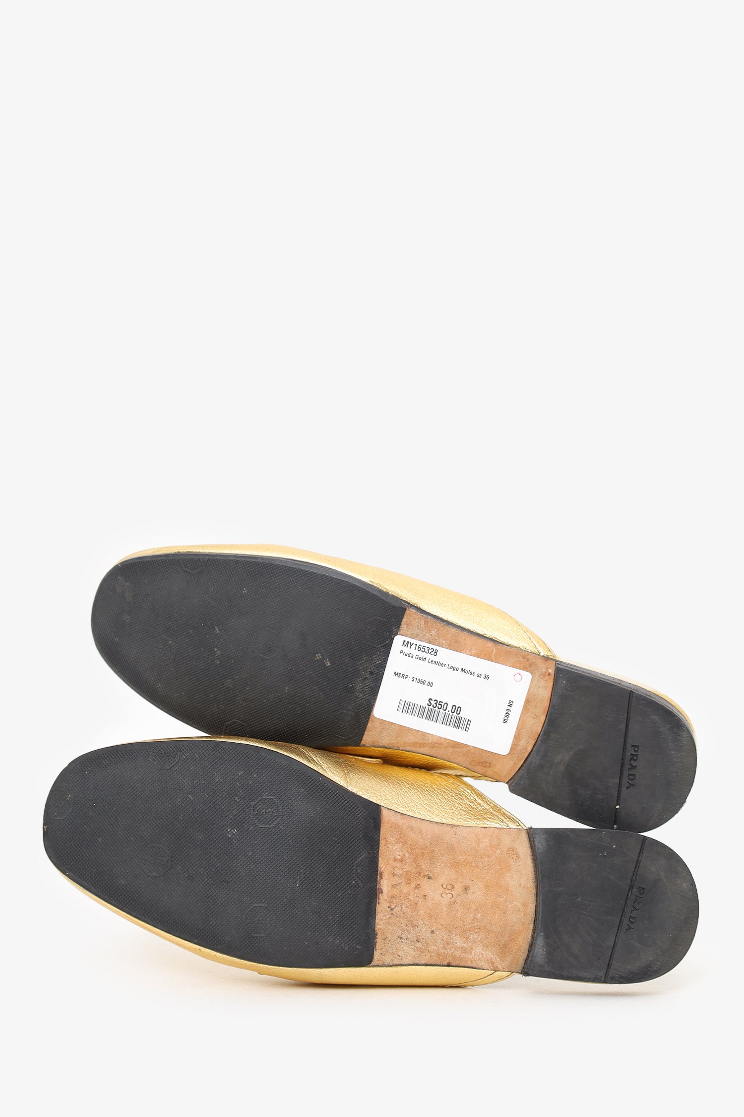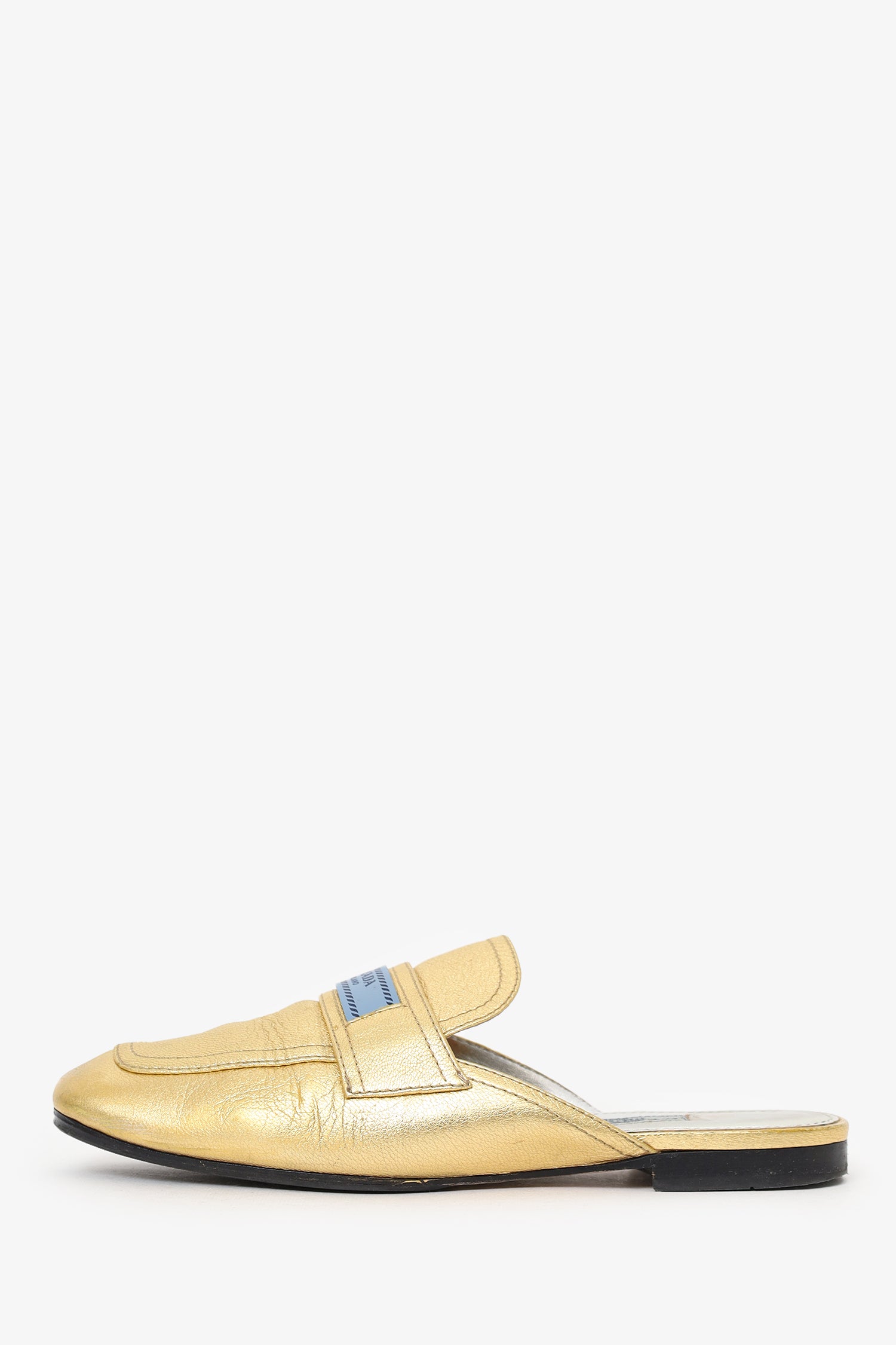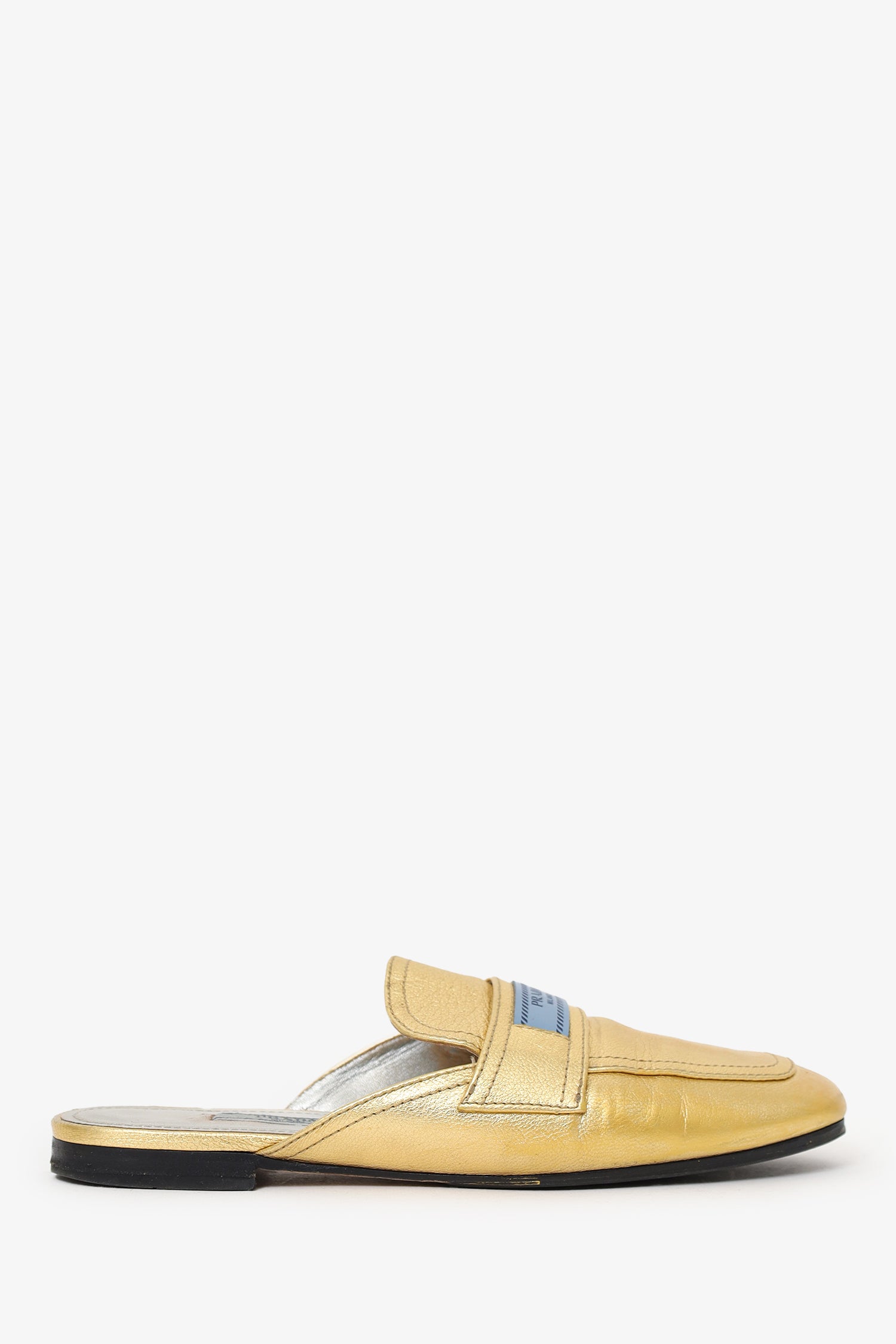Refresh availabilityPrada Gold Leather Logo Mules. Slip-on. Round-toe. Tonal stitching.