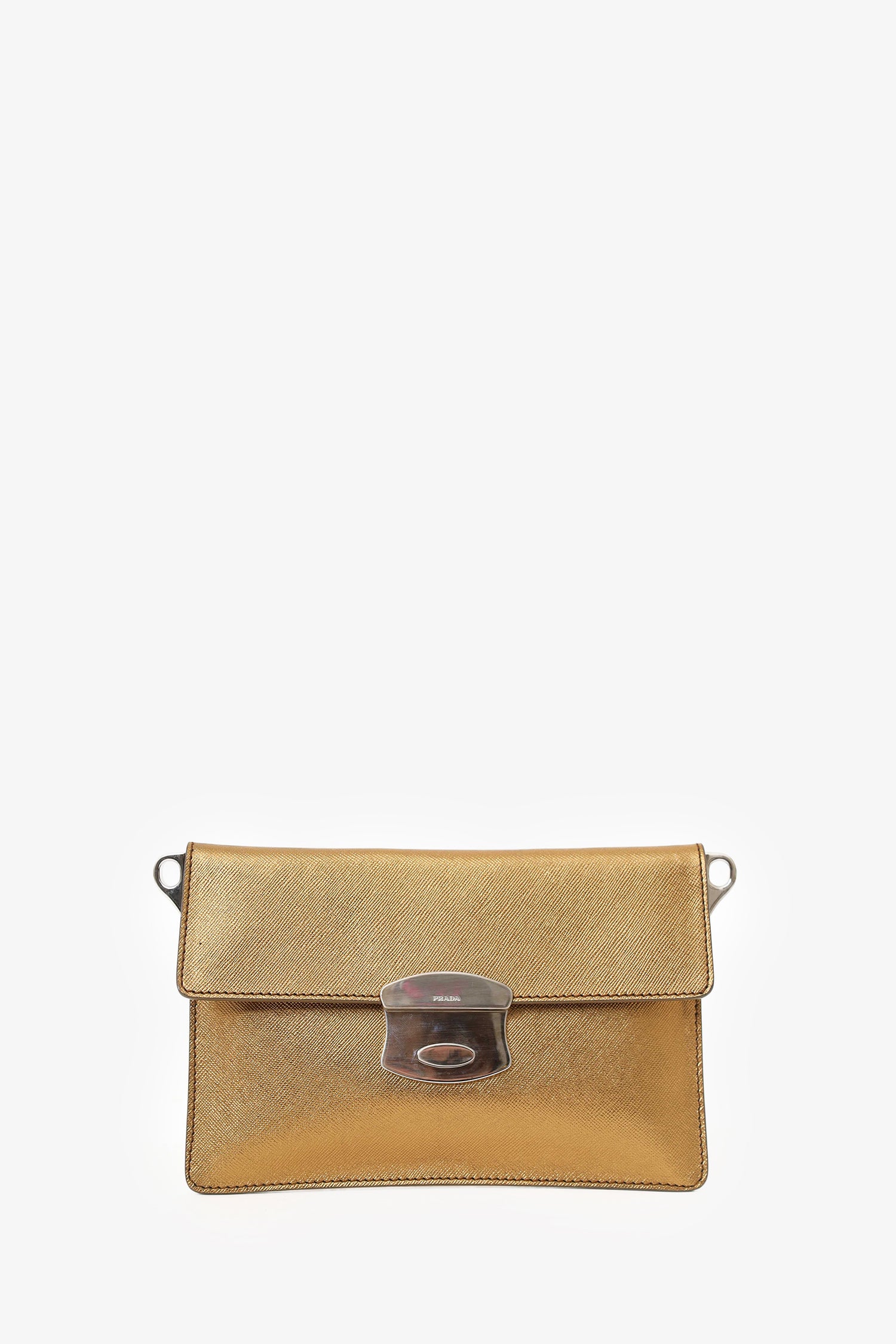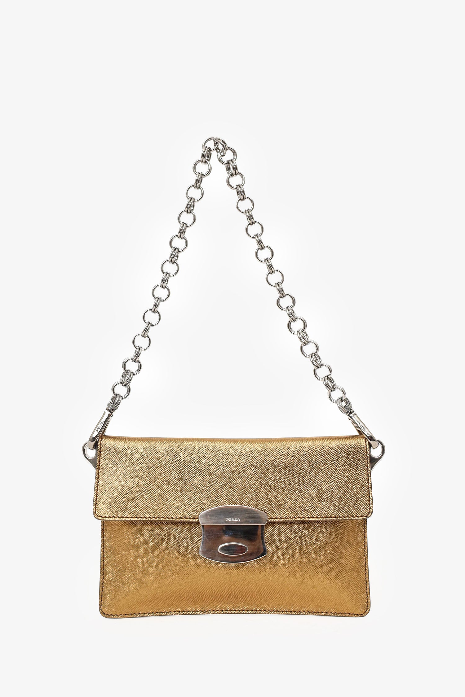 Refresh availabilityPrada Gold Saffiano Leather Shoulder Bag. Front fold-over flap with push-lock closure. Removable chainlink strap with lobster clasp closure. Lined interior. Silver-tone hardware. Tonal stitching.