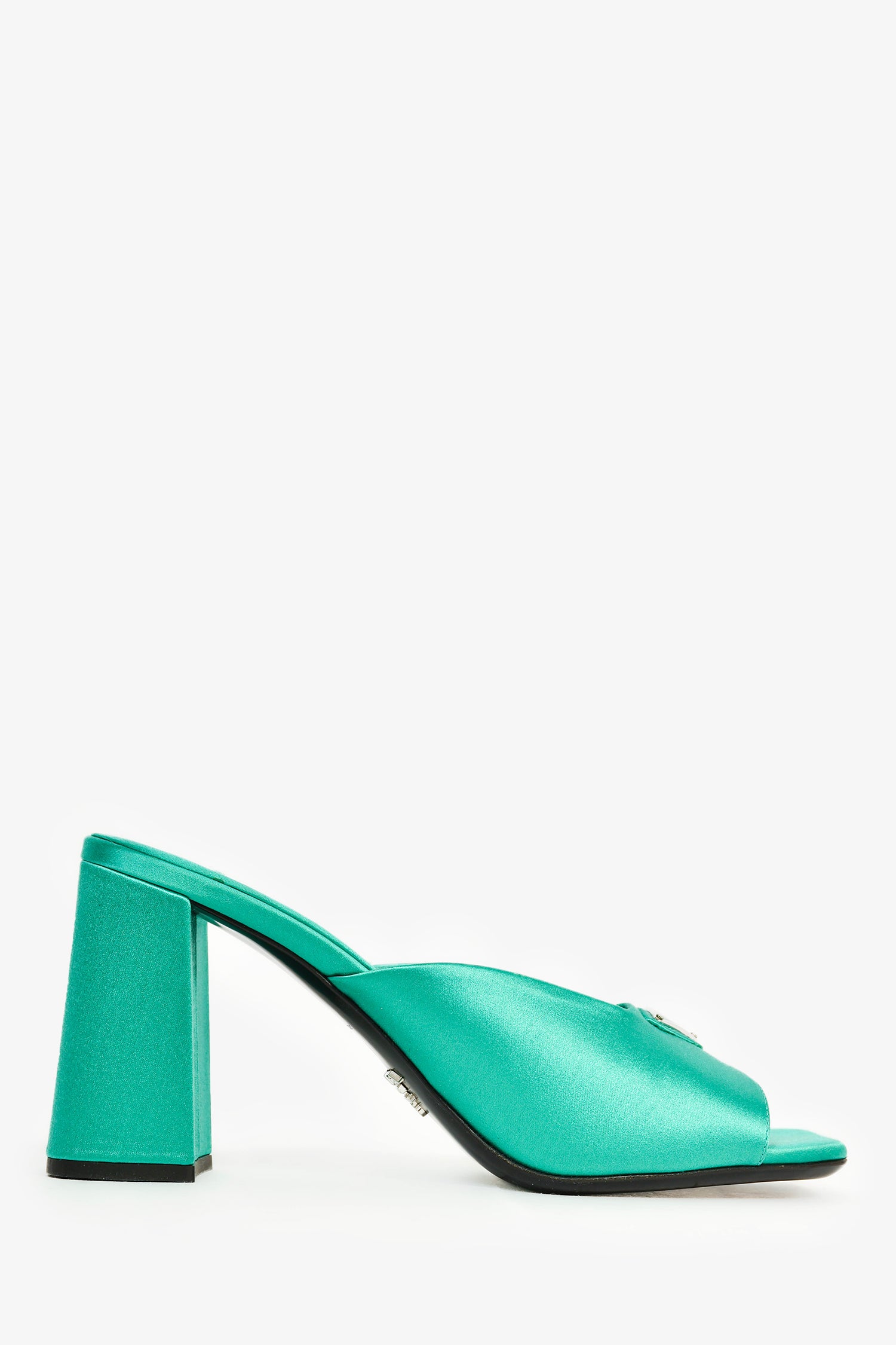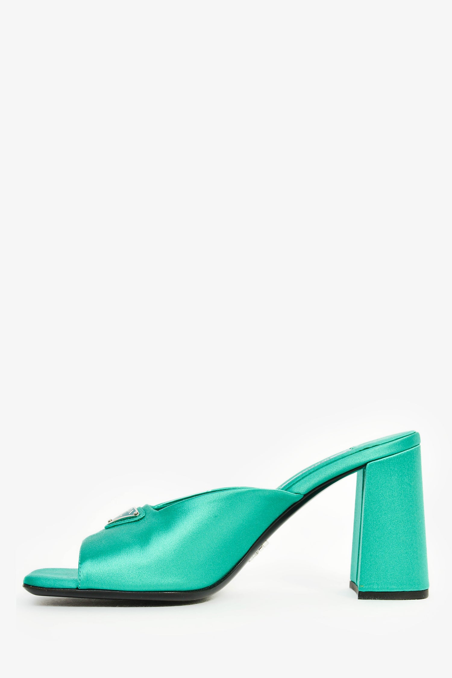 Refresh availabilityPrada Green Satin Triangle Heeled Mules. Slip-on. Satin. Top strap. Metallic hardware. Tonal stitching.