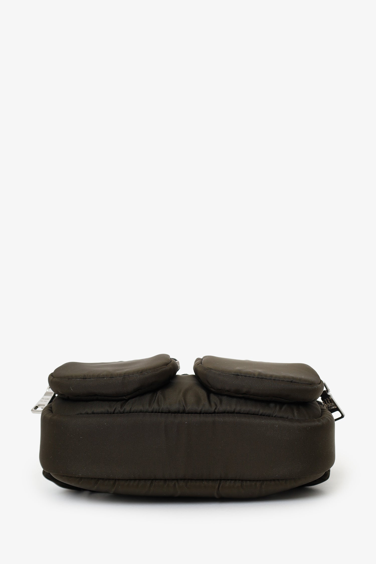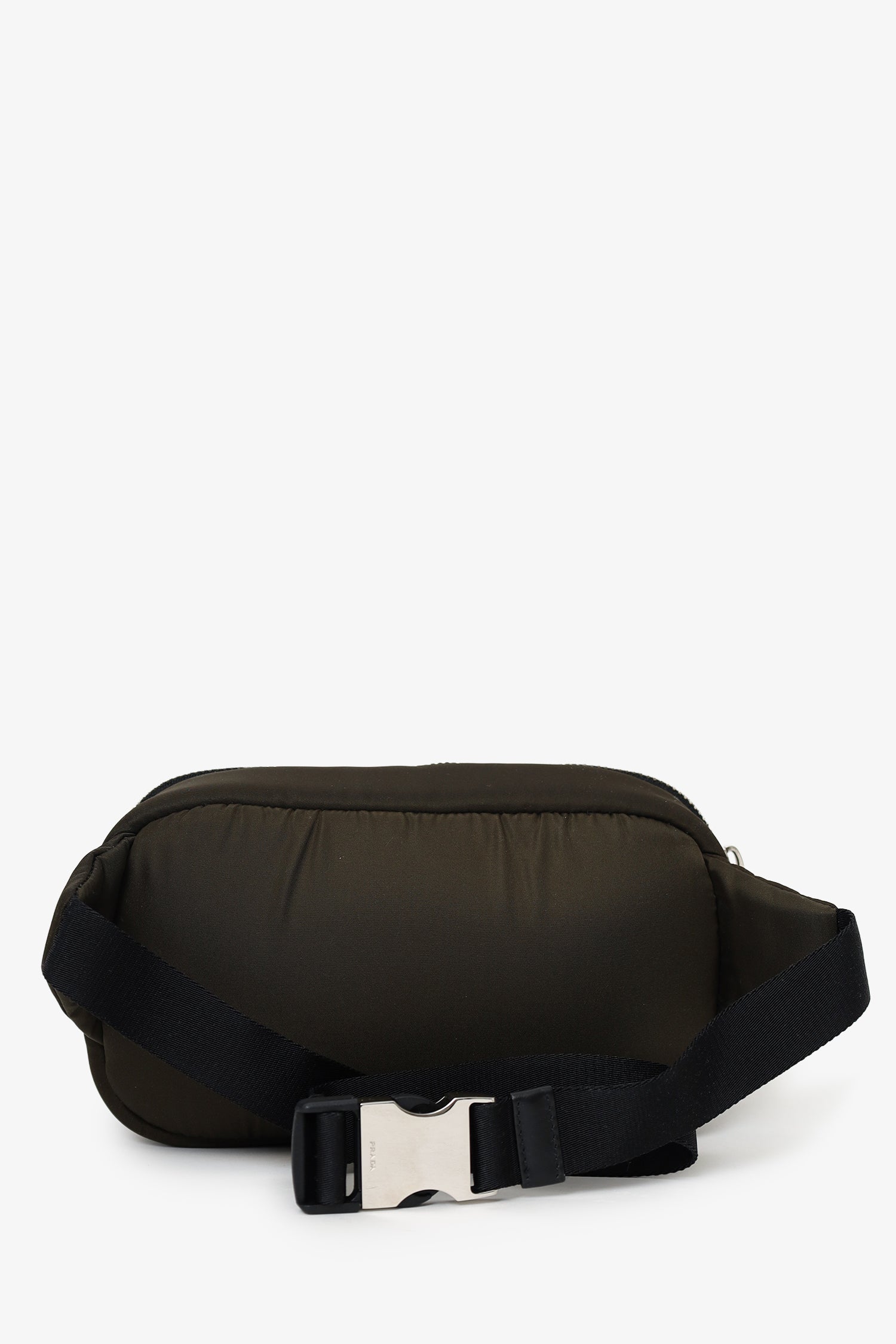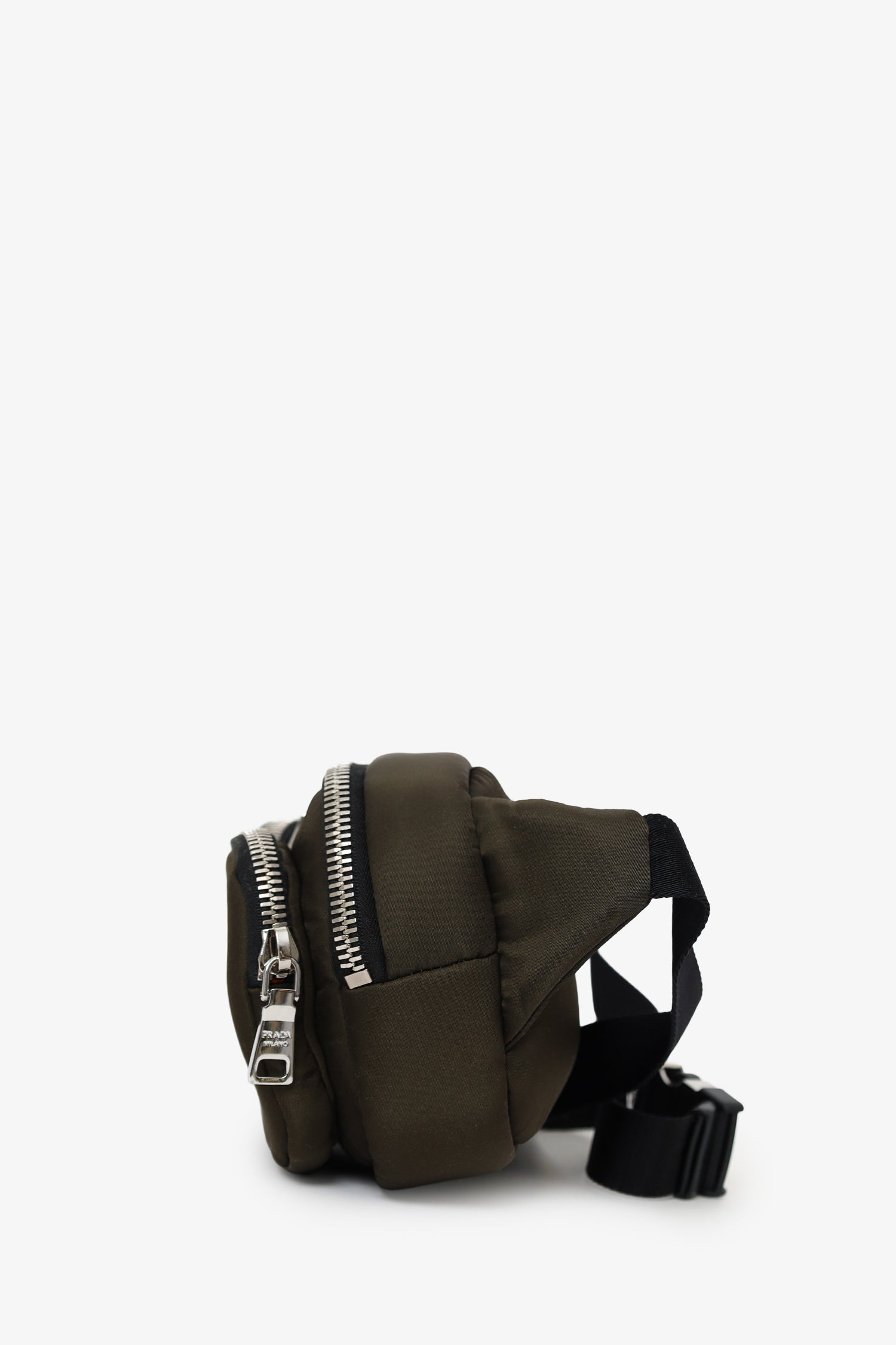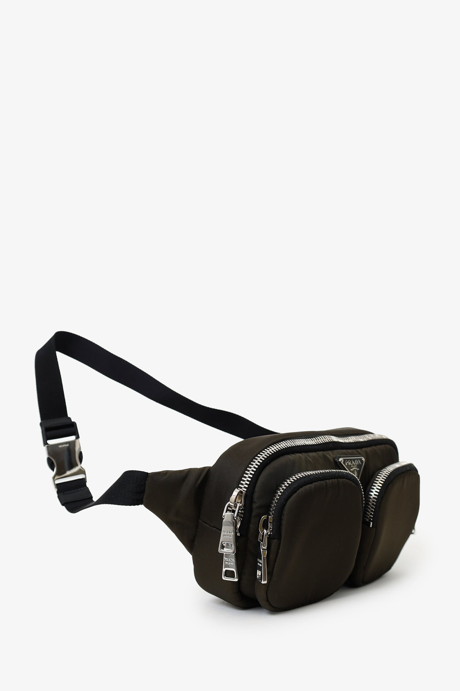 Refresh availabilityPrada Green/Black Nylon Front Pocket Waist Bag. 2-way top-zip closure. Adjustable rear buckle-up closure. 2 exterior front zip-up pockets. Lined interior with single rear slip pocket. Silver-tone hardware. Tonal stitching.