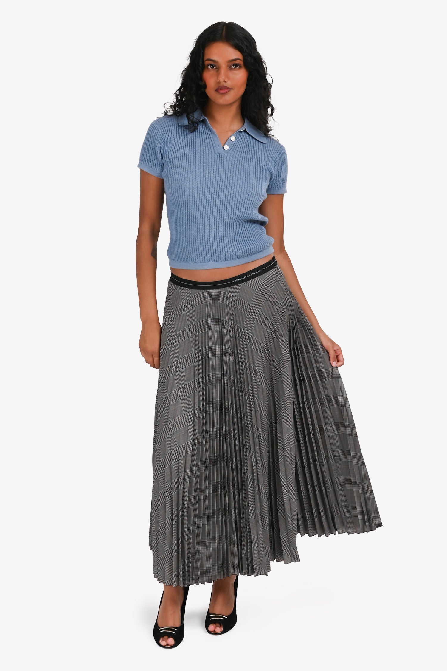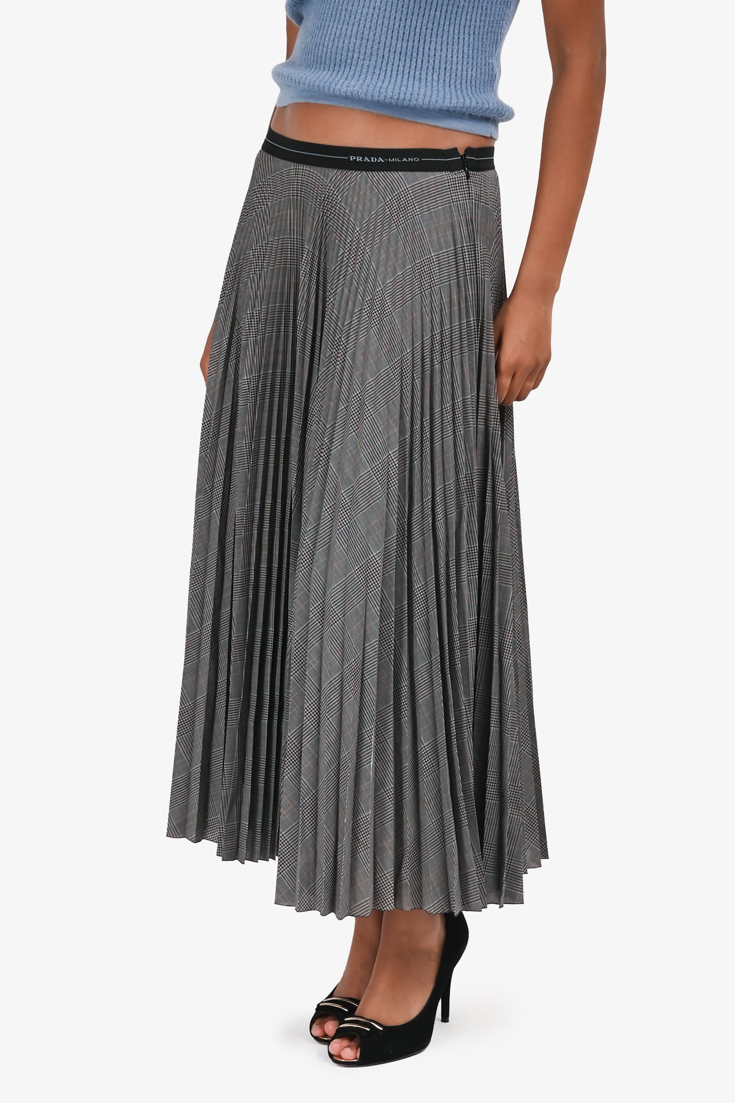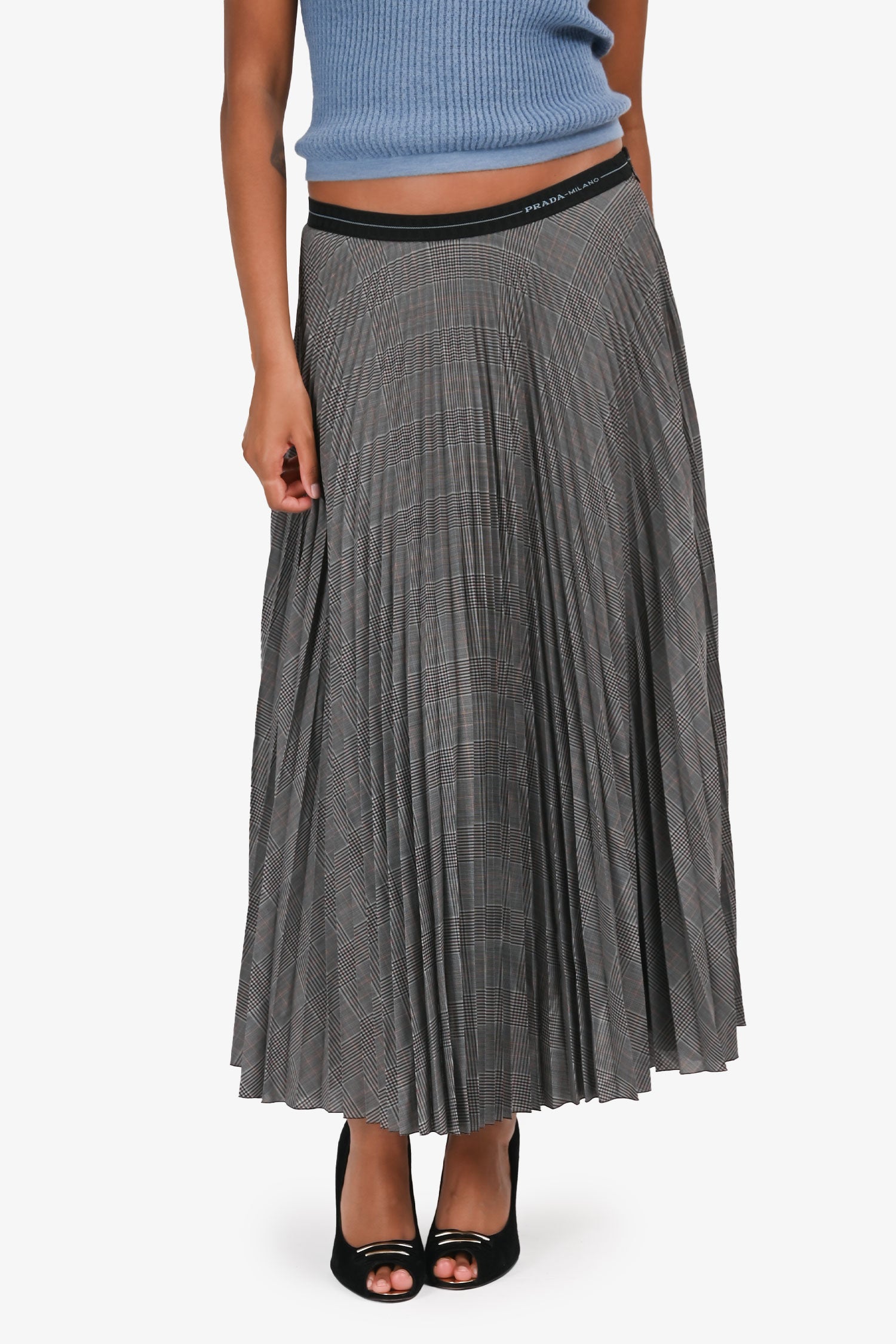 Refresh availabilityPrada Grey Plaid Pleated Logo Detail Skirt. Sharp pleating throughout. Side zip closure. Tonal stitching.